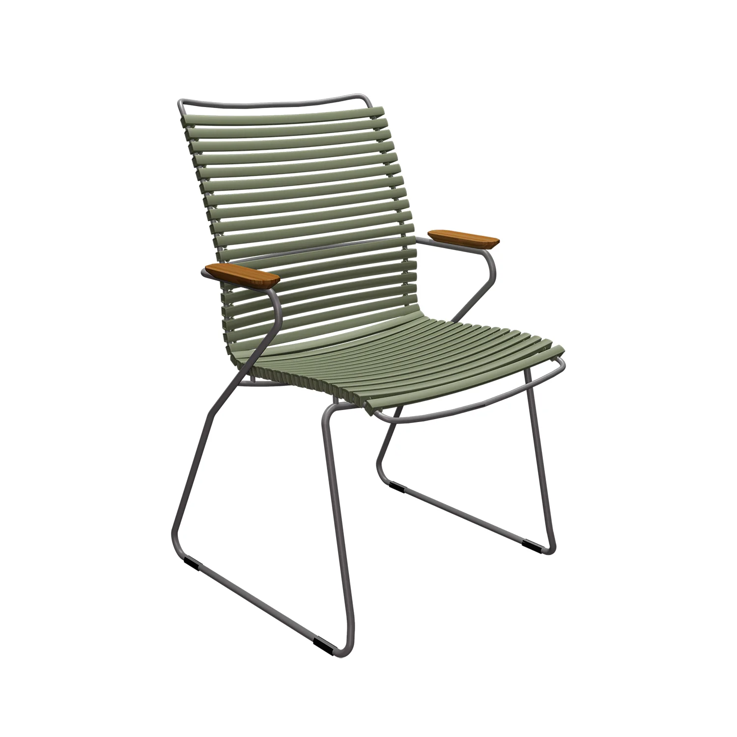 Click karmstol är tillverkat av ett pulverlackerat stålstativ med enkla, ergonomiskt väl genomtänkta plastlameller. Lamellerna går lätt att plocka av och ersätta med nya i andra färger, på så sätt kan du skapa dig en helt unik stol. Här visas stolen i färgen olivgrön.