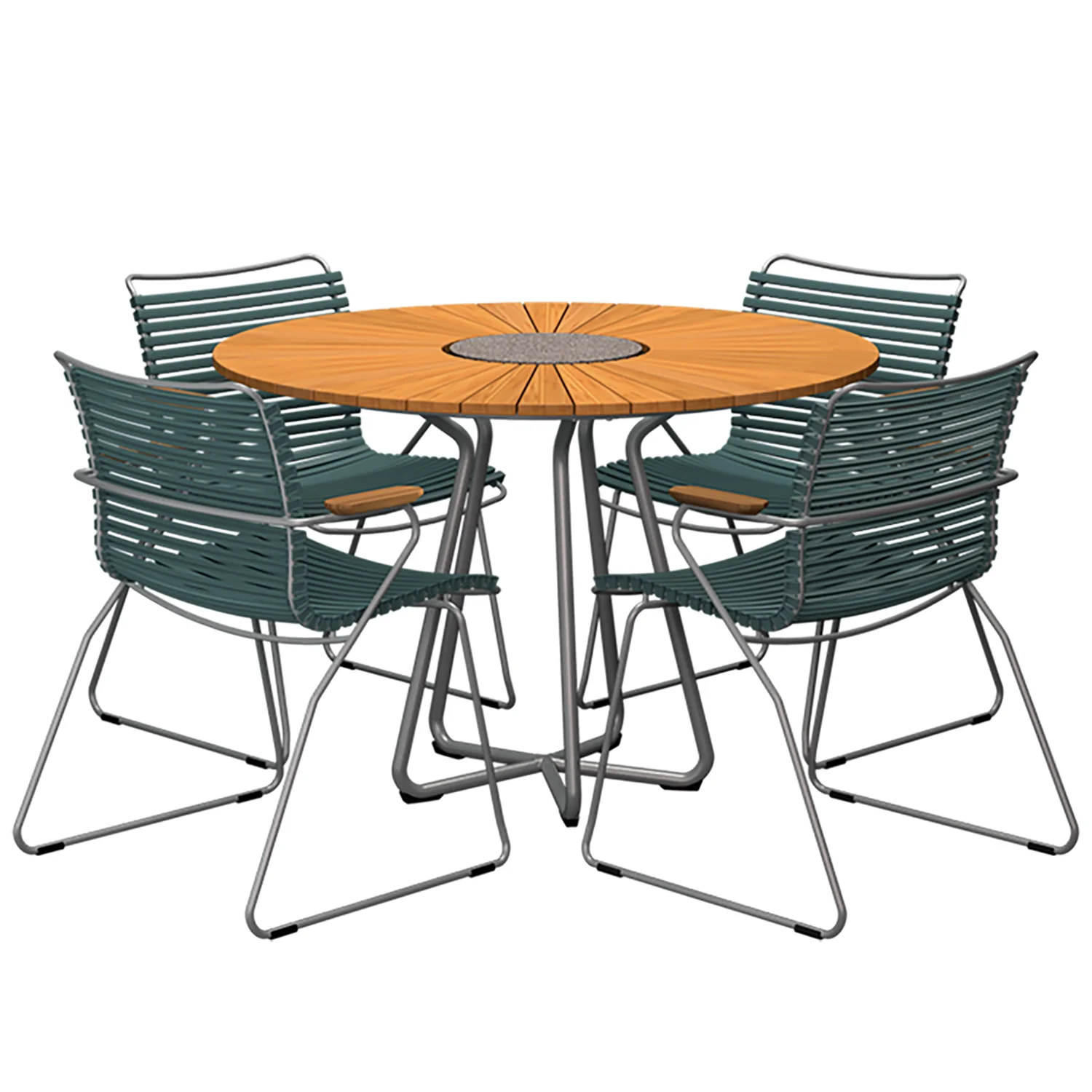 Matgrupp med Click karmstol och Circle matbord från danska Houe. Matbordet har lameller av bambu och en mitt av granit, benstativ av pulverlackerat stål. Lamellerna är formade likt en solfjäder. Det runda bordet är inte bara vackert utan ger dig gott om utrymme för gäster eller för hela familjen.