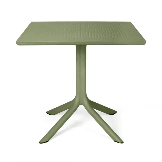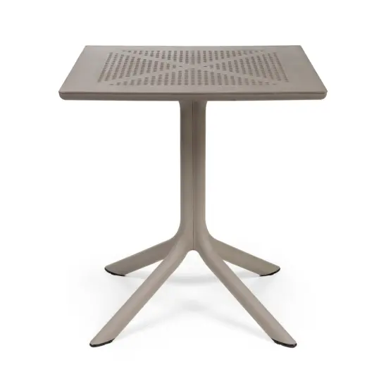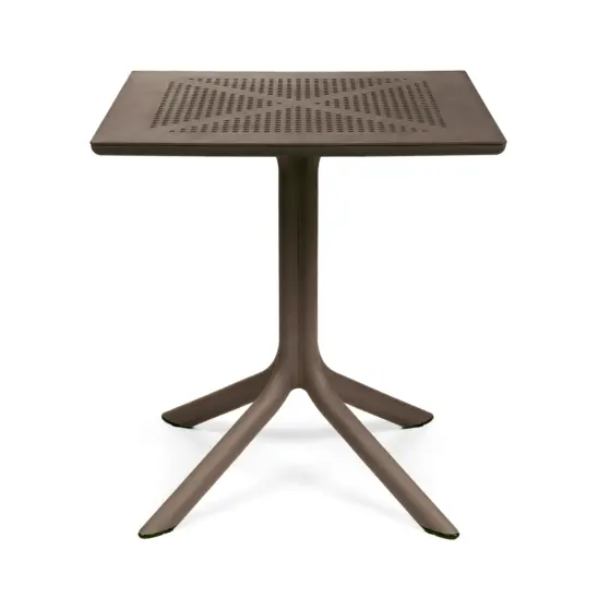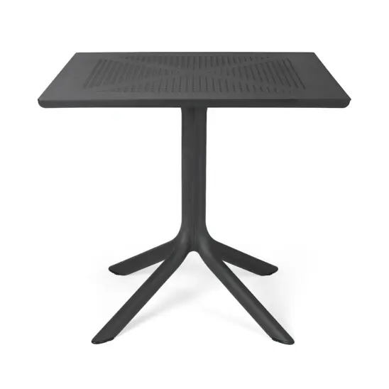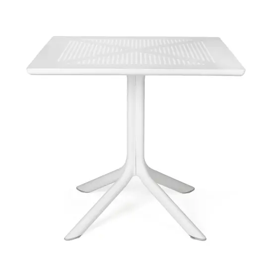 Clip är ett professionellt fyrkantigt bord i UV-behandlad glasfiberharts, speciellt utformat för att ta upp väldigt lite plats, med ett centralt stöd med fyra ekrar och en DurelTop-bordsskiva, fotograverat med ett runt perforerat mönster.