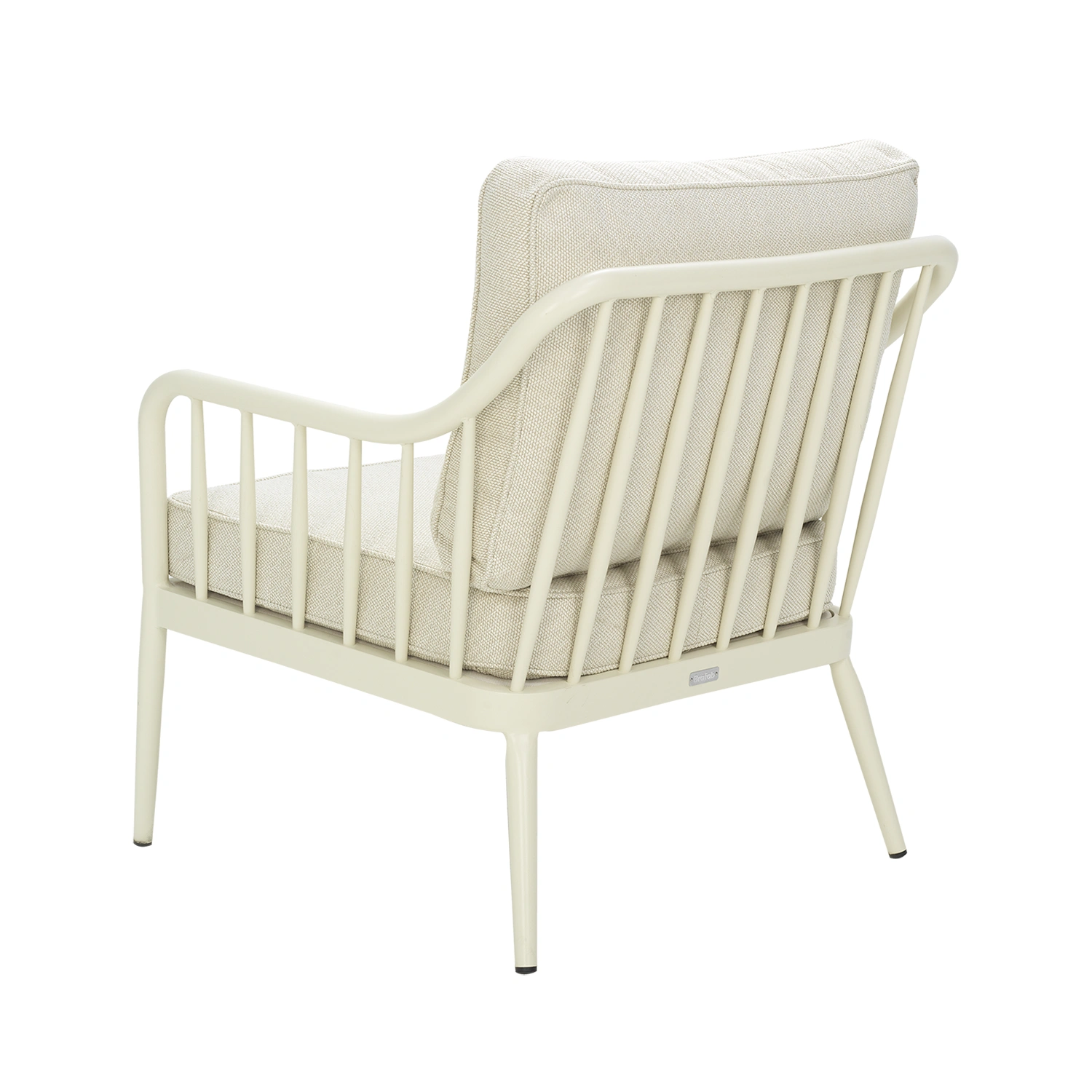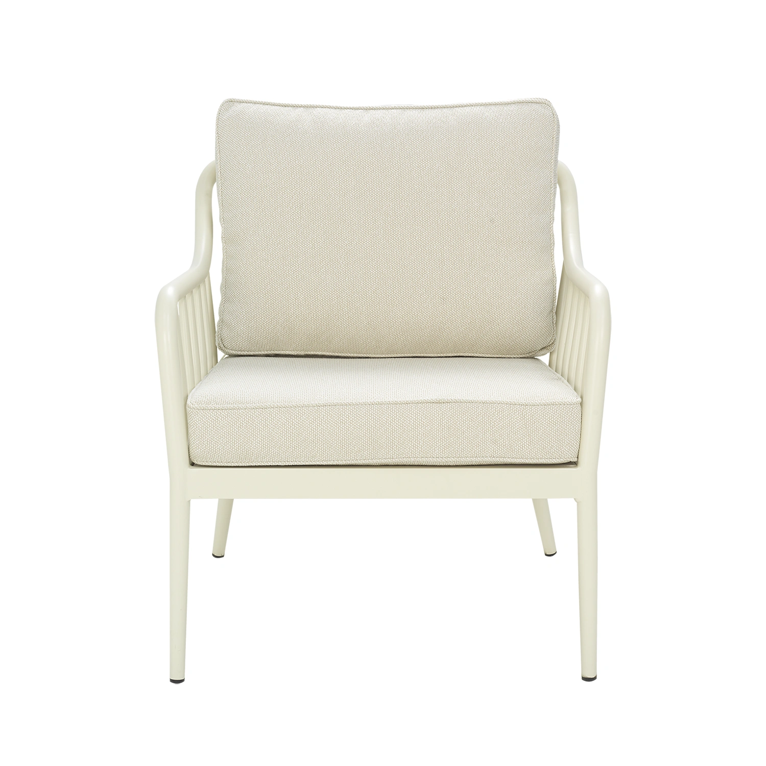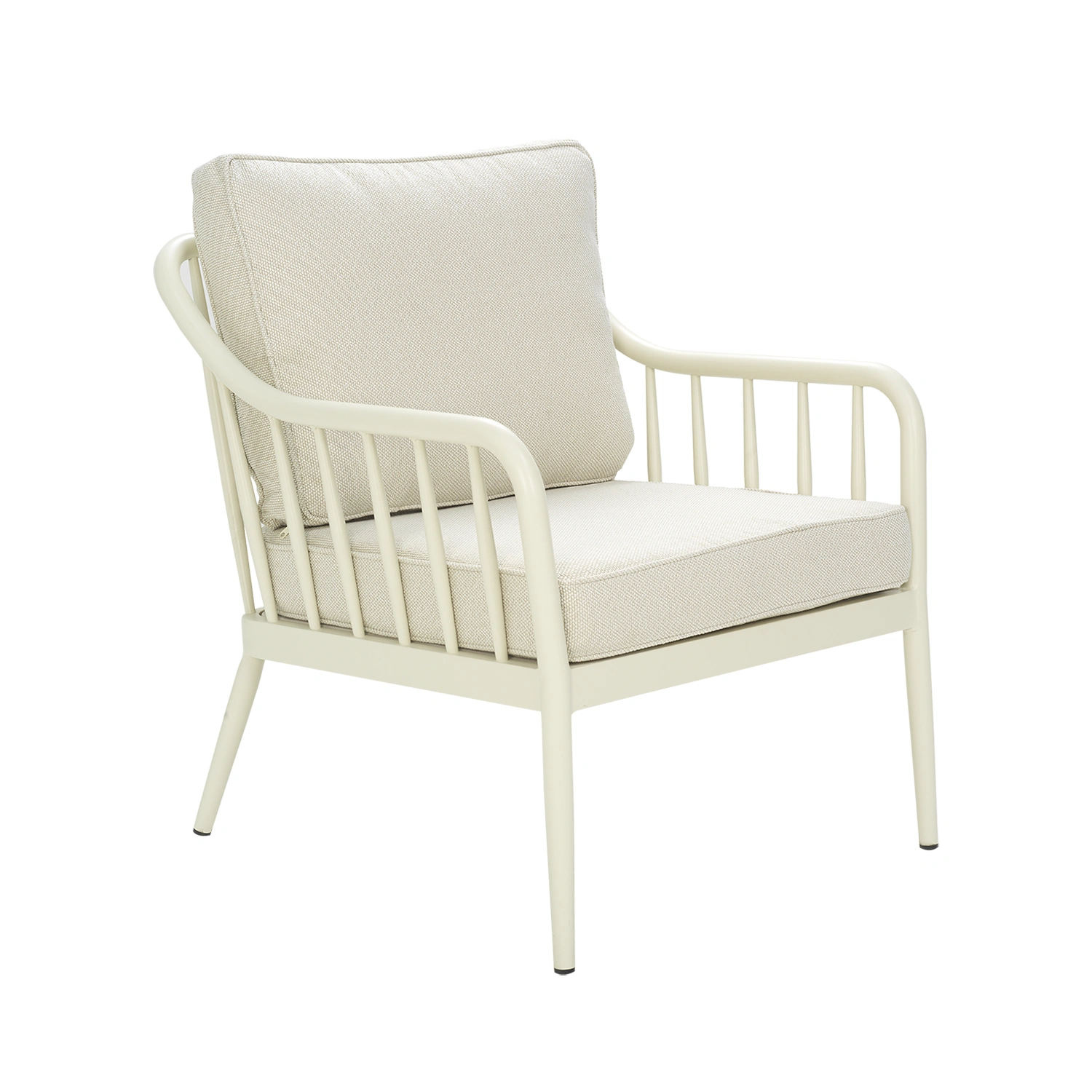 Den pärlvita stommen har en matt finish som ger ett ljust och luftigt intryck, medan dynorna i dot beige tillför en subtil textur och mjukhet. Fåtöljen är en del av Coleville soffgrupp från Brafab och passar lika bra på terrassen som i ett inglasat uterum. Komplettera gärna med ett soffbord från Brafab.