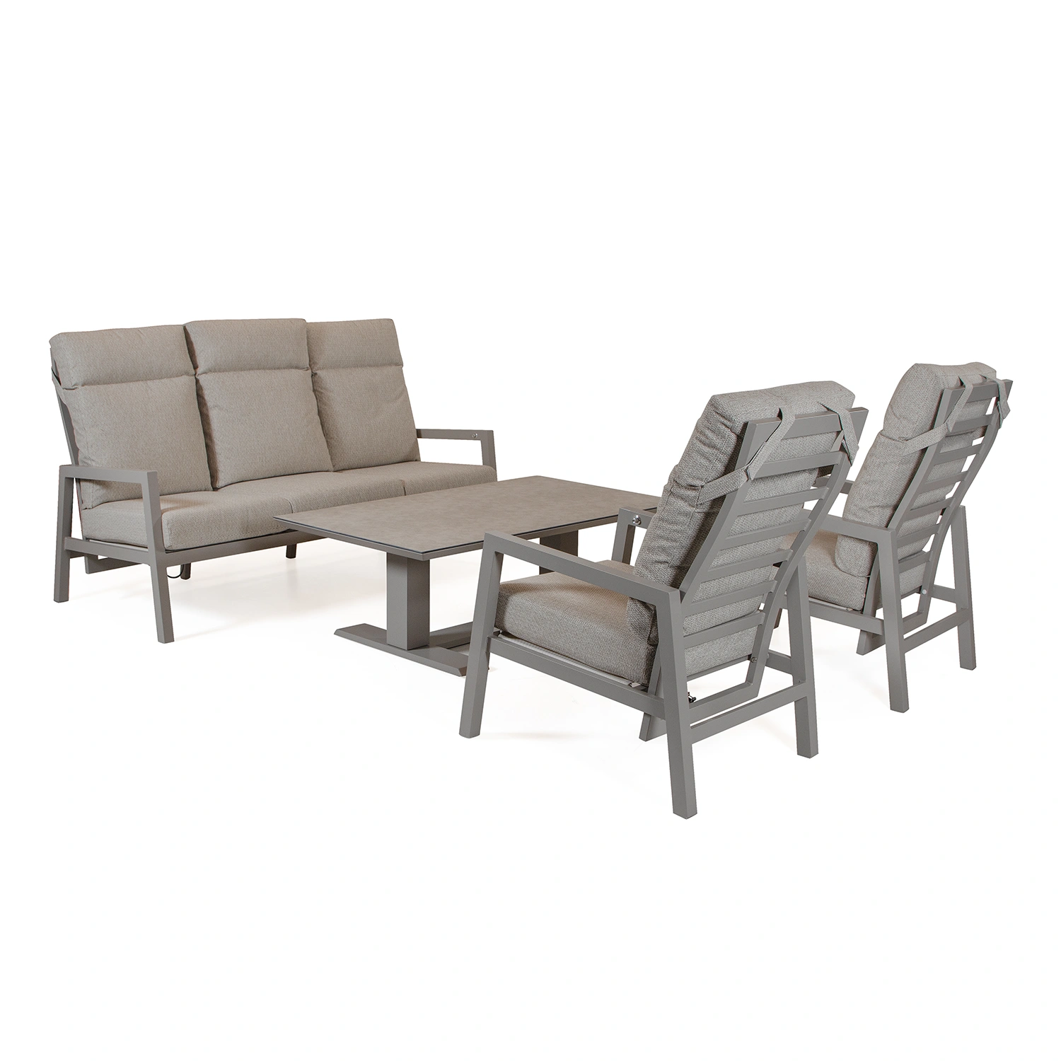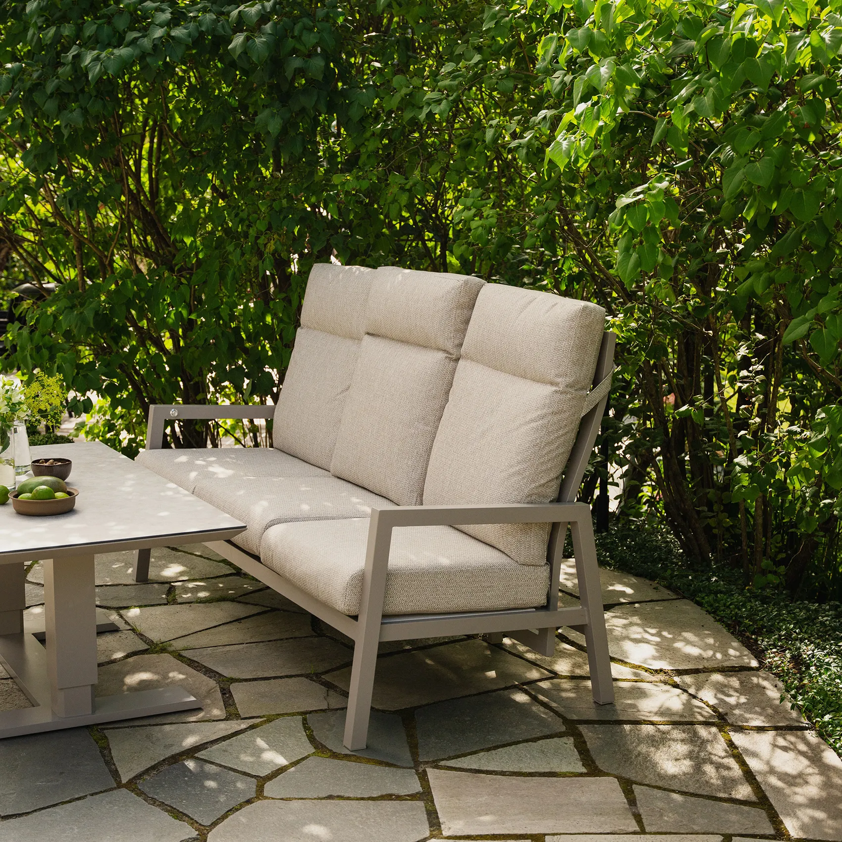 Como är en aluminiumserie från Atleve med både matgrupper, soffgrupper och tillbehör. Soffgruppen består av 1 3-sitssoffa (ej ställbar), 2 ställbara fåtöljer och 1 höj och sänkbart soffbord. Soffan, fåtöljerna och bordet har stomme i färgen Khaki. Dynorna är beiga allvädersdynor.