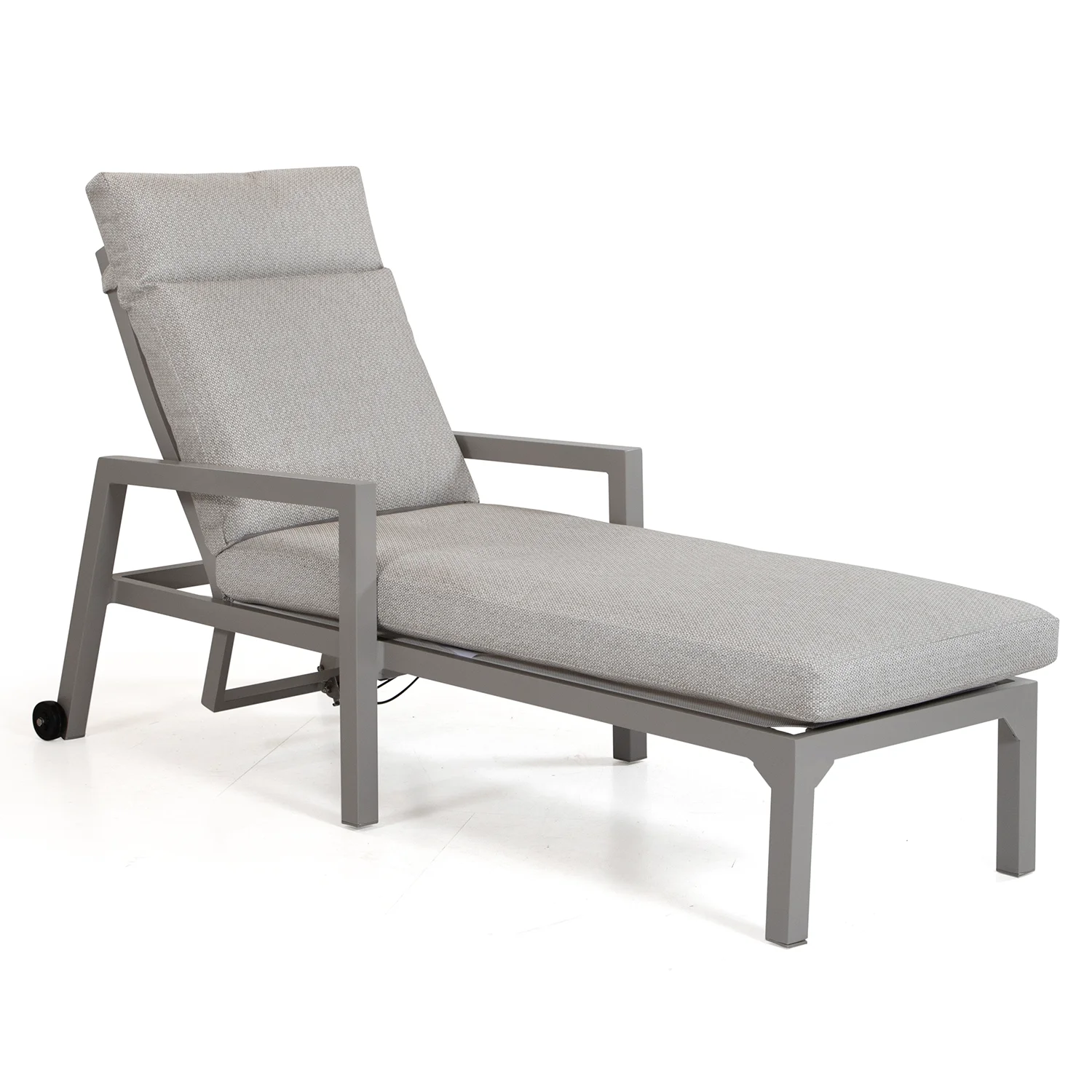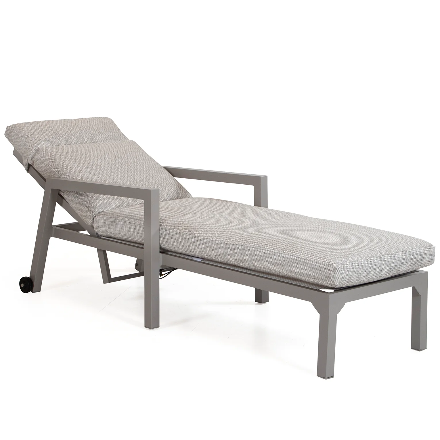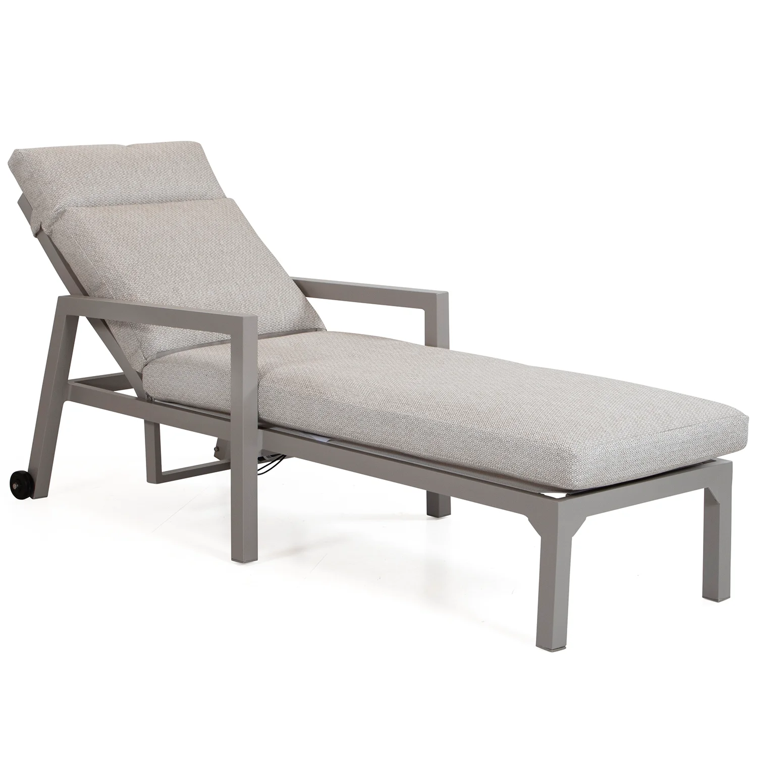 Här visas solsängen i khakifärgad aluminium med ställbar rygg och hjul i bakkant för enkel förflyttning.