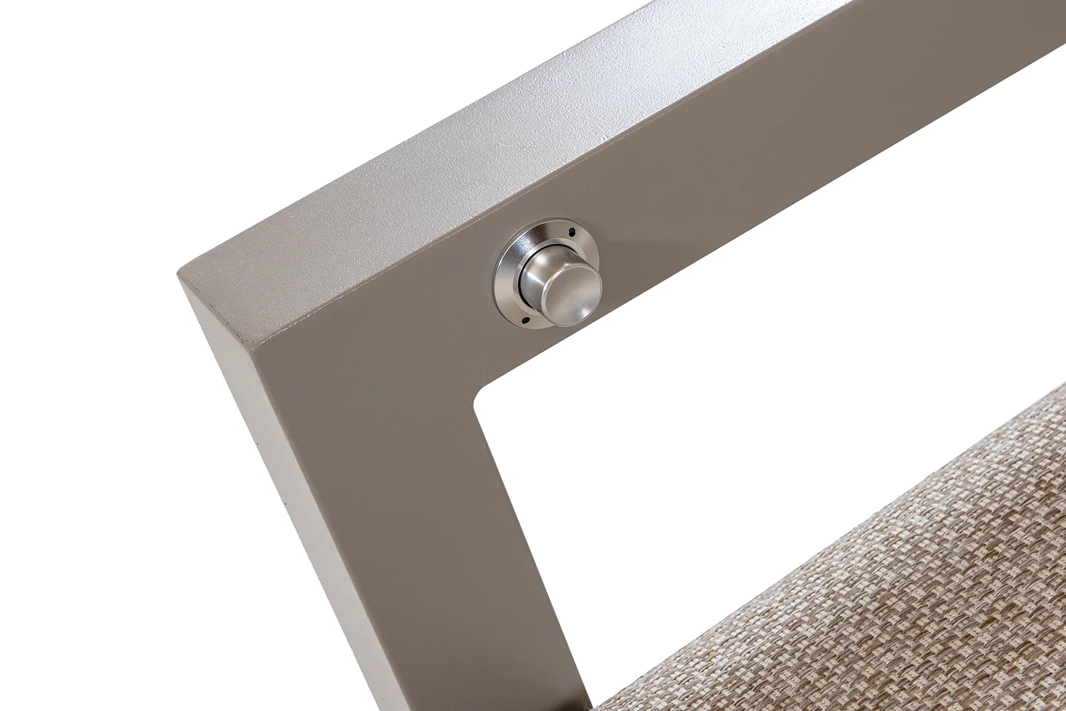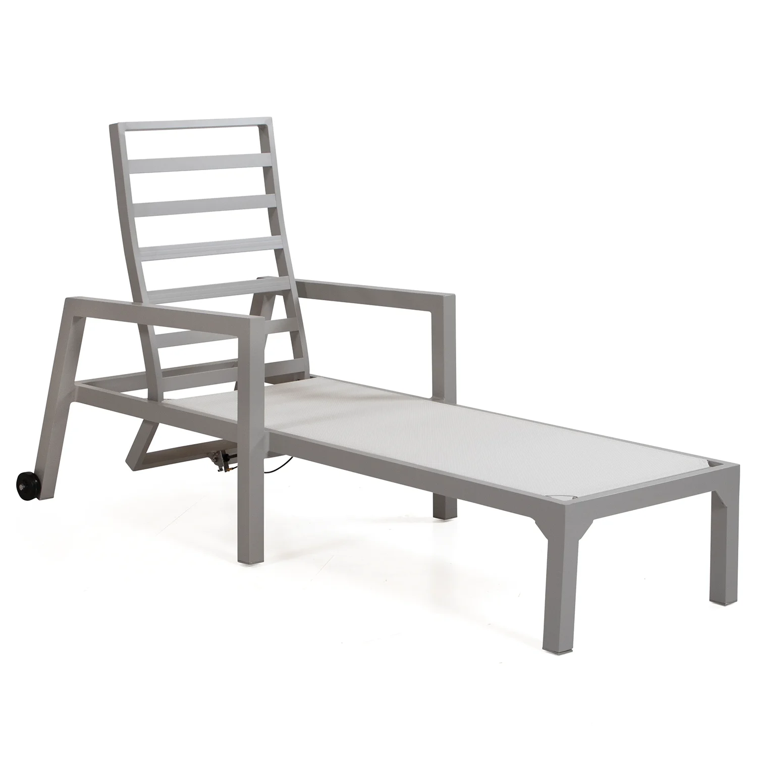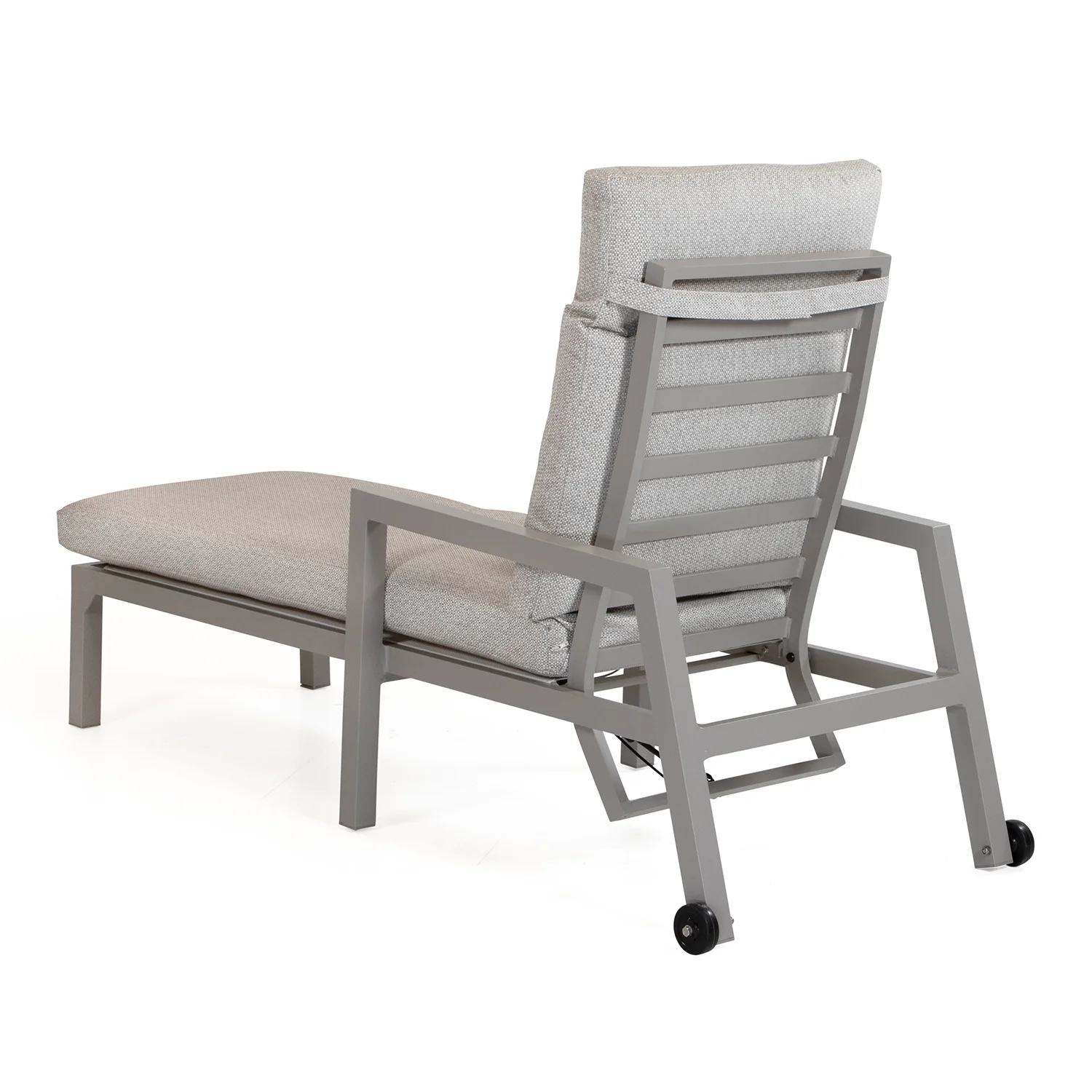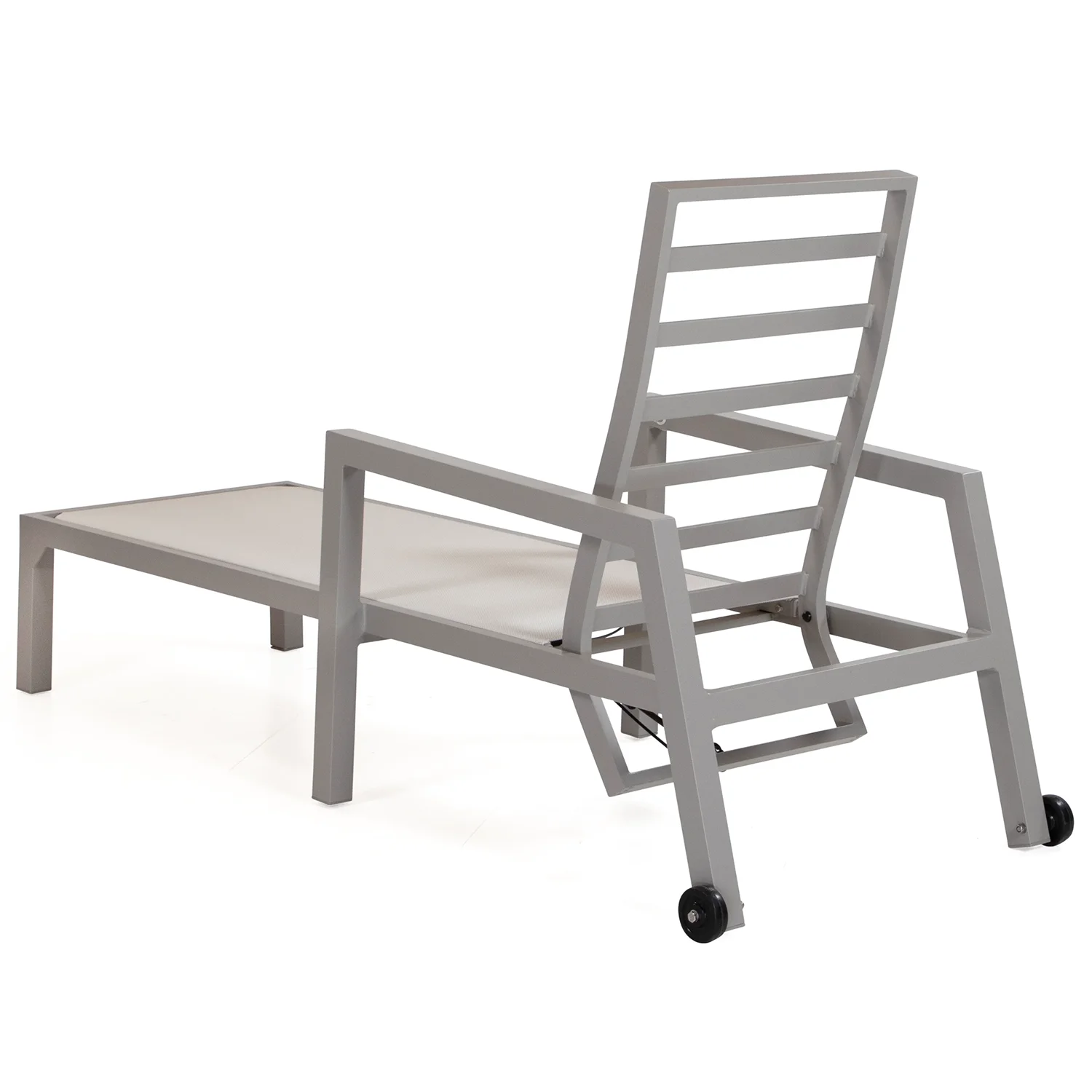 Här visas solsängen i khakifärgad aluminium med ställbar rygg och hjul i bakkant för enkel förflyttning.