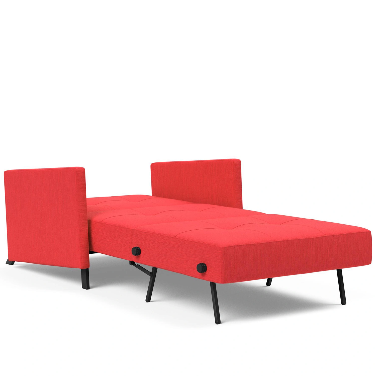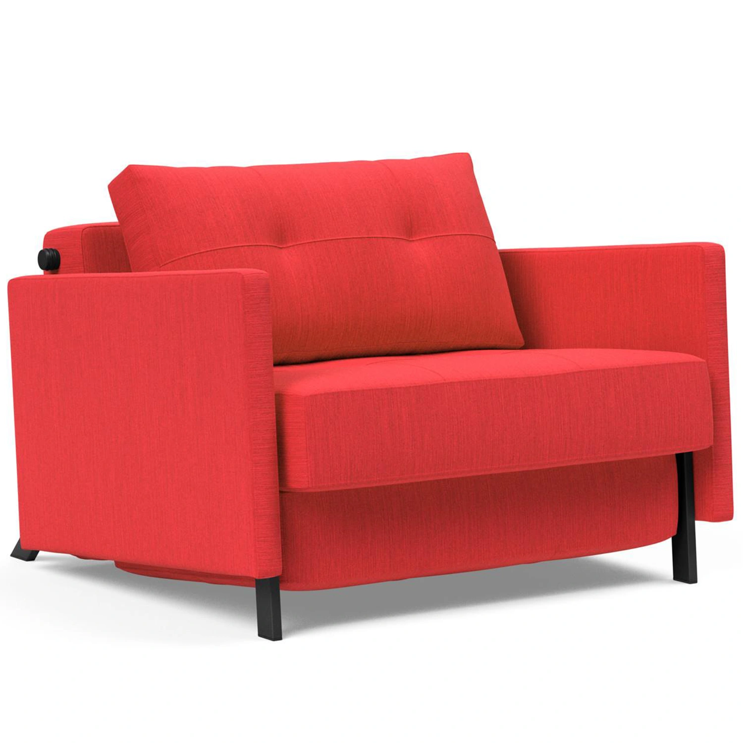 Cubed 02 fåtölj med armstöd från Innovation Living. Cubed är en mycket kompakt modell av bäddsoffa eller i det här fallet bäddfåtölj, perfekt där det är ont om plats. Modellen finns i olika bredder, med eller utan armstöd och med olika typer av soffben för stor valmöjlighet. Fåtlöjen dras enkelt ut från soffa till sovplats och står stadigt med hjälp av dolda ben som fälls ut. Som tillbehör finns även ett ställbart nackstöd.