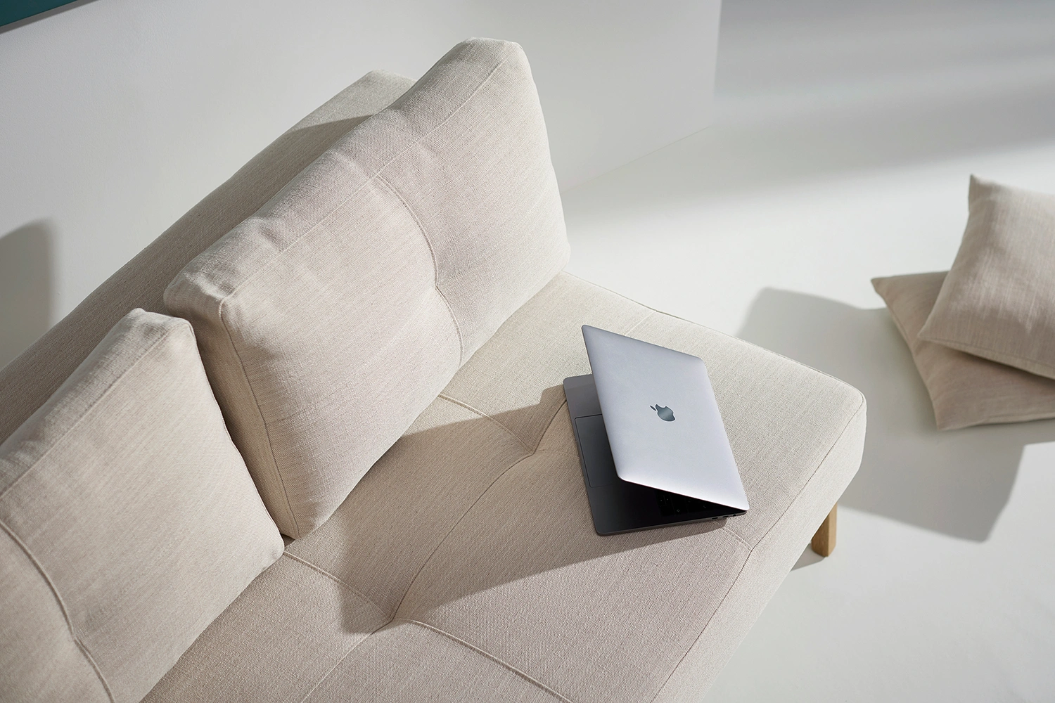 Cubed 02 bäddsoffa från Innovation Living, här med ben i lackerad ek. Bäddsoffan kan enkelt dras ut från soffa till bädd. Inkluderat är två stycken ryggkuddar i samma tyg som soffan. Som tillbehör finns ett ställbart nackstöd. När du gör om soffan till en säng fälls benen automatiskt ut och soffan förvandlas på några sekunder.