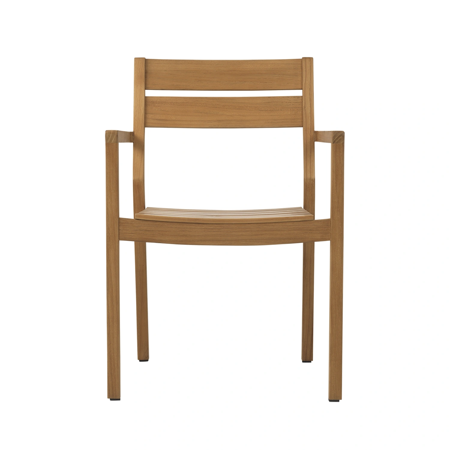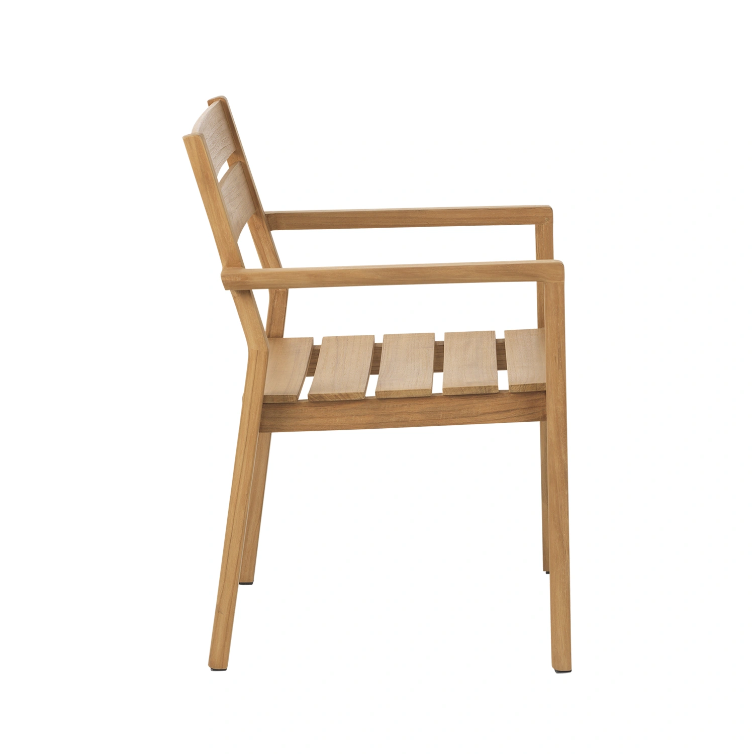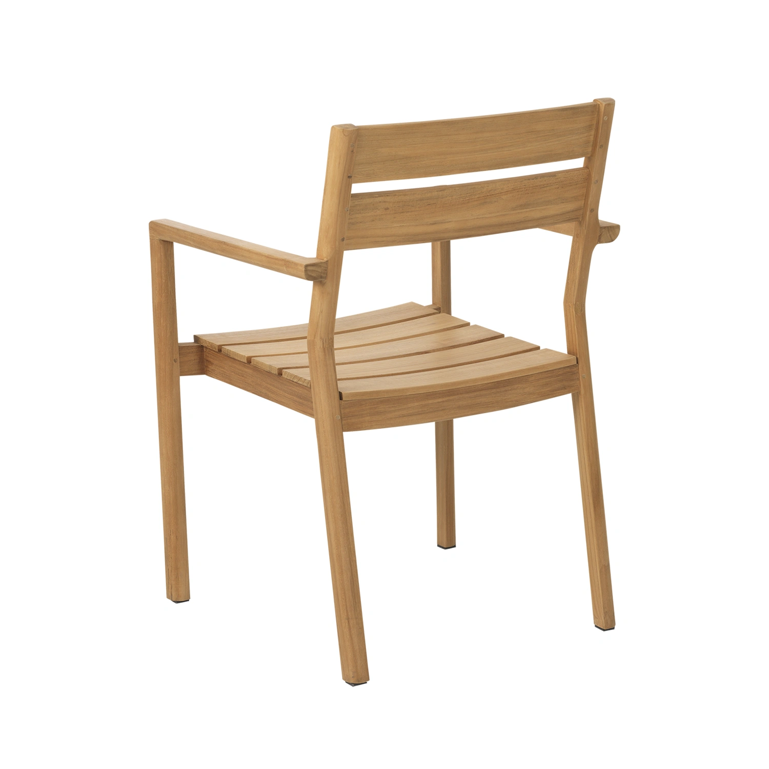 Stolen är tillverkad i massiv teak, ett naturligt oljerikt träslag som är mycket motståndskraftigt mot väder och vind. Teak får med tiden en vacker grå patina om det lämnas obehandlat, men kan behålla sin gyllene ton med regelbunden behandling med teakolja. Rengör med mild såpa och mjuk borste – undvik högtryckstvätt. För vinterförvaring rekommenderas att stolen placeras torrt och skyddat.