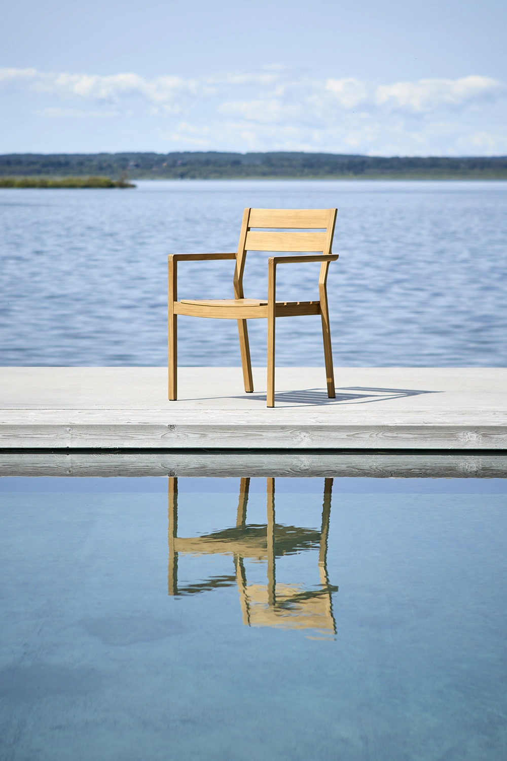 Delia är en praktisk stapelbar karmstol med mjuka former och skandinavisk elegans. Ursprungligen tillverkad i aluminium, har serien nu kompletterats med denna variant i massiv teak – ett naturmaterial som tillför värme, tyngd och karaktär till Delias välkända silhuett.