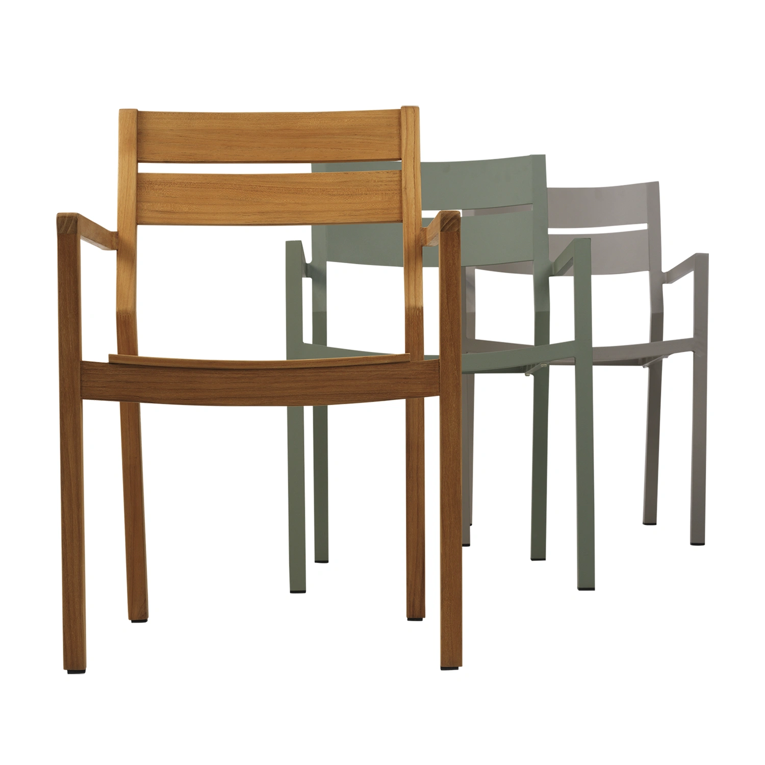 Delia i teak passar utmärkt tillsammans med matbord i samma material, men kan också kombineras med aluminiumbord för en spännande kontrast – exempelvis från serierna Bigby eller Nimes.