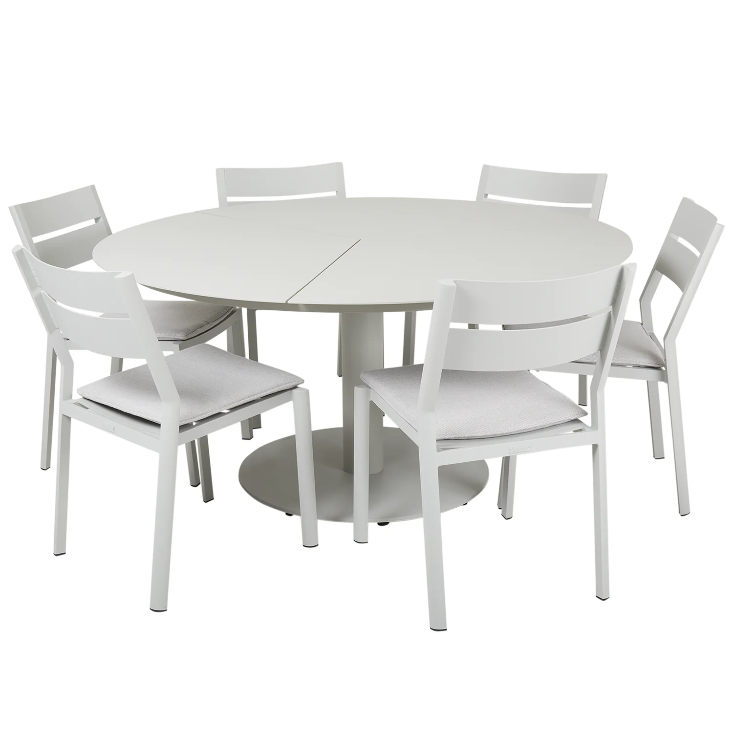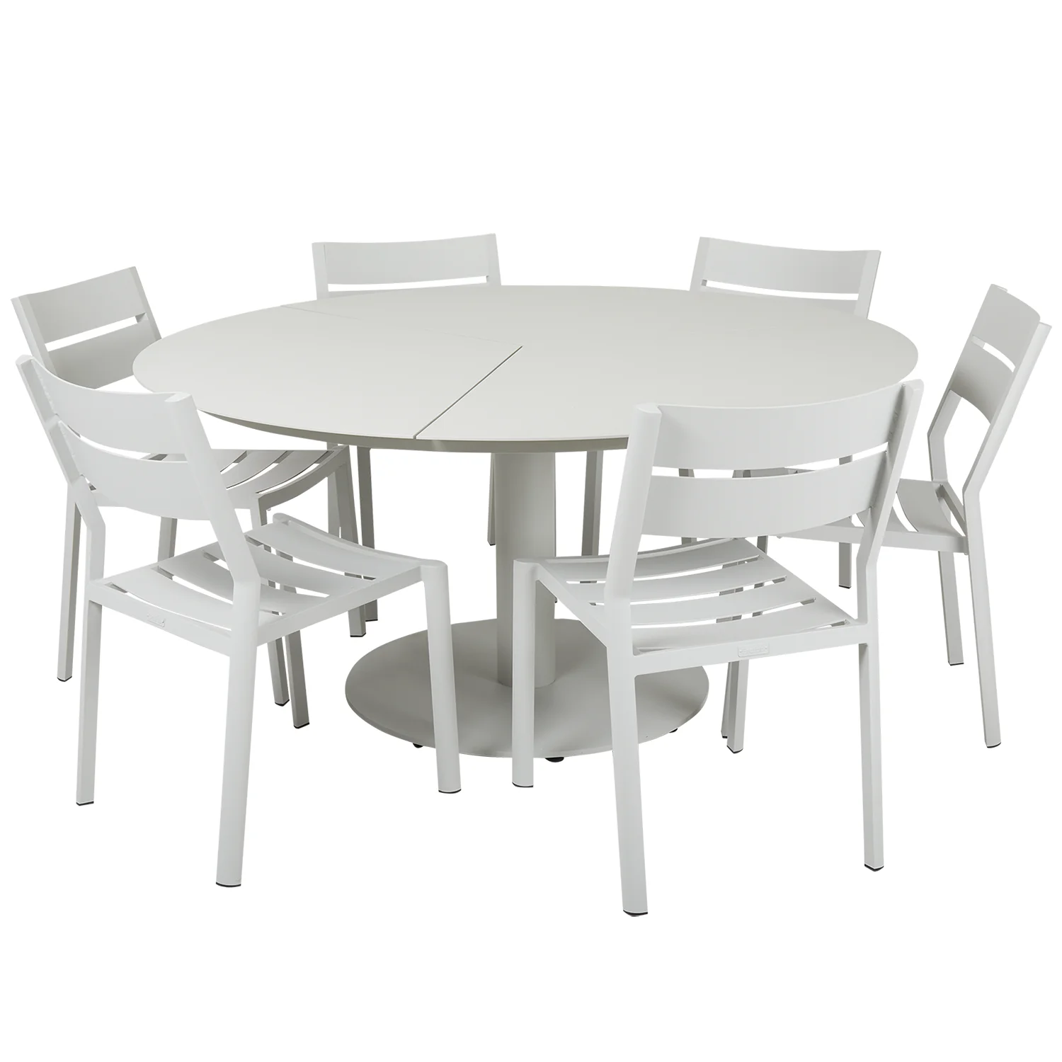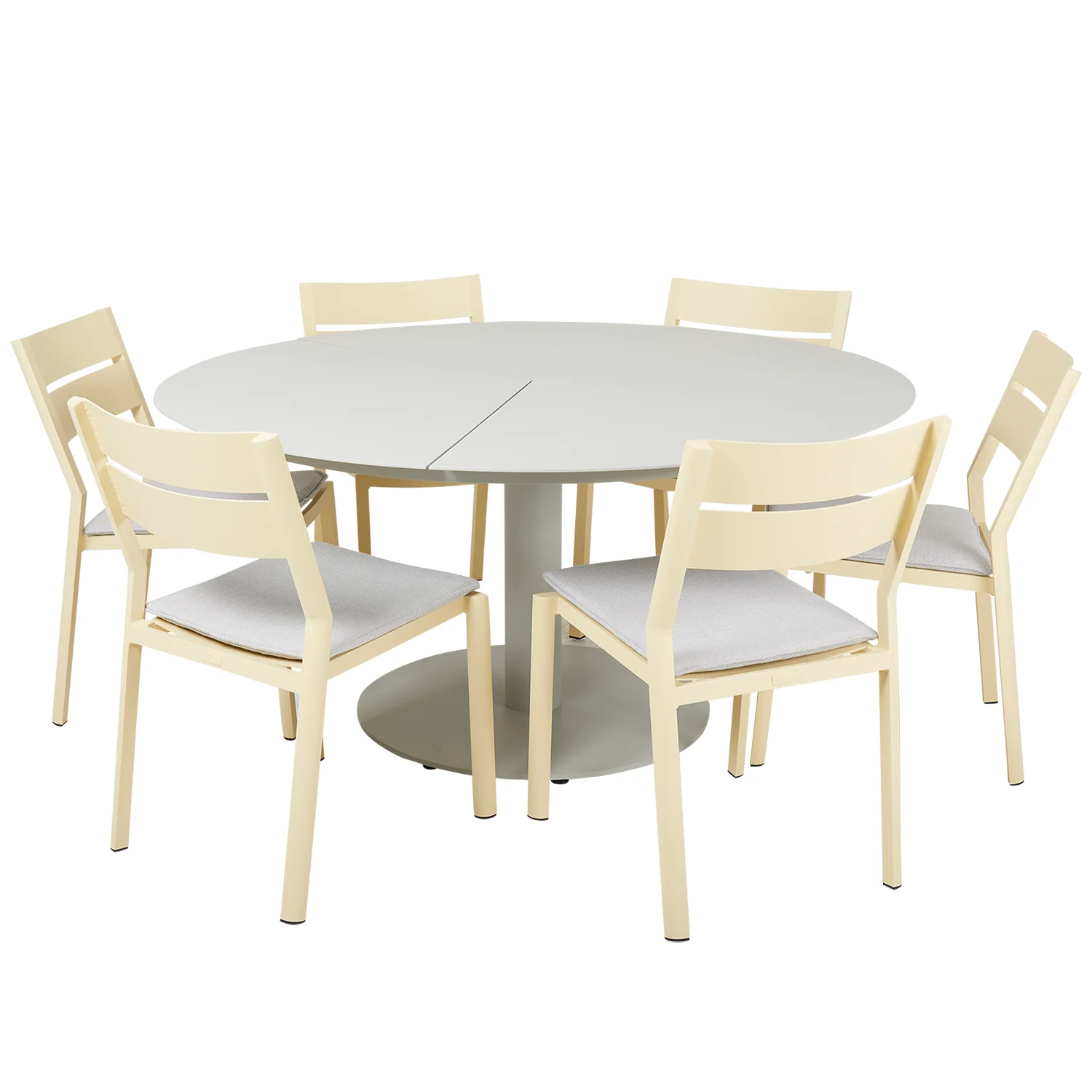 Matgrupp med runda matbordet Peace och stapelstolen Delia. Standardgruppen består av 6 stycken matstolar och 1 bord. Det går även att byta till karmstolar.