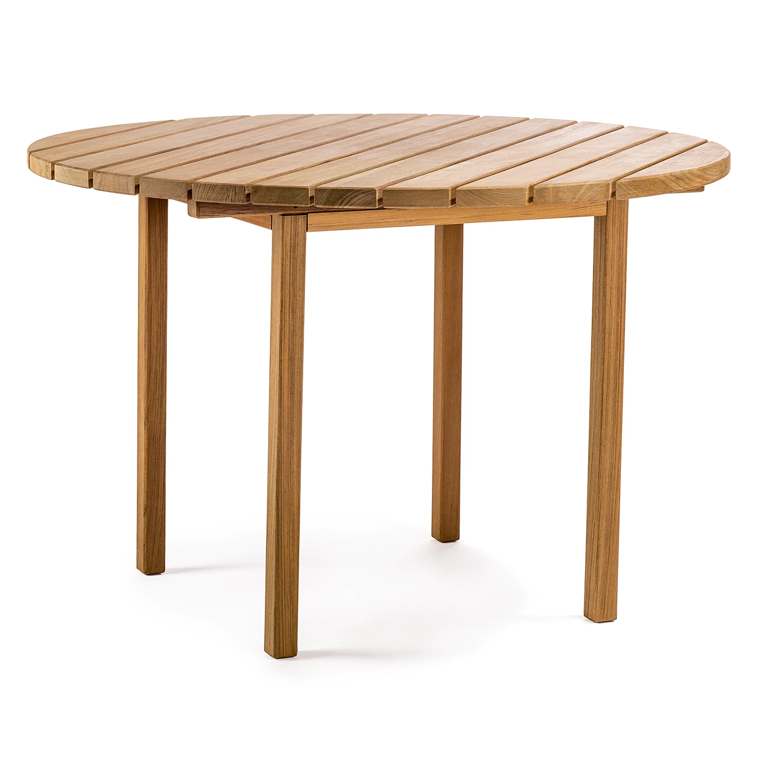 Djurö bord med rund bordsskiva i massiv teak är ett inbjudande inslag i trädgården eller på terrassen. Den generösa diametern ger plats för fyra personer och skapar en naturlig samlingspunkt för måltider och samtal utomhus. Bordets mjuka former och avskalade design gör det lätt att kombinera med olika stolar i serien. Teaken åldras vackert och får med tiden en silvergrå ton – för den som vill behålla den gyllene färgen rekommenderas regelbunden oljning.