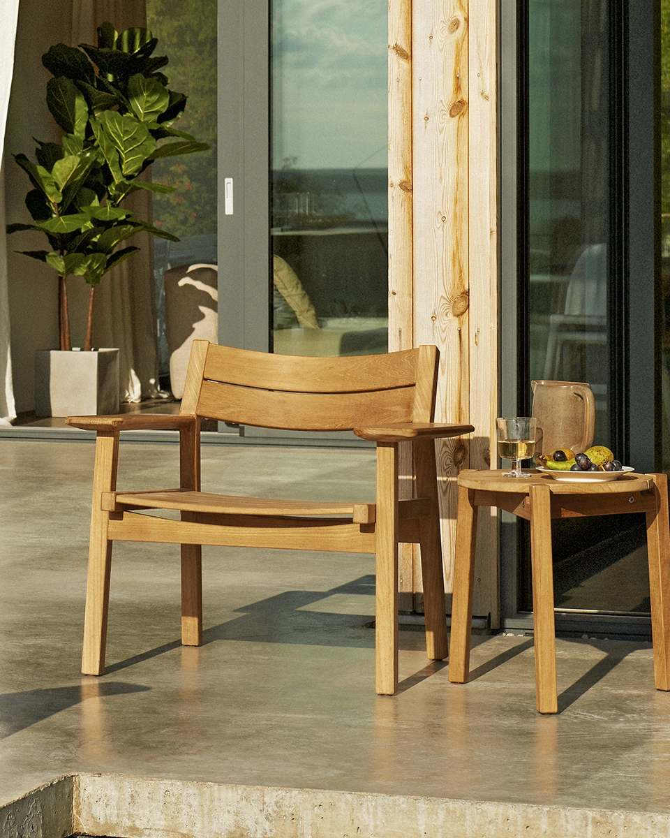 Djurö-serien är tillverkad i FSC-certifierad teak – ett slitstarkt och naturligt oljerikt träslag som lämpar sig väl för utomhusbruk. Möblerna kan oljas årligen om du vill behålla den gyllene trätonen, eller lämnas obehandlade för att med tiden anta en vacker silvergrå patina. Vissa delar i serien är även klädda med Batyline Duo från Ferrari – ett vädertåligt textilmaterial som är UV-resistent, snabbtorkande och lätt att underhålla.