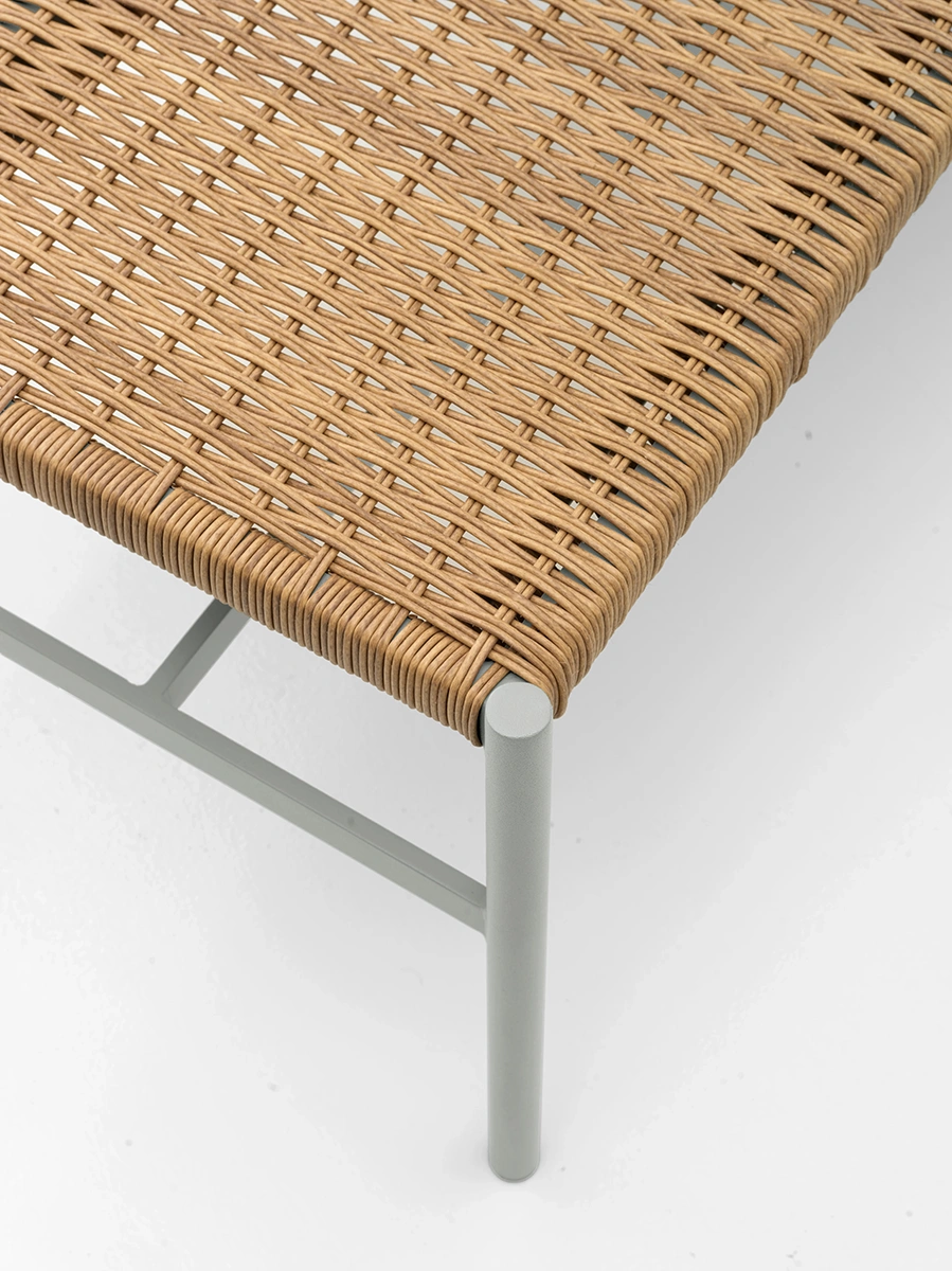 DK hyllar den skandinaviska designen och som för tankarna till mästerverk från 1950-talet. Elegant och stabil stomme i aluminium och med kontrasterande detaljer som lyfter känslan och håller DK aktuell – länge. Flätad sits i konstrotting är detaljer som lyfter bänken. Den genomgående luftiga känslan i designen är ett tydligt arv från de skandinaviska klassikerna.