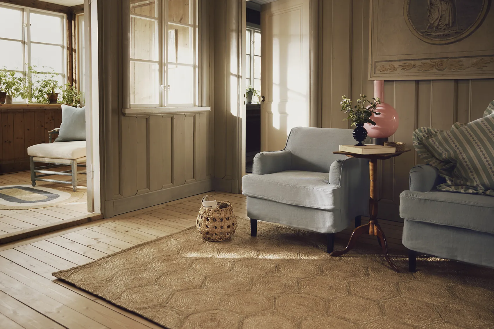 Jute – En jutematta är naturligt vacker. Den är dessutom isolerande och absorberar 10 ggr mer ljud än en syntetisk matta. Jutemattan är också väldigt stabil och slitstark och 100% återvinningsbar. Jute odlas på flera platser i Asien. Man använder stjälkarnas fibrer vid tillverkningen och resultatet är ett grovt slitstarkt material. Men med nya beredningsmetoder kan man numera få fram ett mjukt garn som är tacksamt både att färga in och väva till vackra mattor.