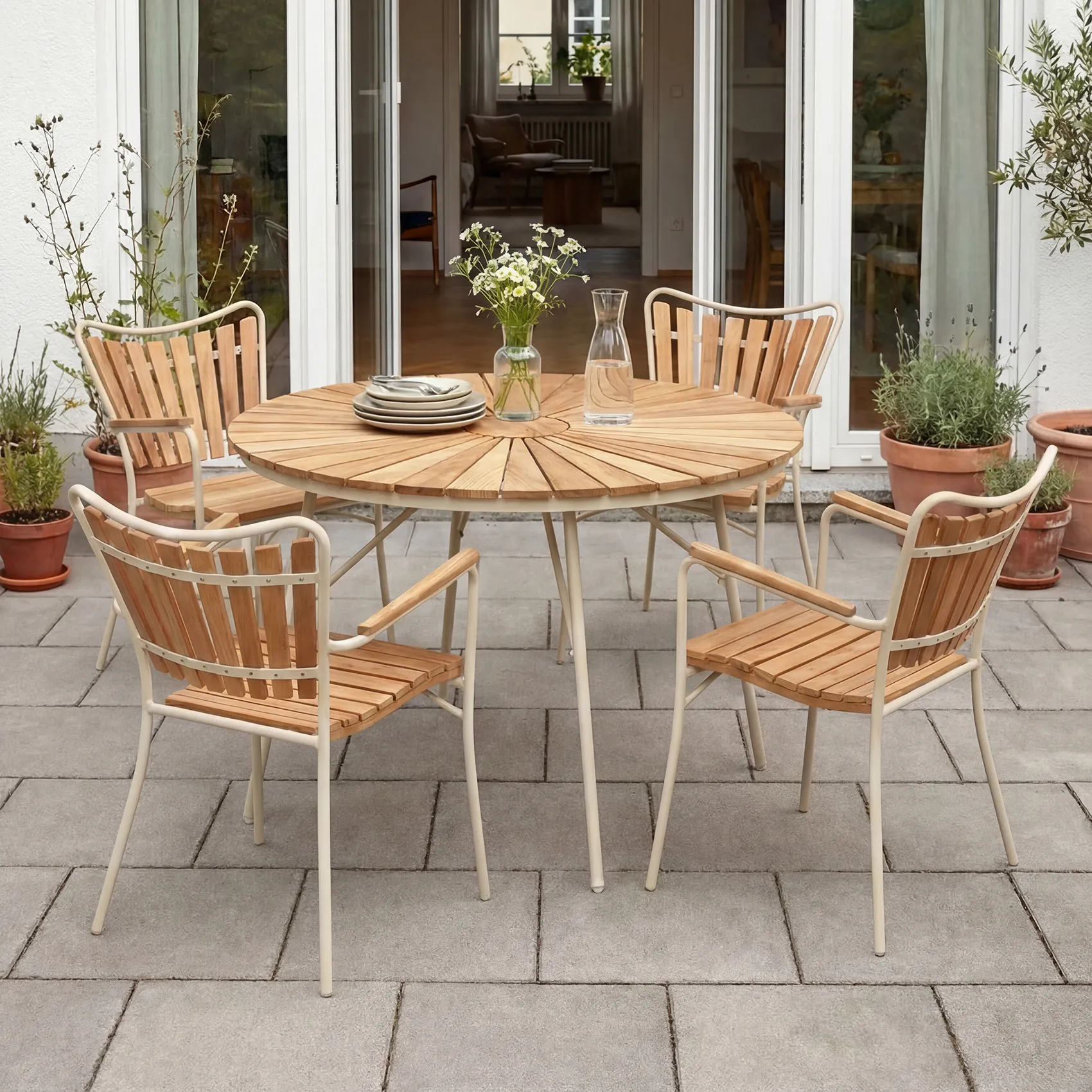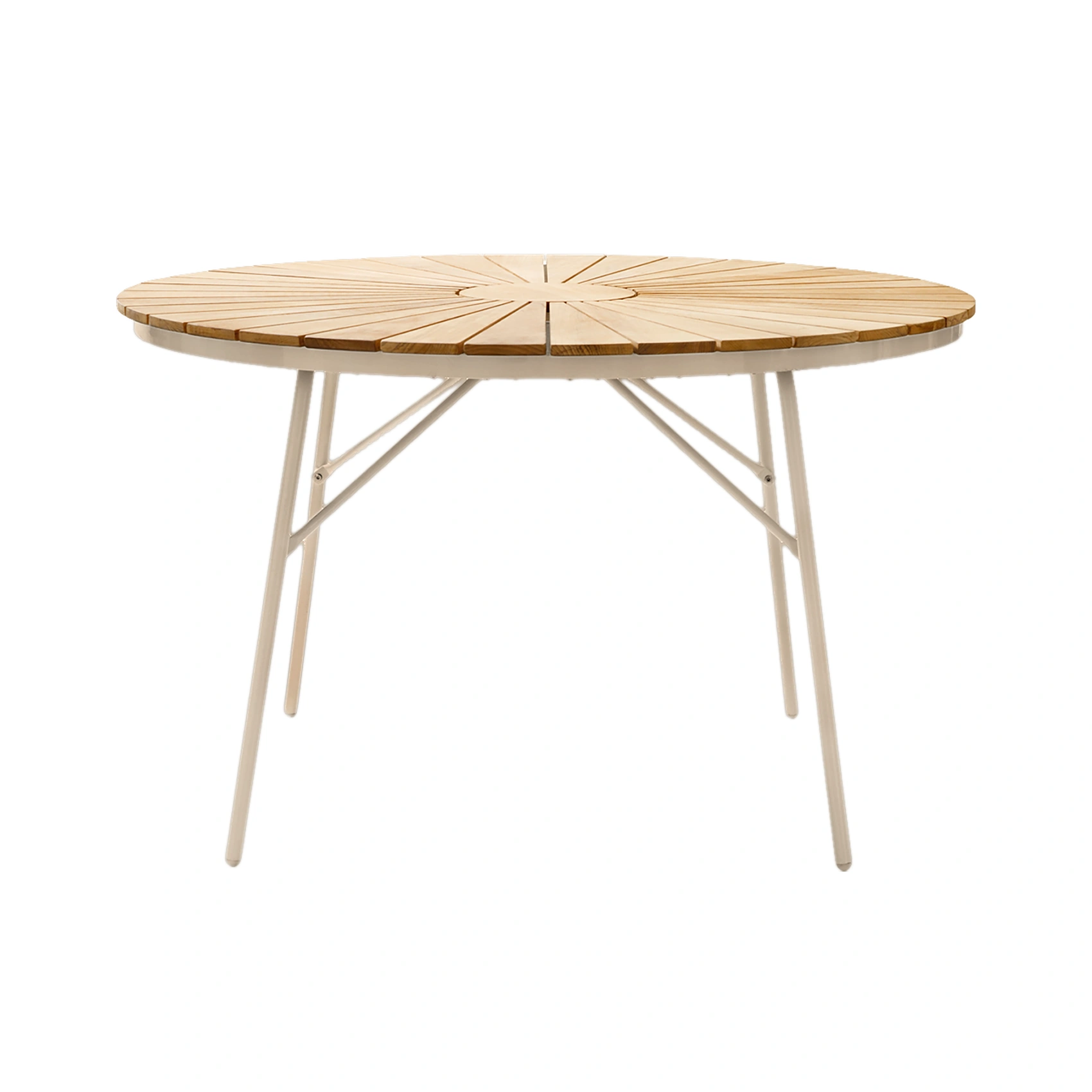 Ellen är ett vackert runt bord med en bordsskiva i teak och en stomme i pulverlackerad aluminium. Skandinavisk design från 1950-talet. Solstrålar som strålar ut från mitten av bordsskivan och skapar en varm och visuell bild. Komplettera gärna med karmstolarna i samma serie.