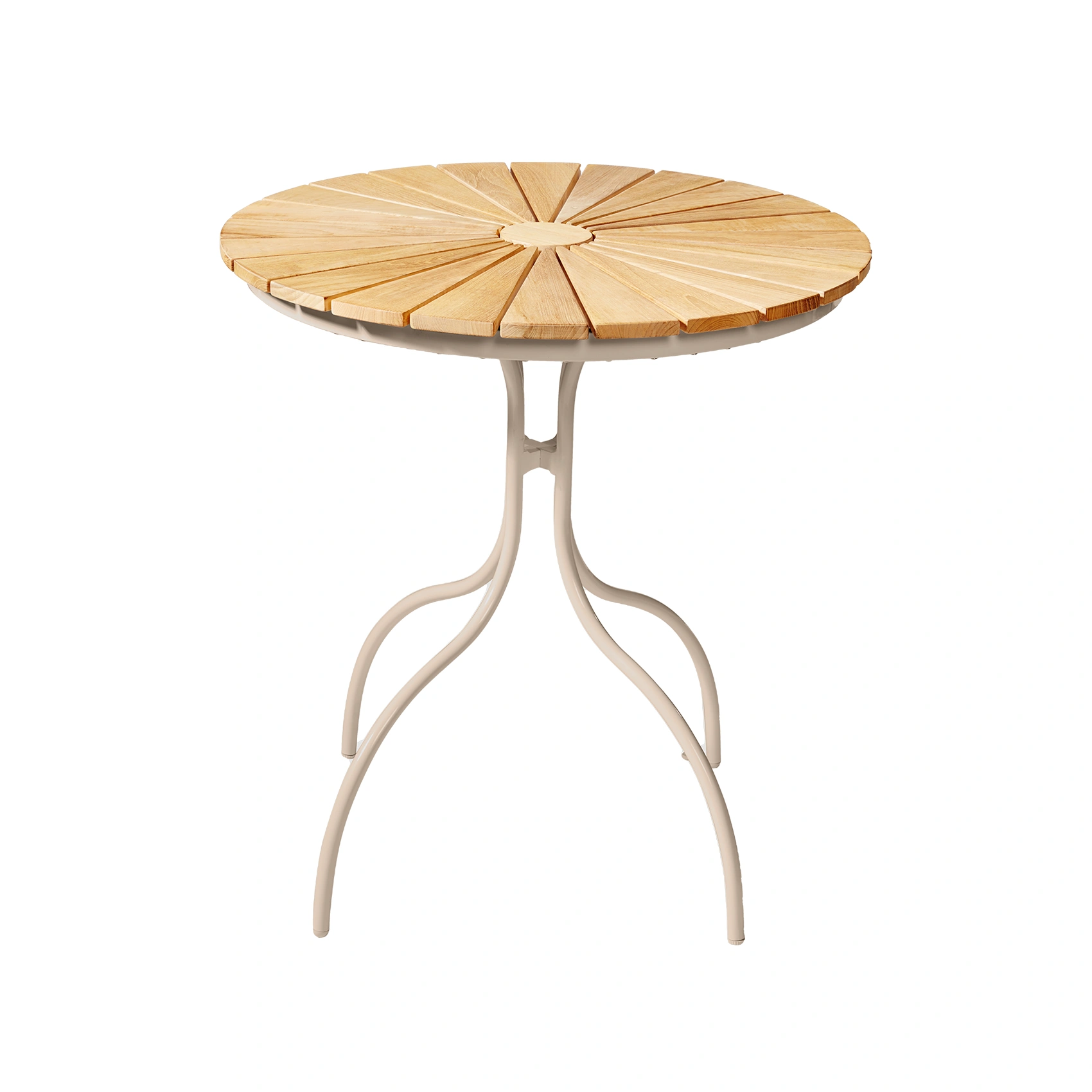 Ellen är ett vackert runt cafébord med en bordsskiva i teak och en stomme i pulverlackerad aluminium. Skandinavisk design från 1950-talet. Solstrålar som strålar ut från mitten av bordsskivan och skapar en varm och visuell bild. Komplettera gärna med karmstolarna i samma serie.