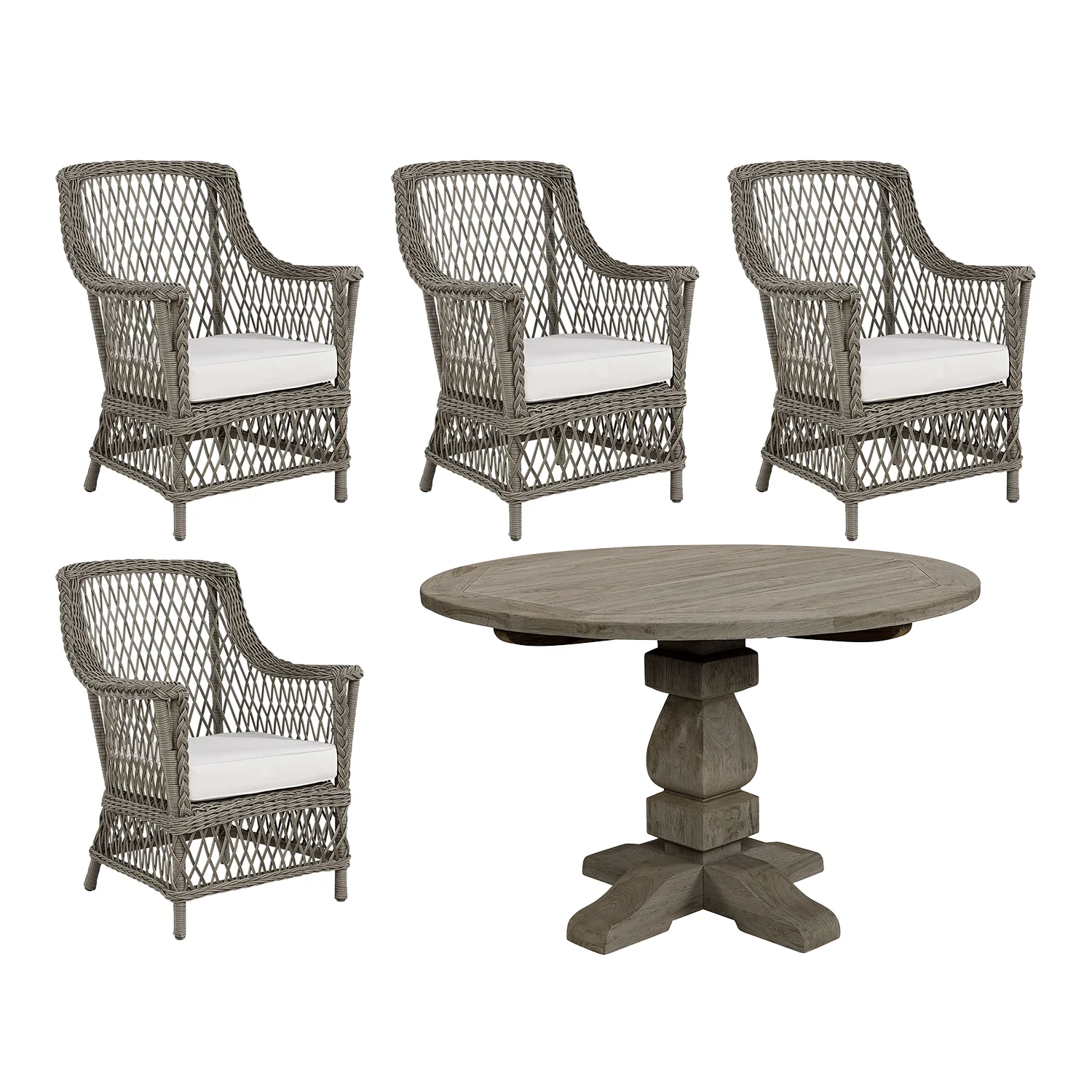 Gruppens runda matbord heter French och är tillverkat i Charcoal teak. Teaken odlas på plantager i Indonesien och är behandlat med en miljövänlig, vattenbaserad lösning som ger den grå väderbitna färgen som teak får med tiden, redan från början. Behandlingen kommer gradvis att blekna och den naturliga patinan kommer framhävas och möblerna behåller sin grå färg. Viss sprickbildning kan förekomma.