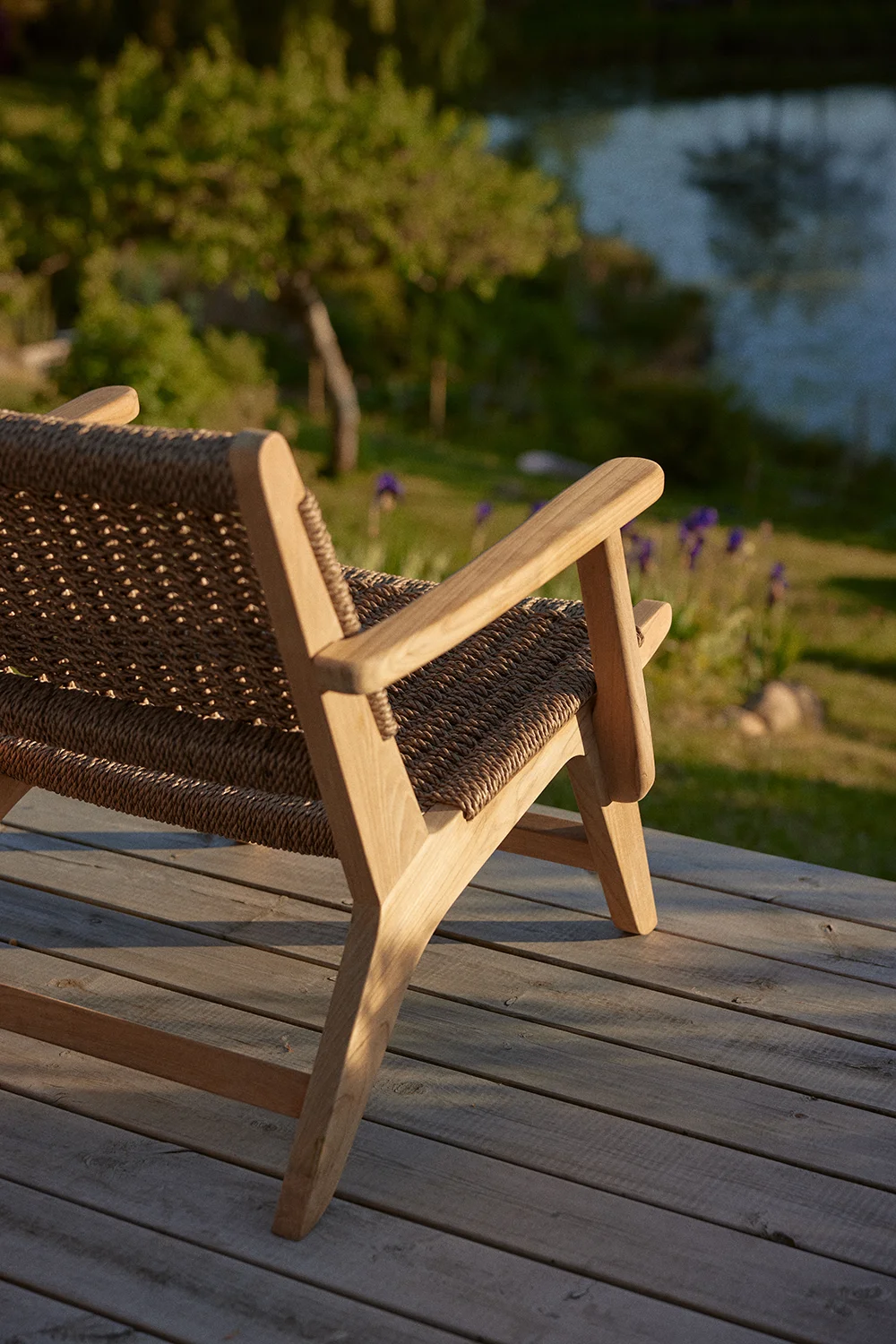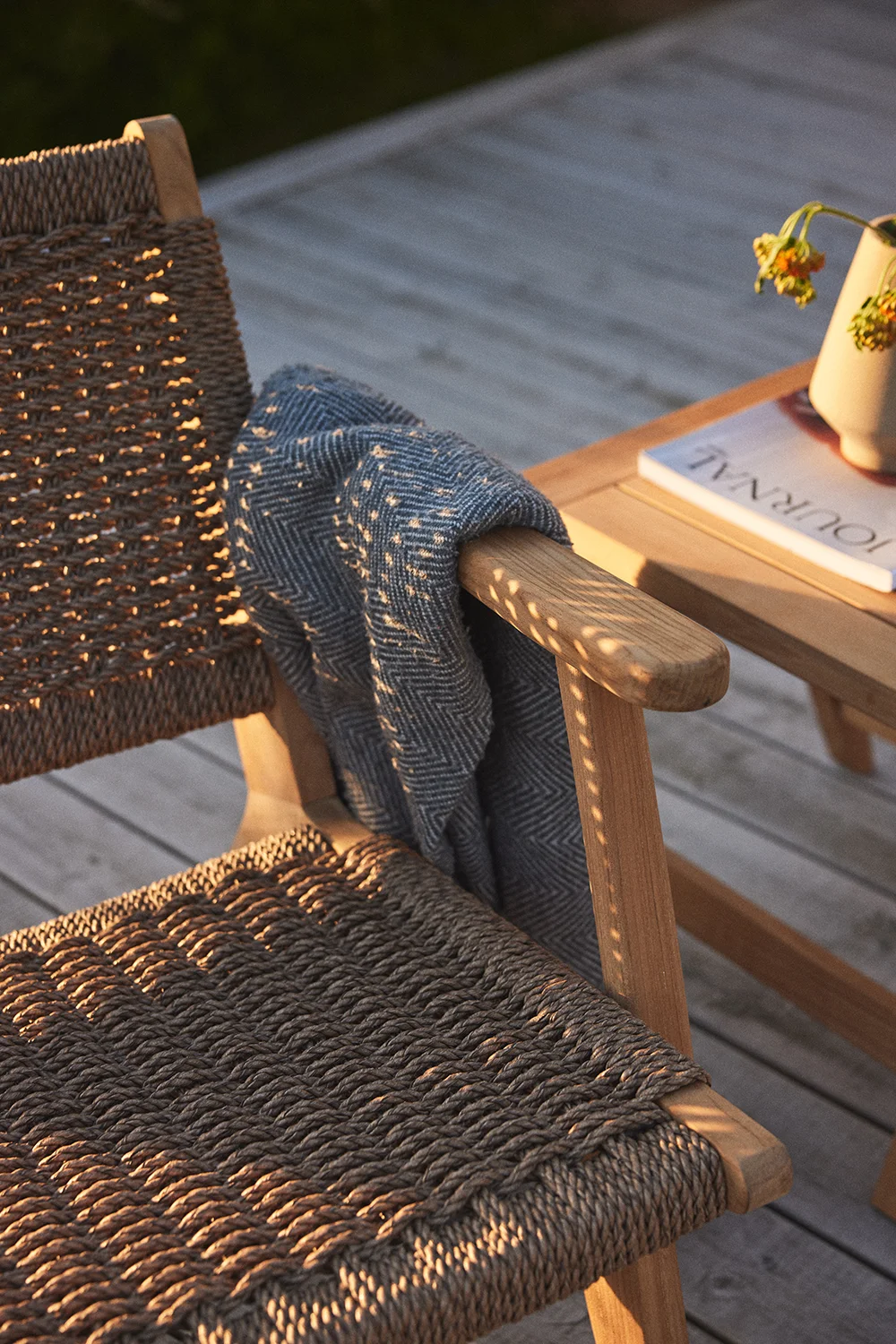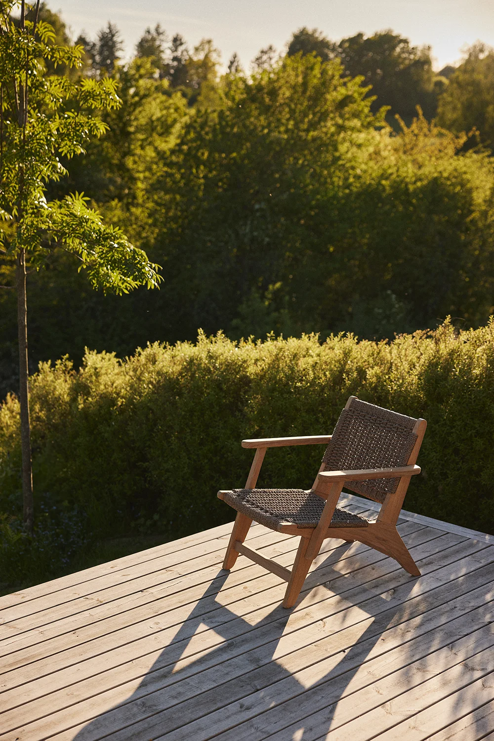 Eya är en stilren loungefåtölj gjord av Viro-rep och teak. Med sin naturliga och moderna design är den perfekt för terrassen, trädgården eller balkongen. Det massiva teakträdet ger bra stabilitet medan flätad sits och ryggstöd ger en bekväm sittupplevelse. En kombination av tidlös estetik och hållbarhet som gör utomhusavkoppling ännu mer inbjudande.