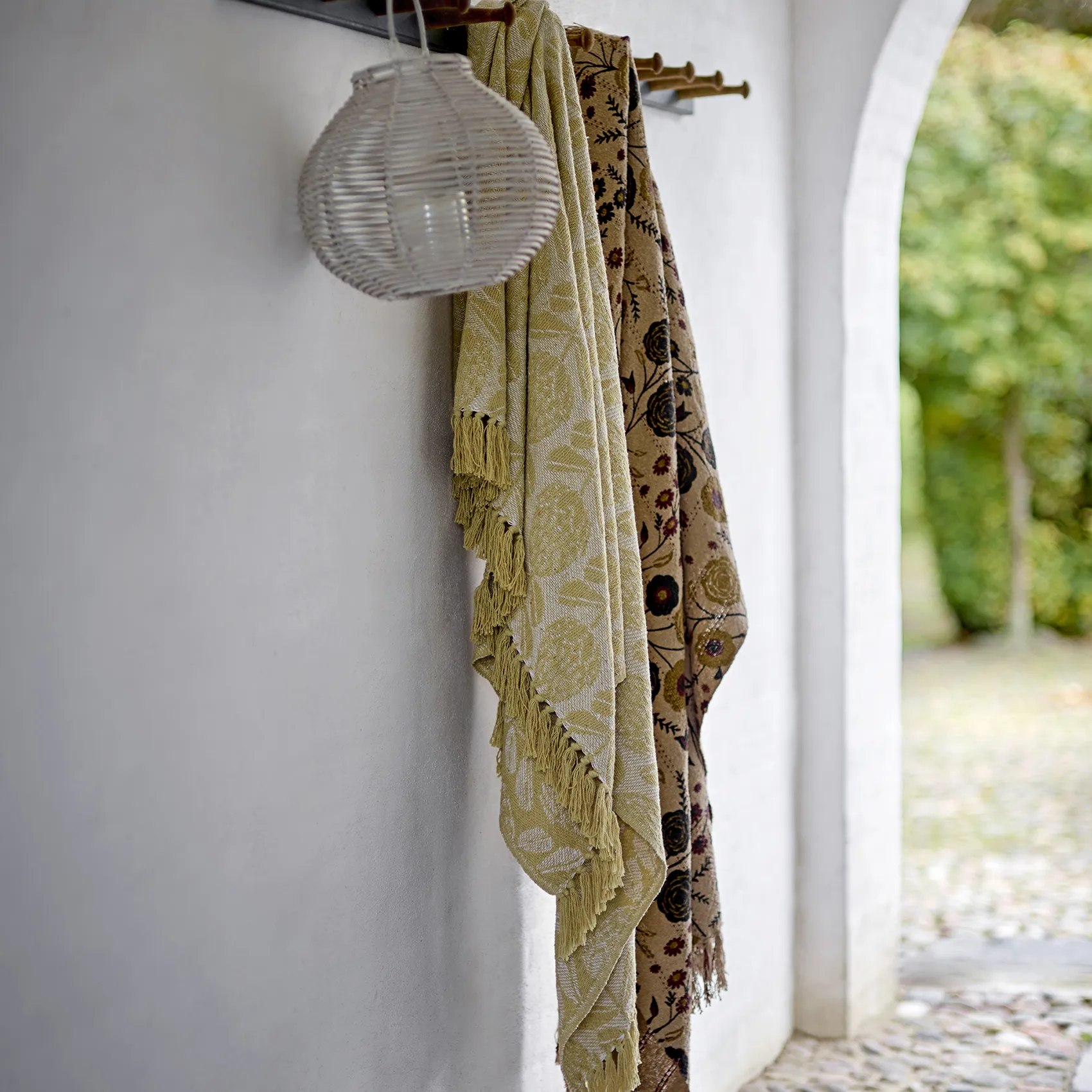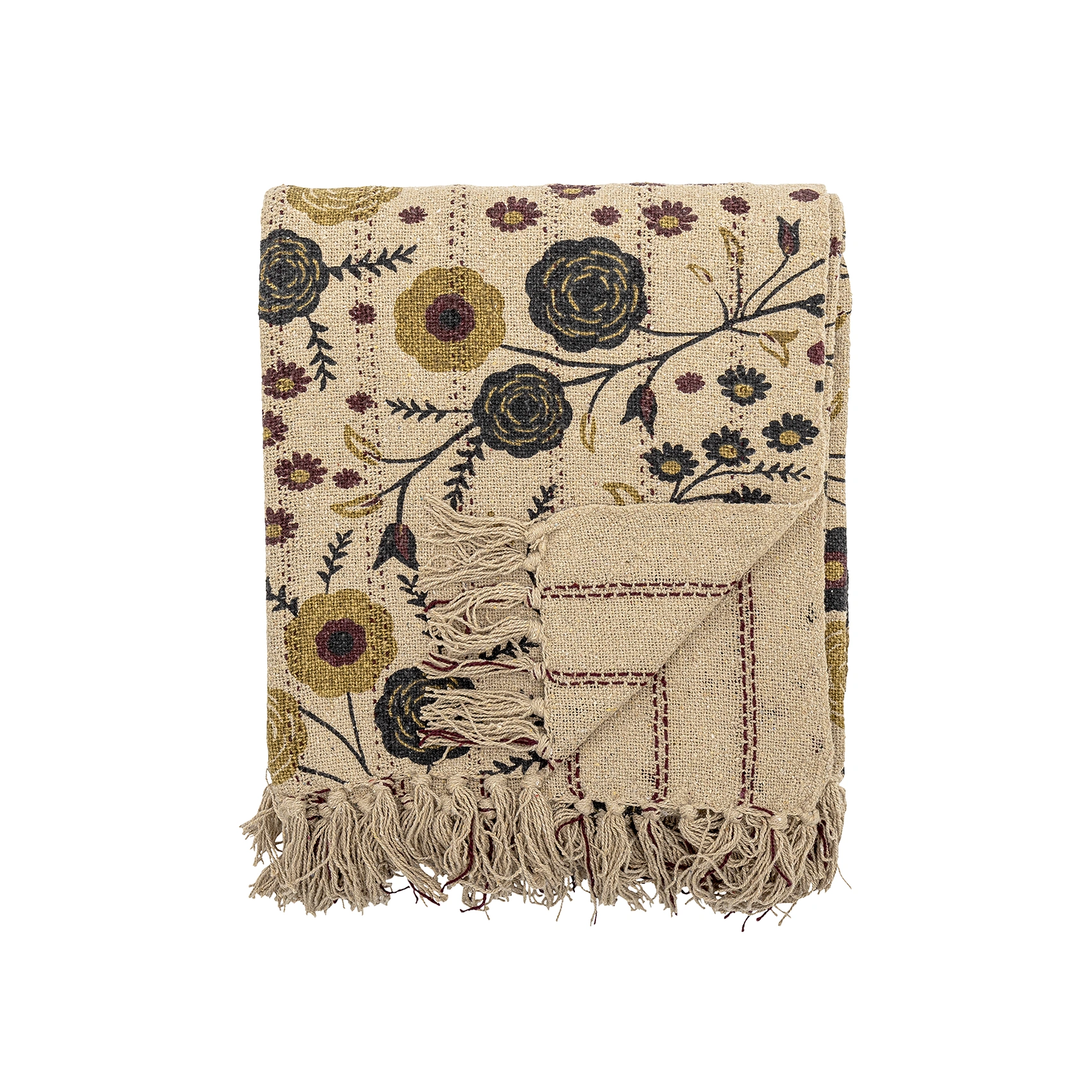 Pläden Eydis från Bloomingville är vävd i återvunnen bomull och har ett blommigt tryck i varma färger. Baksidan är dekorerad med fina vävda ränder och fransar i ändarna som fulländar den mjuka och mysiga looken.