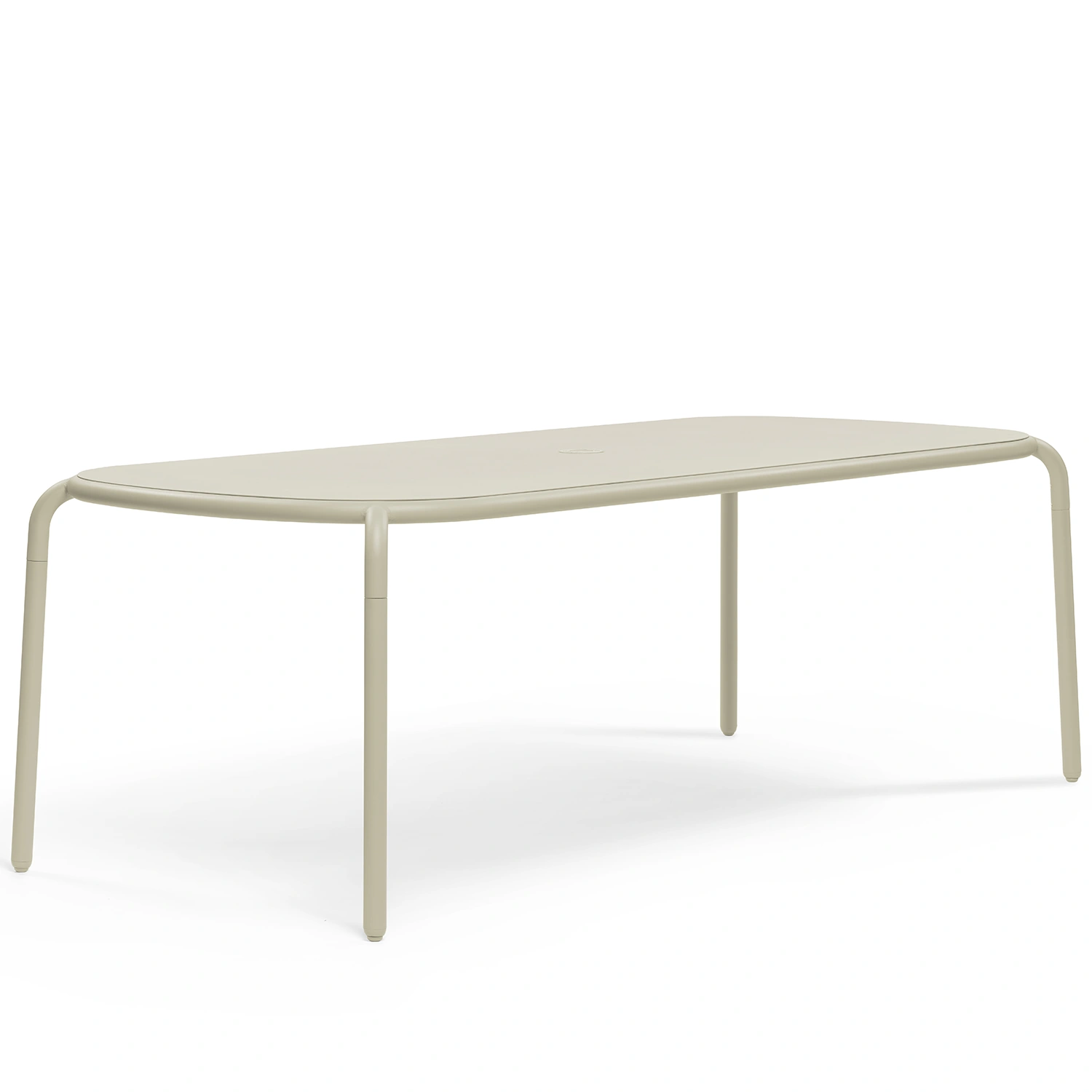 Vill du ha en avslappnad middag utomhus med din familj och vänner? Det låter som Toní Tablo kan hjälpa dig med det. Med en längd på 2,2 meter kan bordet rymma upp till 8 personer. Aluminiummaterialet gör bordet fint och lätt, så att du enkelt kan flytta det. Hålet i mitten är Ø41 mm och fungerar som en parasollhållare under dagen och kan även användas för den trearmade Toní-ljusstaken på natten. De justerbara benen låter dig ändra höjden efter önskemål.