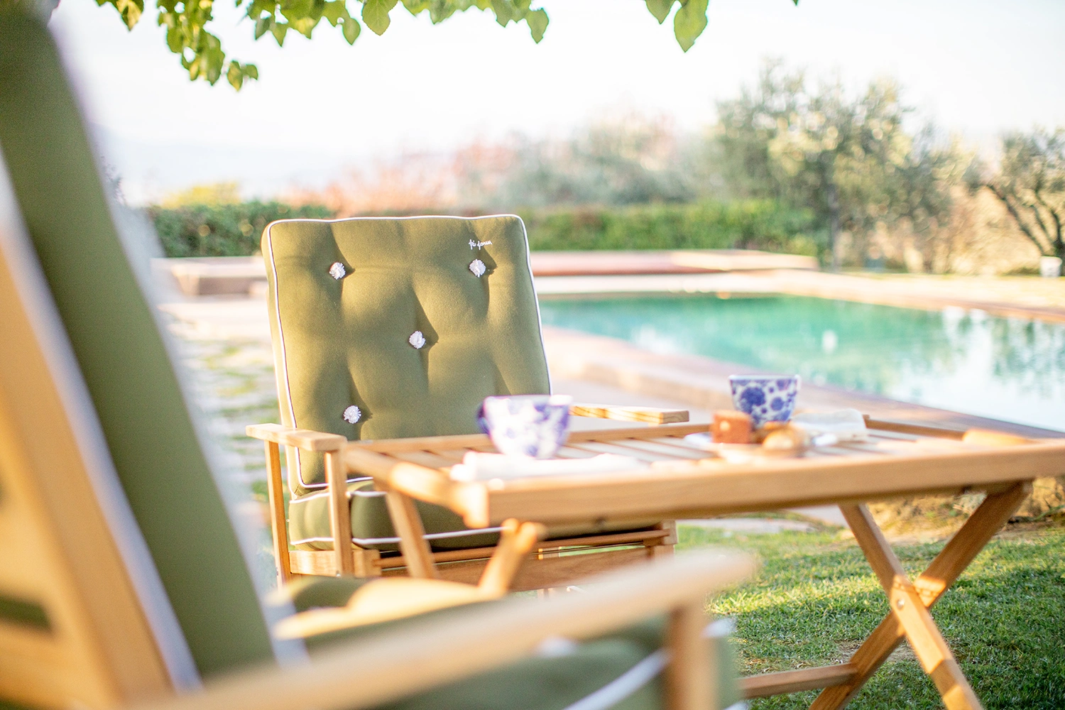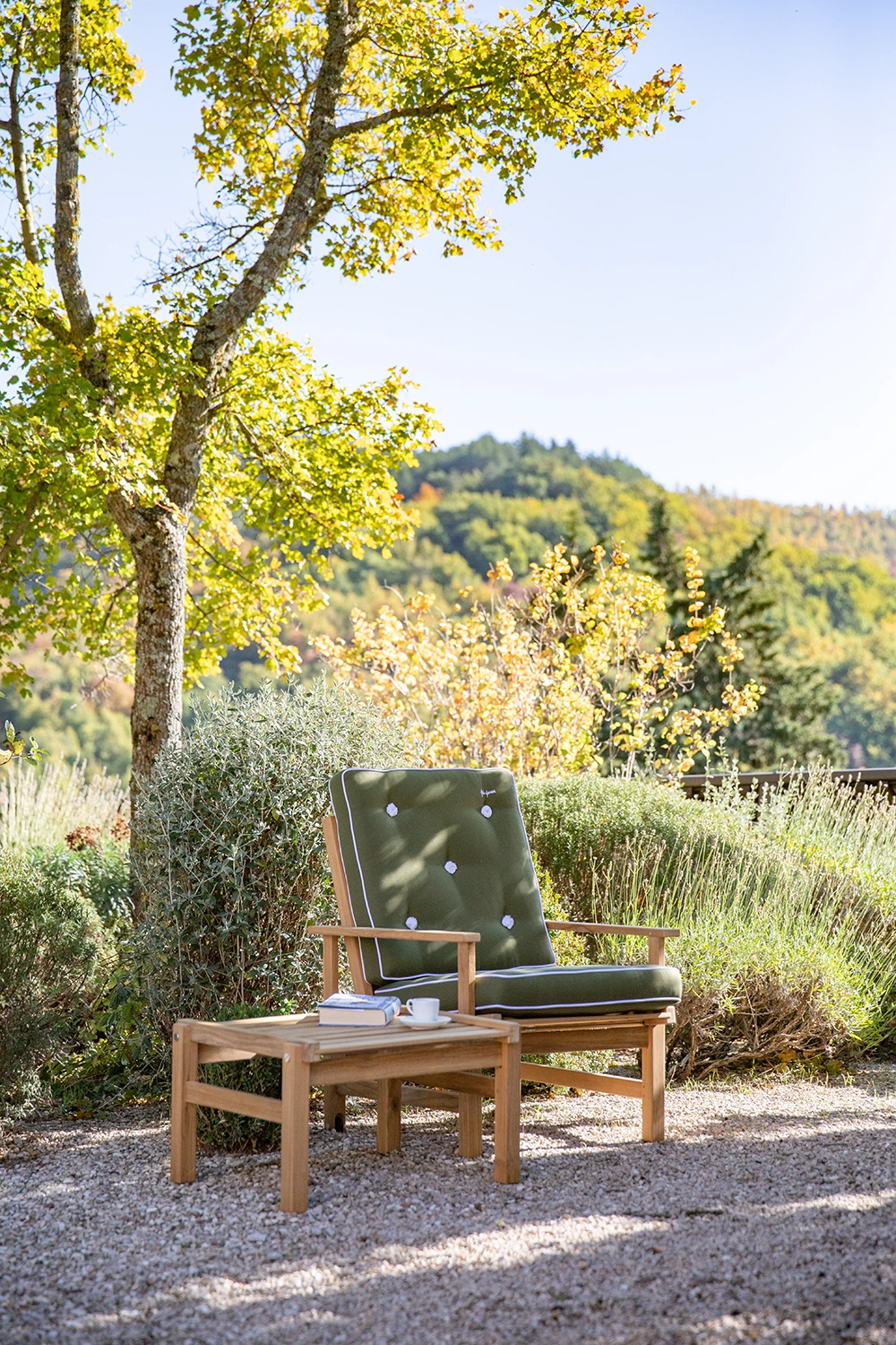 Möbeln är tillverkad i massiv teak, ett slitstarkt och väderbeständigt träslag som kräver minimalt underhåll. Rengör med mild tvållösning och mjuk borste. För att bevara träets ursprungliga färg kan teakolja appliceras vid behov. Vi rekommenderar möbelskydd vid längre perioder utan användning för bästa livslängd.