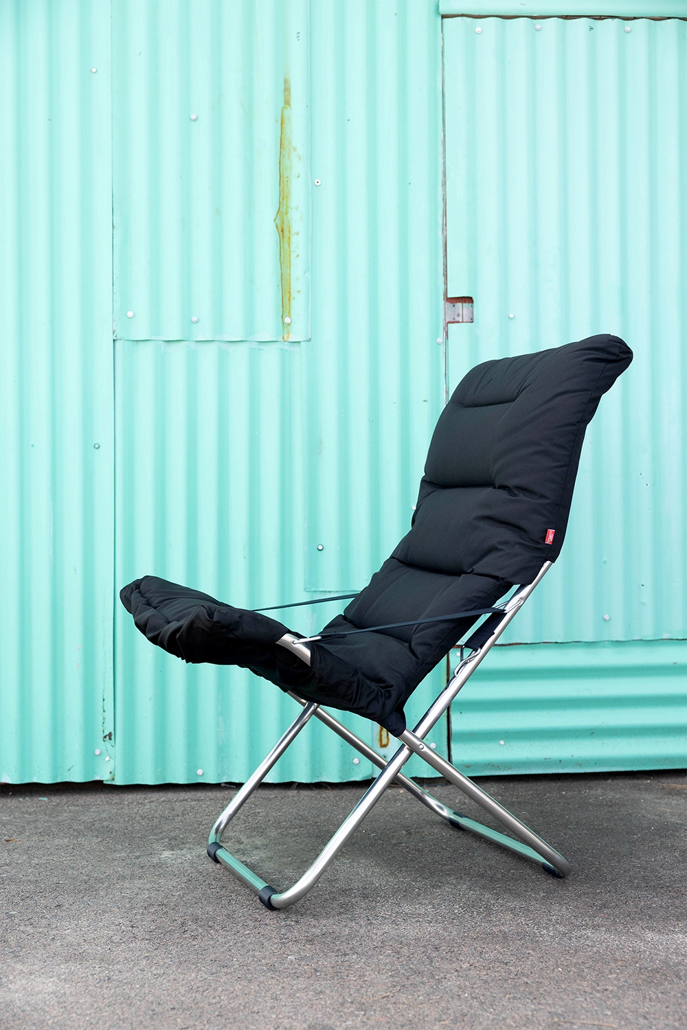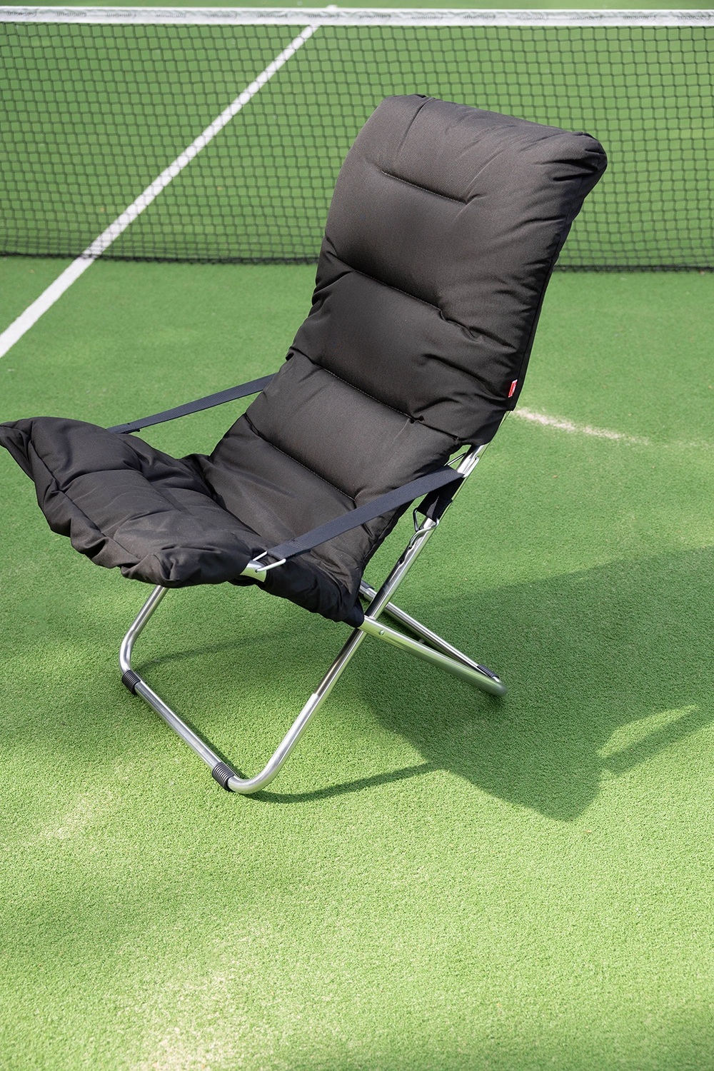 Fiesta är underhållsfri och tillverkad i aluminium samt svart polyester i det bärande tyget, täckt med en tjockare stoppad ”dyna”, här i färgen svart. Till stolen rekommenderas fotpallen Chico Soft som finns i samma färger som Fiesta.