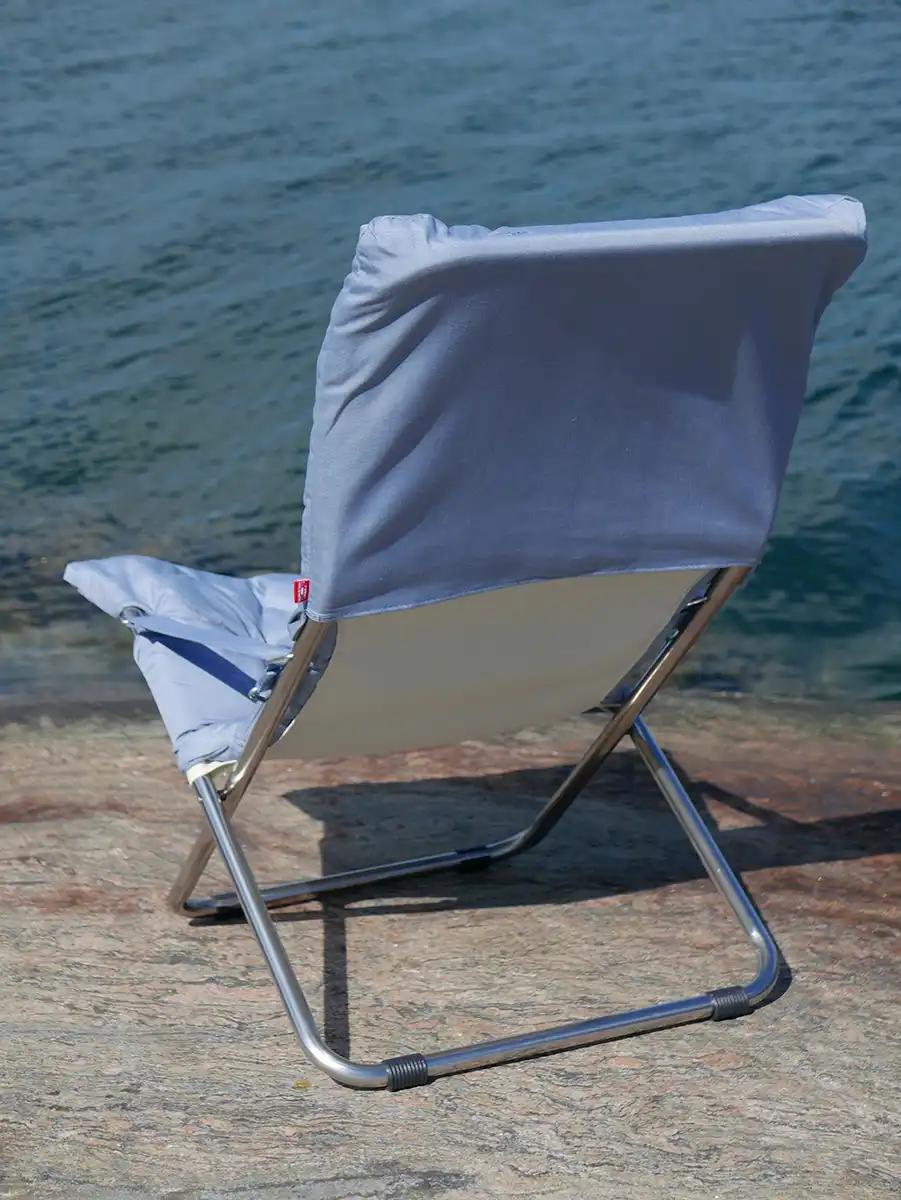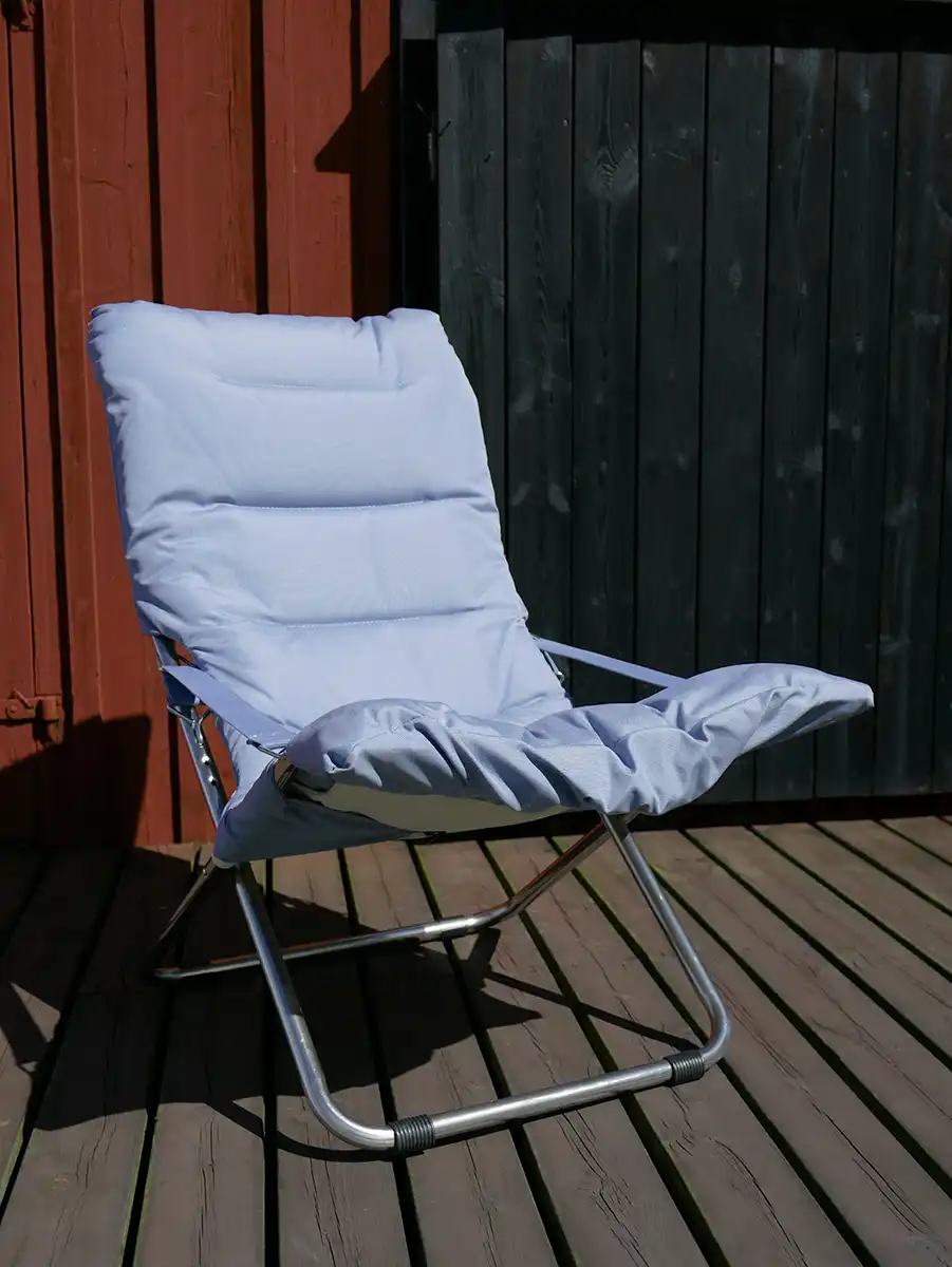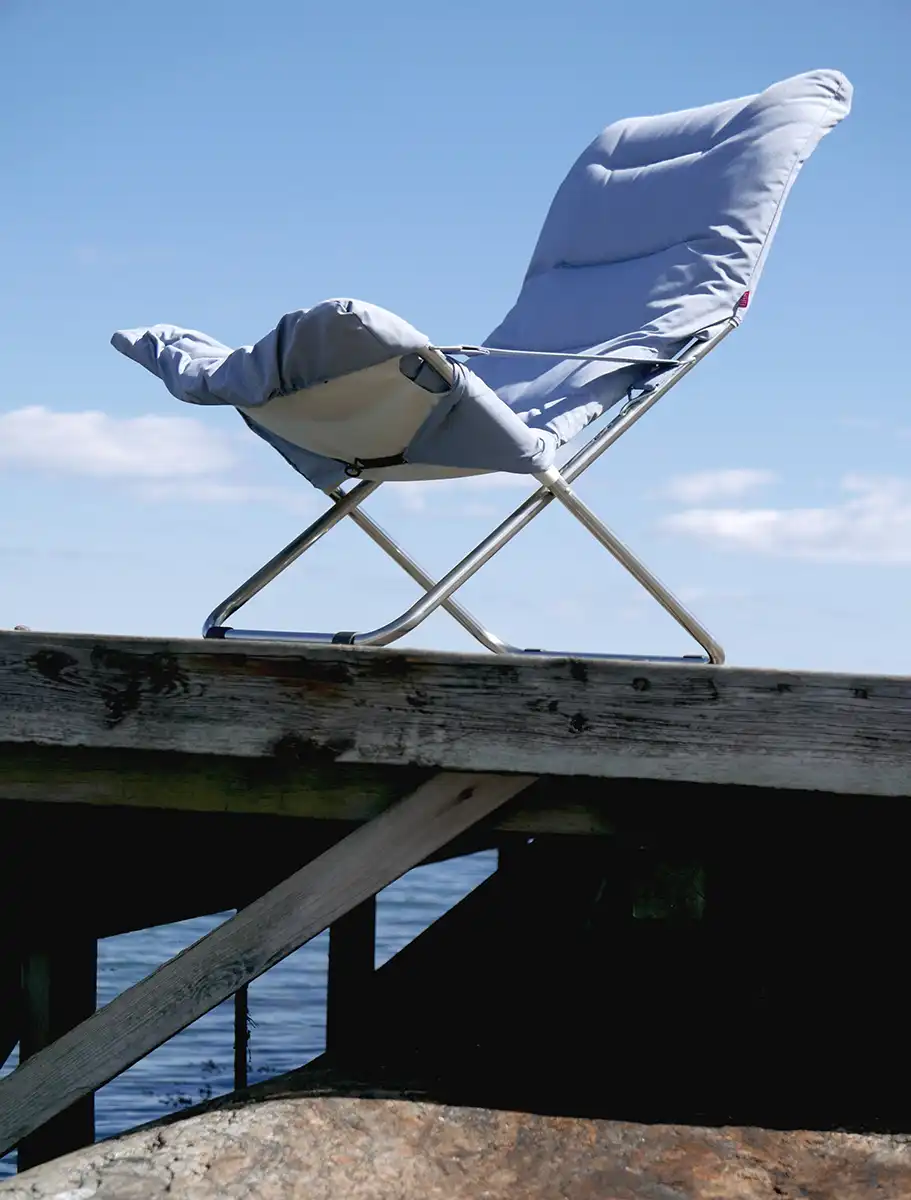 Fiesta är underhållsfri och tillverkad i aluminium samt svart polyester i det bärande tyget, täckt med en tjockare stoppad ”dyna”, här i färgen dusty blue. Till stolen rekommenderas fotpallen Chico Soft som finns i samma färger som stolen.