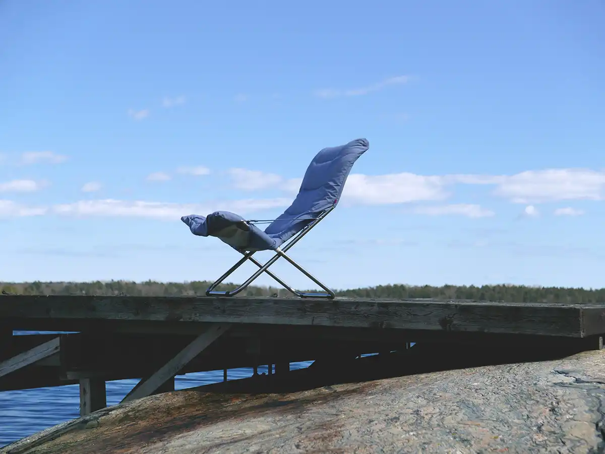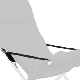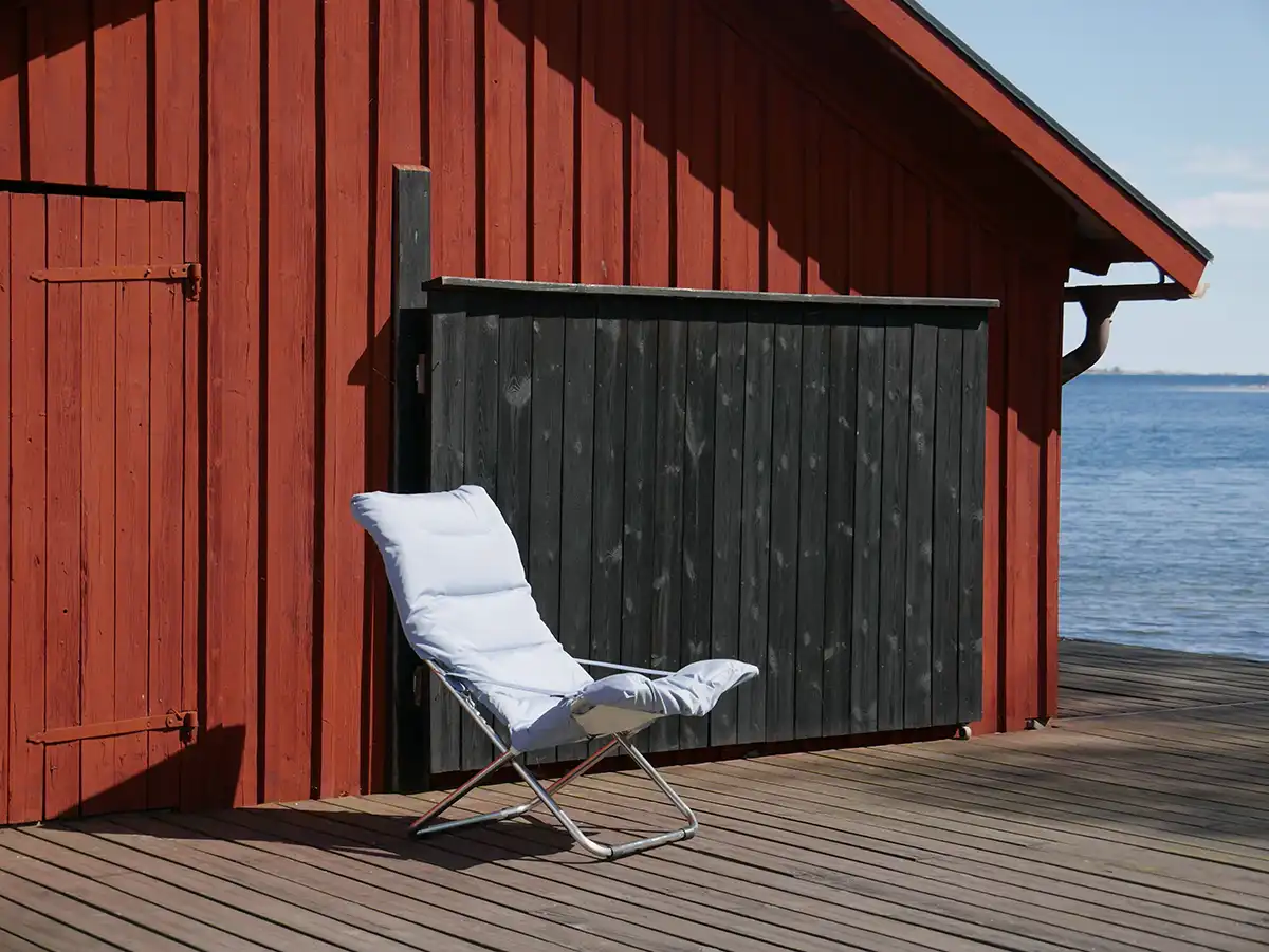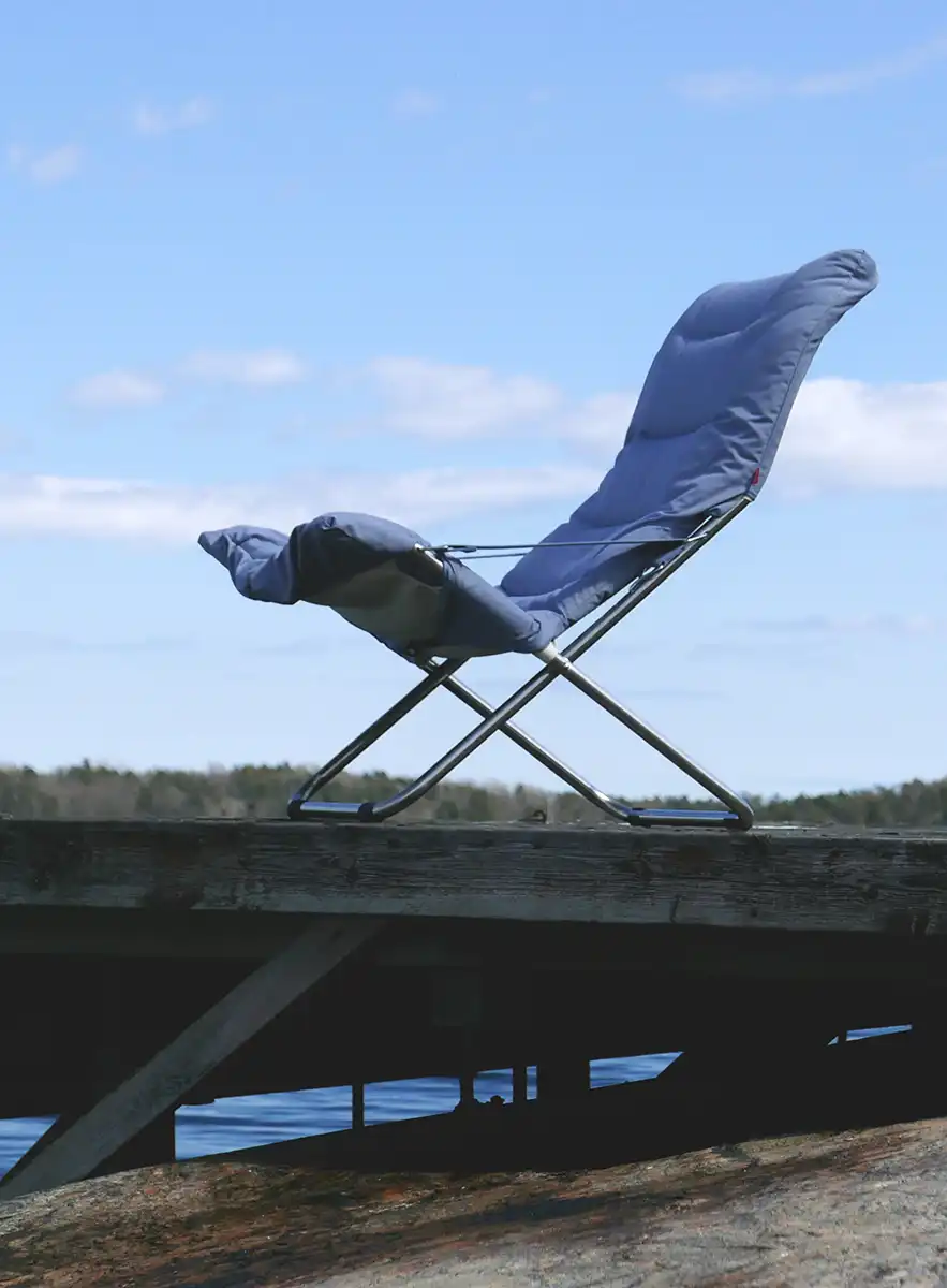 Fiesta är underhållsfri och tillverkad i aluminium samt svart polyester i det bärande tyget, täckt med en tjockare stoppad ”dyna”, här i färgen dusty blue. Till stolen rekommenderas fotpallen Chico Soft som finns i samma färger som stolen.