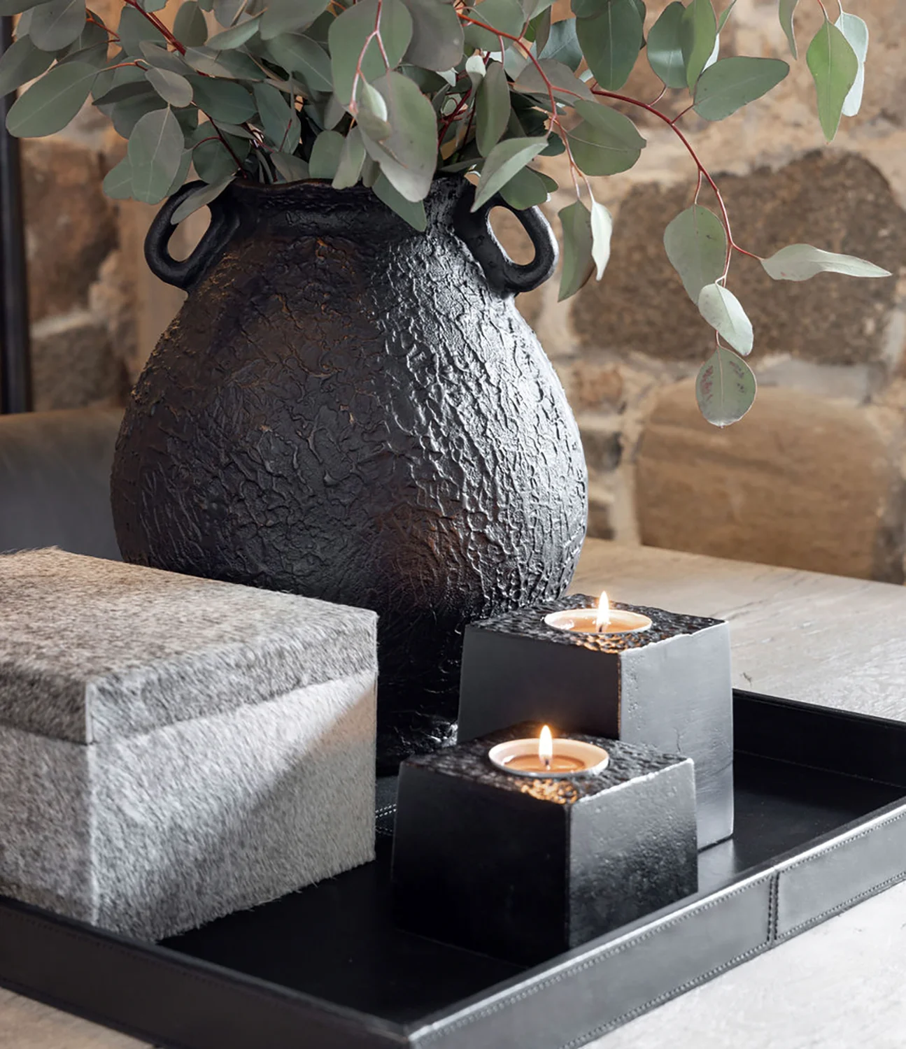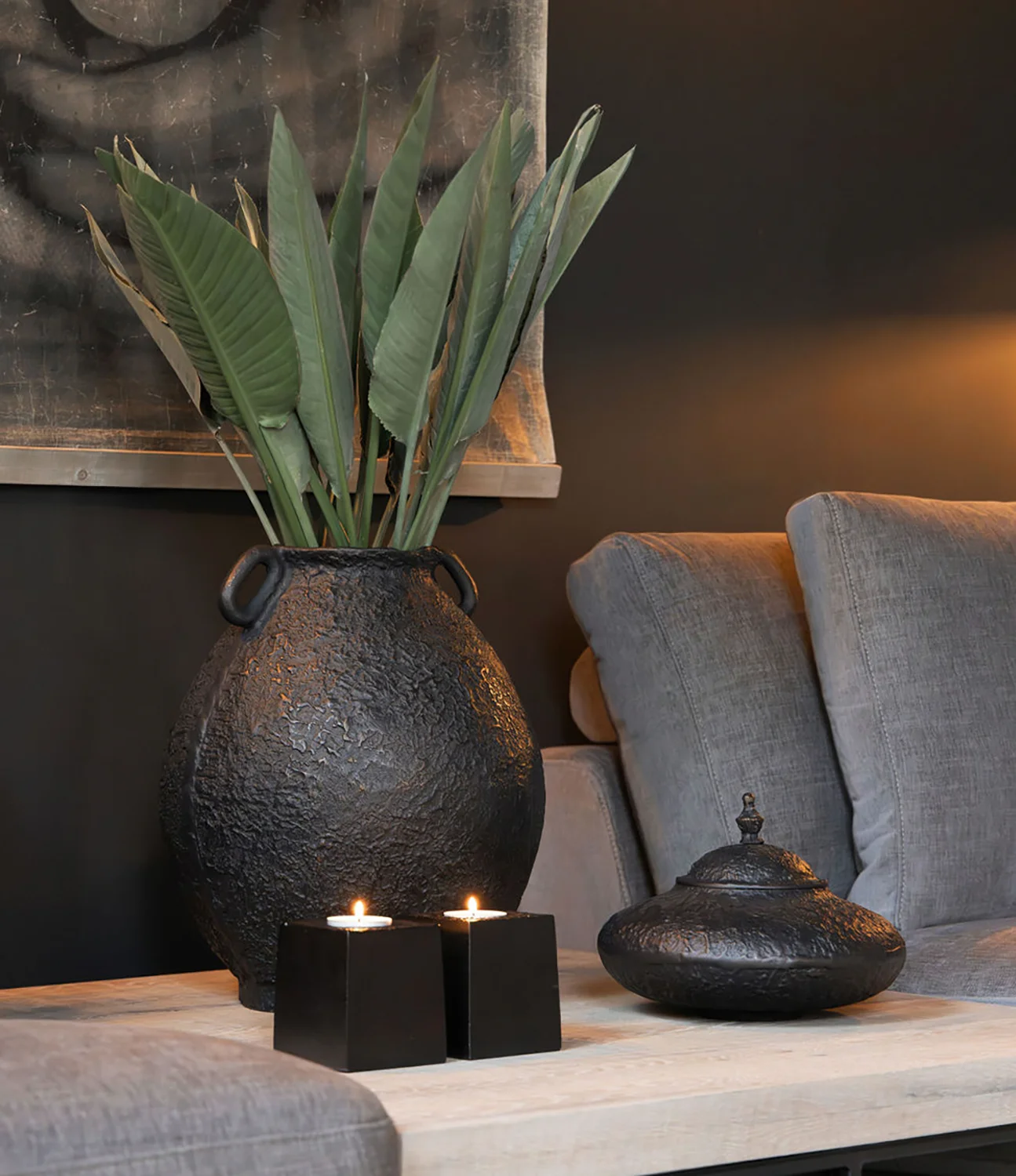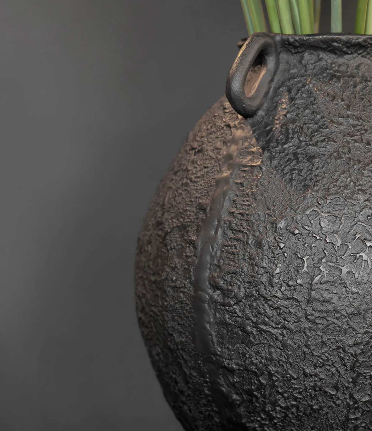 En urna av metall med yta i struktur. Urnan är vackert formad och har handtag.