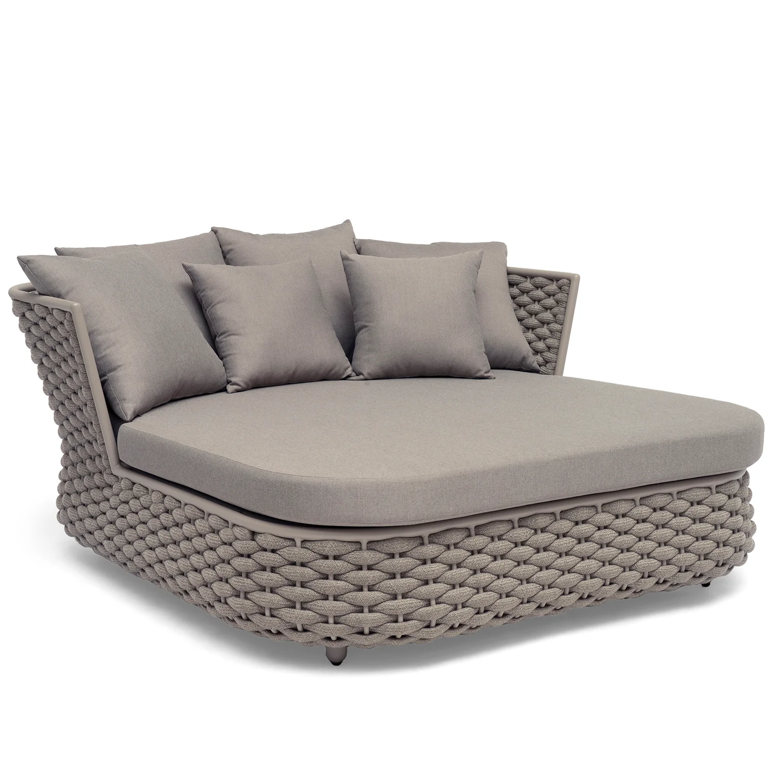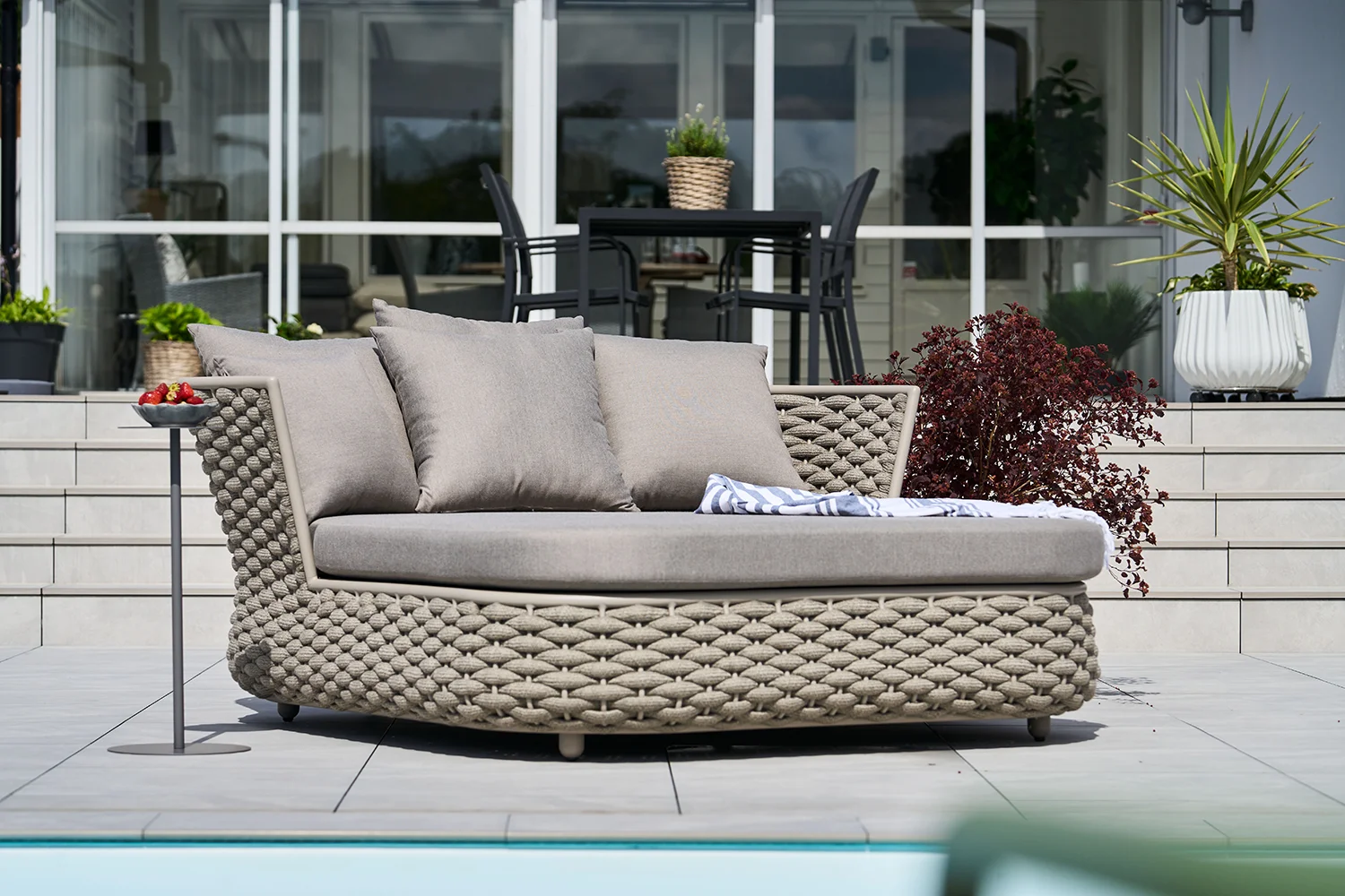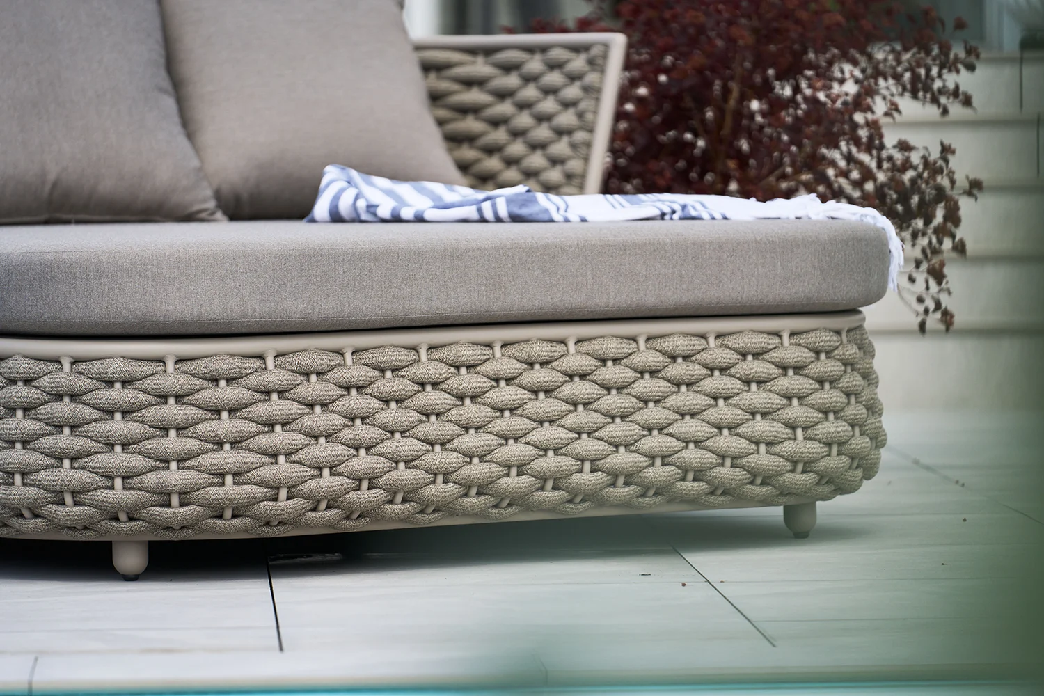 En luxuös och sofistikerad dagbädd för ett bekvämt uteliv. Tillverkad av aluminium med taupefärgade akrylband.