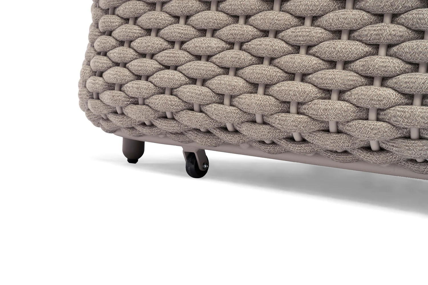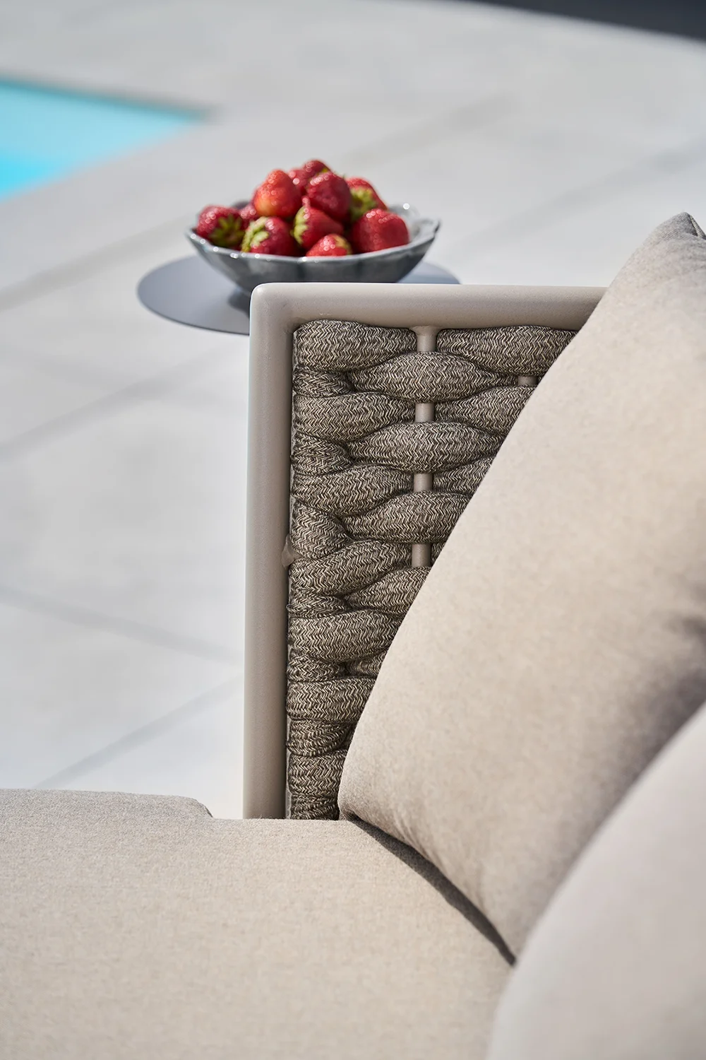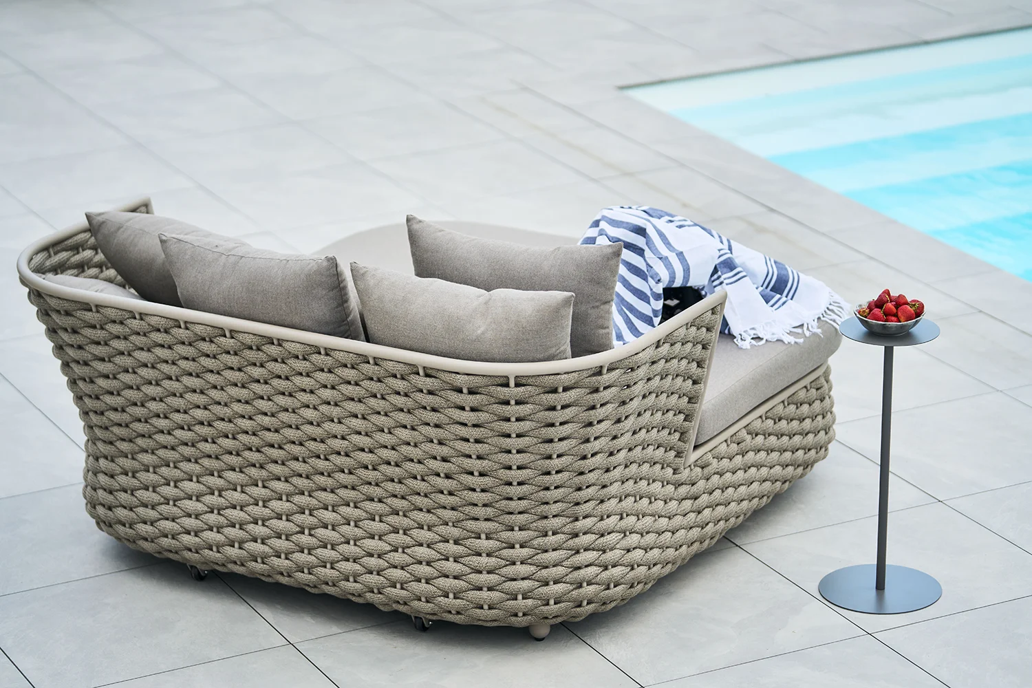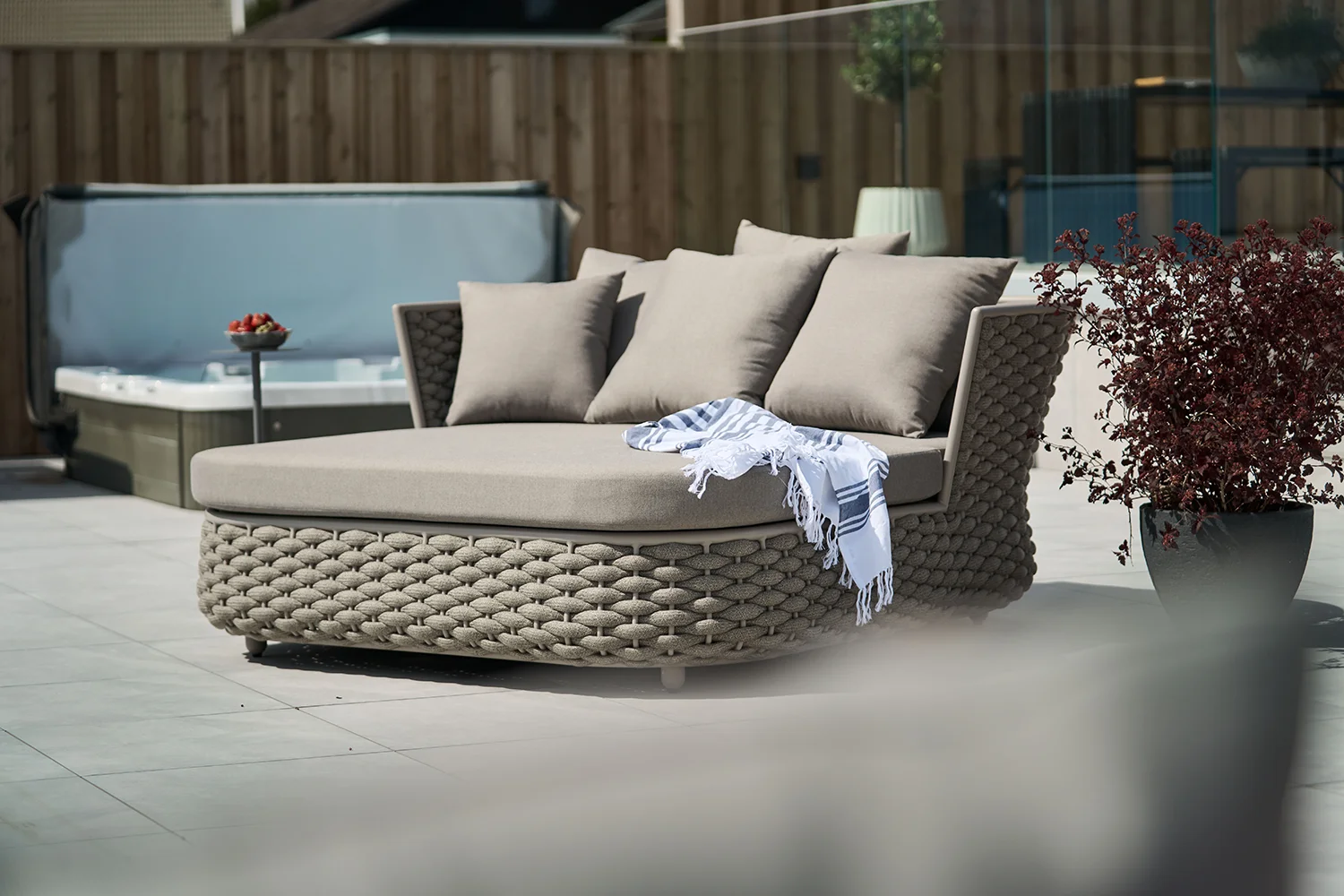 En luxuös och sofistikerad dagbädd för ett bekvämt uteliv. Tillverkad av aluminium med taupefärgade akrylband.
