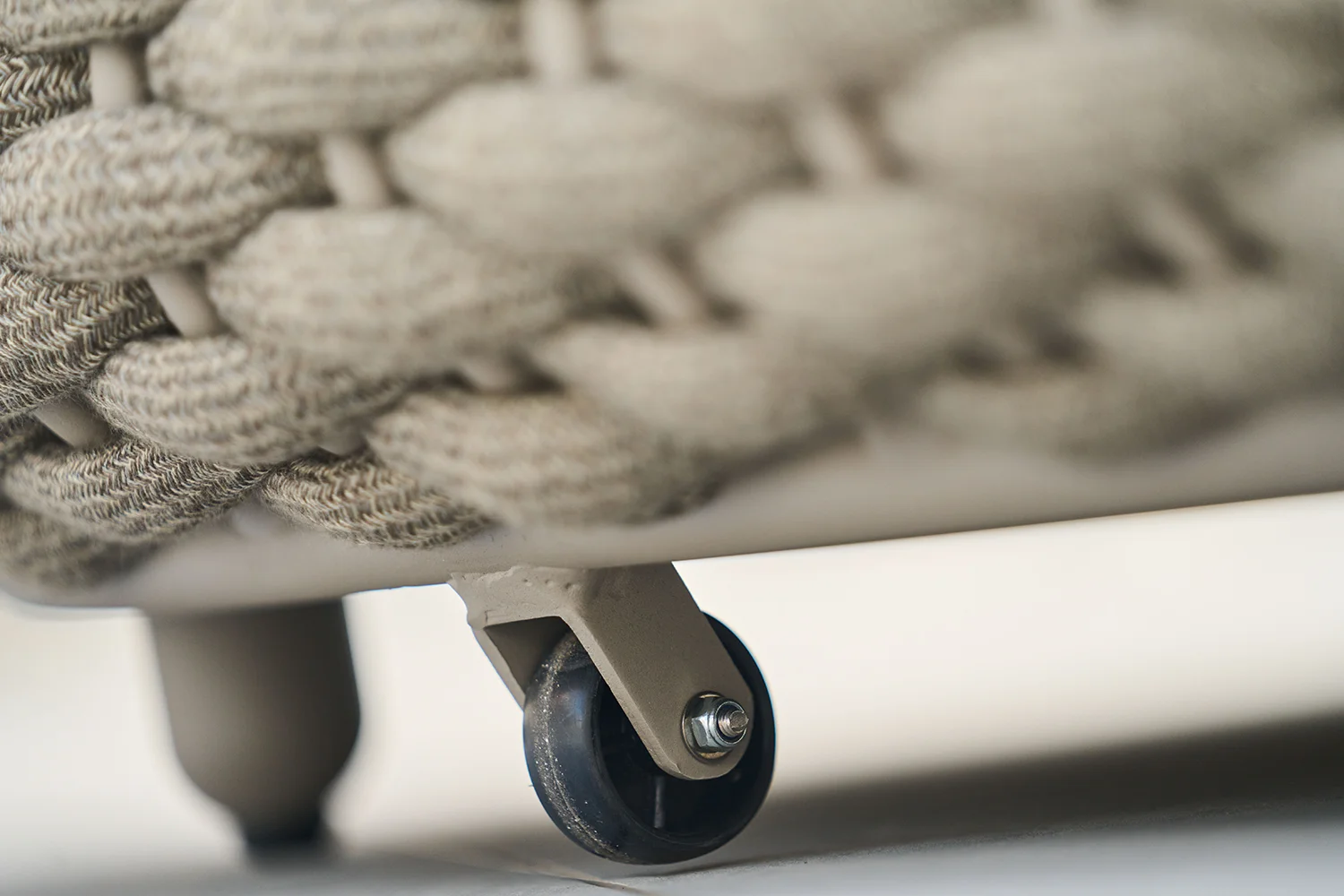 Dagbädden kan enkelt förflyttas med hjälp av hjulanordning. Dynor i akryltyg som är vattenavvisande och motståndskraftigt mot fläckar. UV-beständighet 6-7/8. Dynorna har avtagbar klädsel och kan tvättas i 40 grader. Skräddarsytt möbelöverdrag i polyester medföljer.
