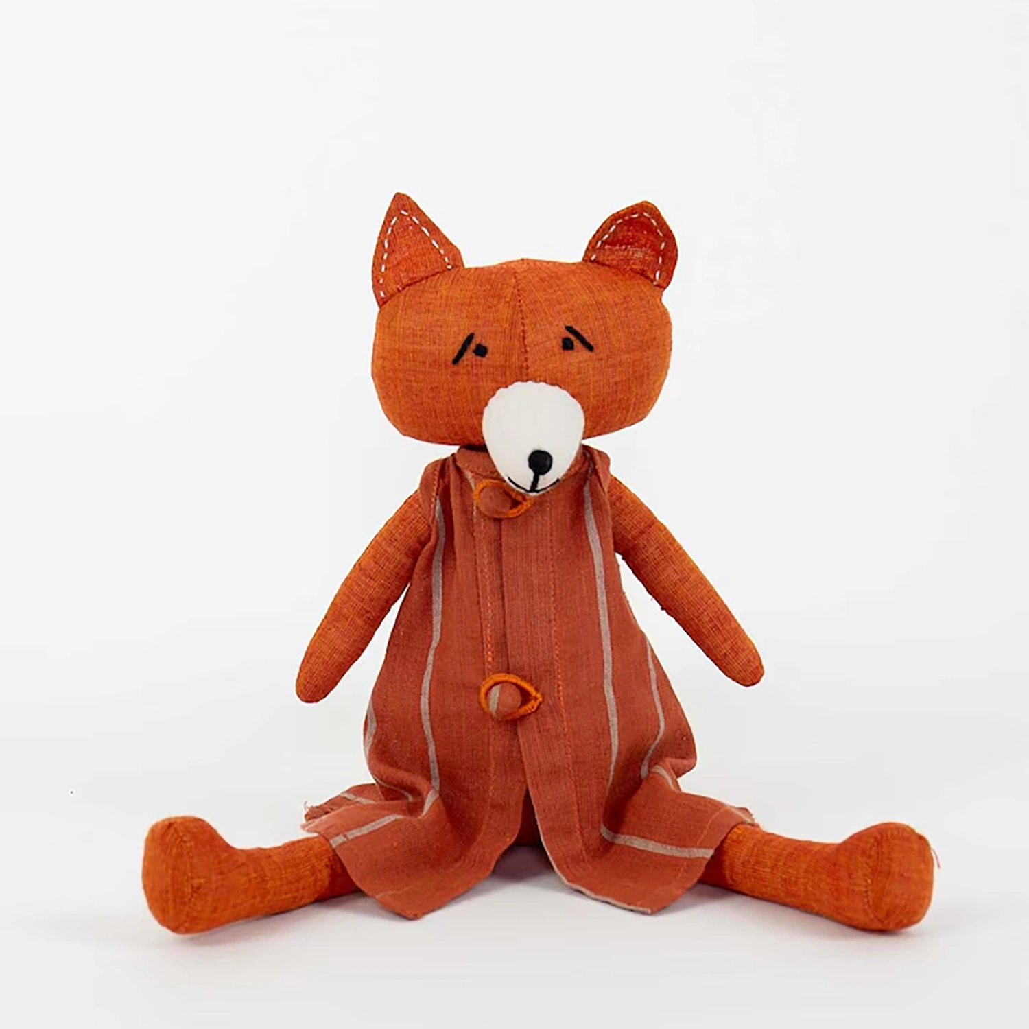 Mjukisdjuret föreställer en räv klädd i en rostbrun, randig klänning. En fin detalj i barnrummet eller som gåva till någon liten.