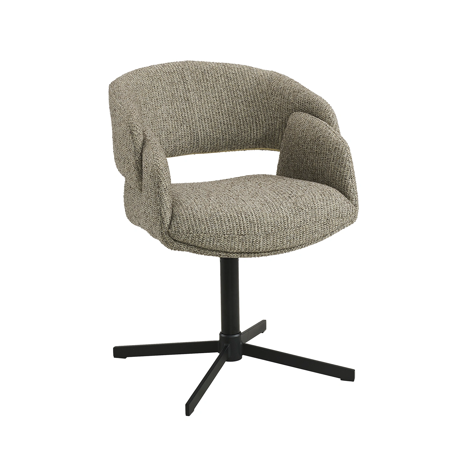 En modern matstol med snurrfunktion och elegant design som kombinerar komfort med praktisk flexibilitet. Den rundade ryggformen med öppet ryggparti skapar ett luftigt uttryck och erbjuder samtidigt bra stöd. Det strukturvävda tyget ger stolen både djup och karaktär.