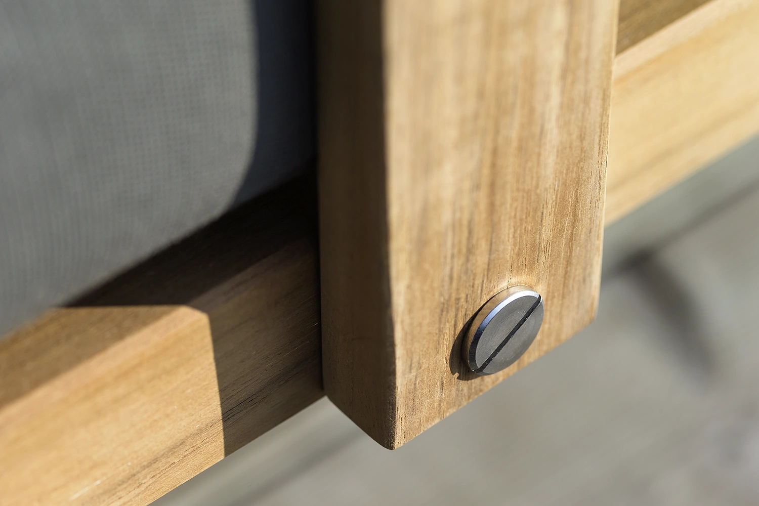 Möbeln är tillverkad i massiv teak, ett slitstarkt och väderbeständigt träslag som kräver minimalt underhåll. Rengör med mild tvållösning och mjuk borste. För att bevara träets ursprungliga färg kan teakolja appliceras vid behov. Vi rekommenderar möbelskydd vid längre perioder utan användning för bästa livslängd.