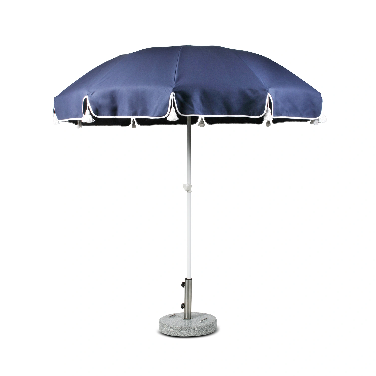 Fri Form Parasoll mörkblå är ett elegant parasoll med marin känsla som kompletterar din uteplats med klassisk design. Parasollet har ett vitlackerat stålstativ och en slitstark duk i dralon – ett tyg som är väderbeständigt och enkelt att underhålla. De nedhängande tofsarna och kanterna med vit paspoal ger en tidlös och exklusiv känsla.