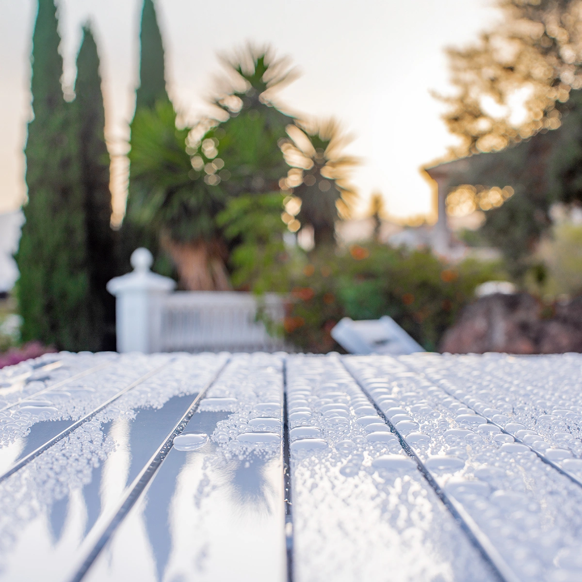 Bordet är tillverkat i aluminium med lackerad yta som skyddar mot rost och slitage. Rengör enkelt med mild tvållösning och mjuk trasa. Undvik starka kemikalier och slipande material för att bevara den eleganta epoxy-finishen. Möbeln kräver ingen ytterligare behandling och kan stå ute året runt, men vi rekommenderar möbelskydd vid längre perioder utan användning för bästa livslängd.