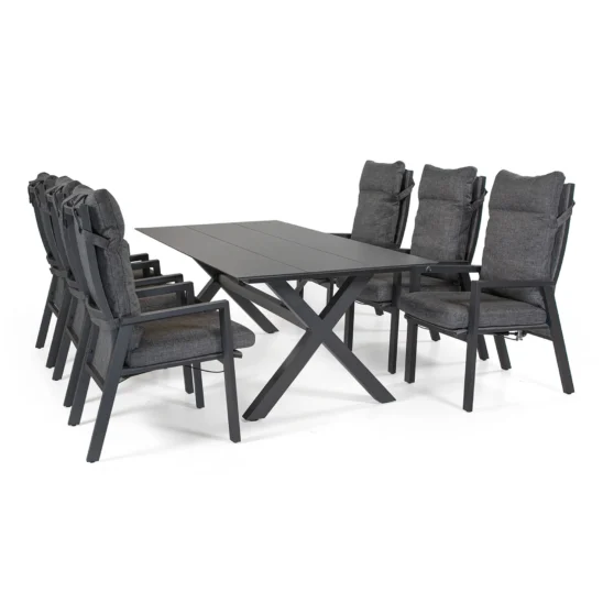 Georgia Lyx cafégruppen är en bekväm grupp bestående av ställbara positionsstolar inkl. bekväma dynor i olefintyg och ett cafébord i aluminium med ribbor av laminat.