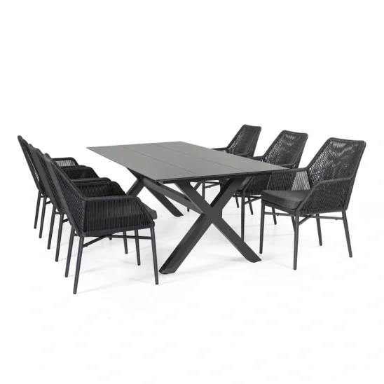 Stolarna finns i två varianter, Georgia och Georgia Lyx, den sistnämnda som visas här är större, kraftigare och har en tjockare dyna. Stomme av aluminium och flätning av antracitgrå 2-line konstrotting.