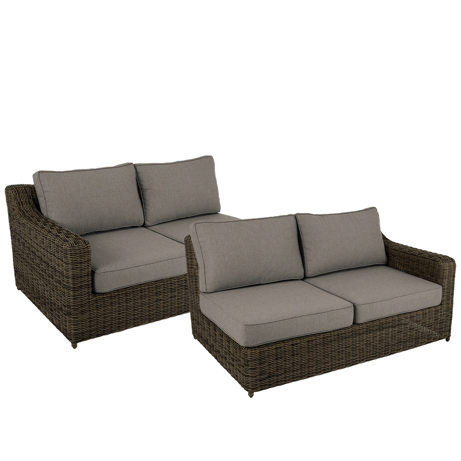 Glendon avslutsdelar består av två moduler – en högerdel och en vänsterdel. Den rundade stommen i konstrotting ger ett rustikt och inbjudande uttryck, medan dynorna i varmt beige tillför mjukhet och komfort.