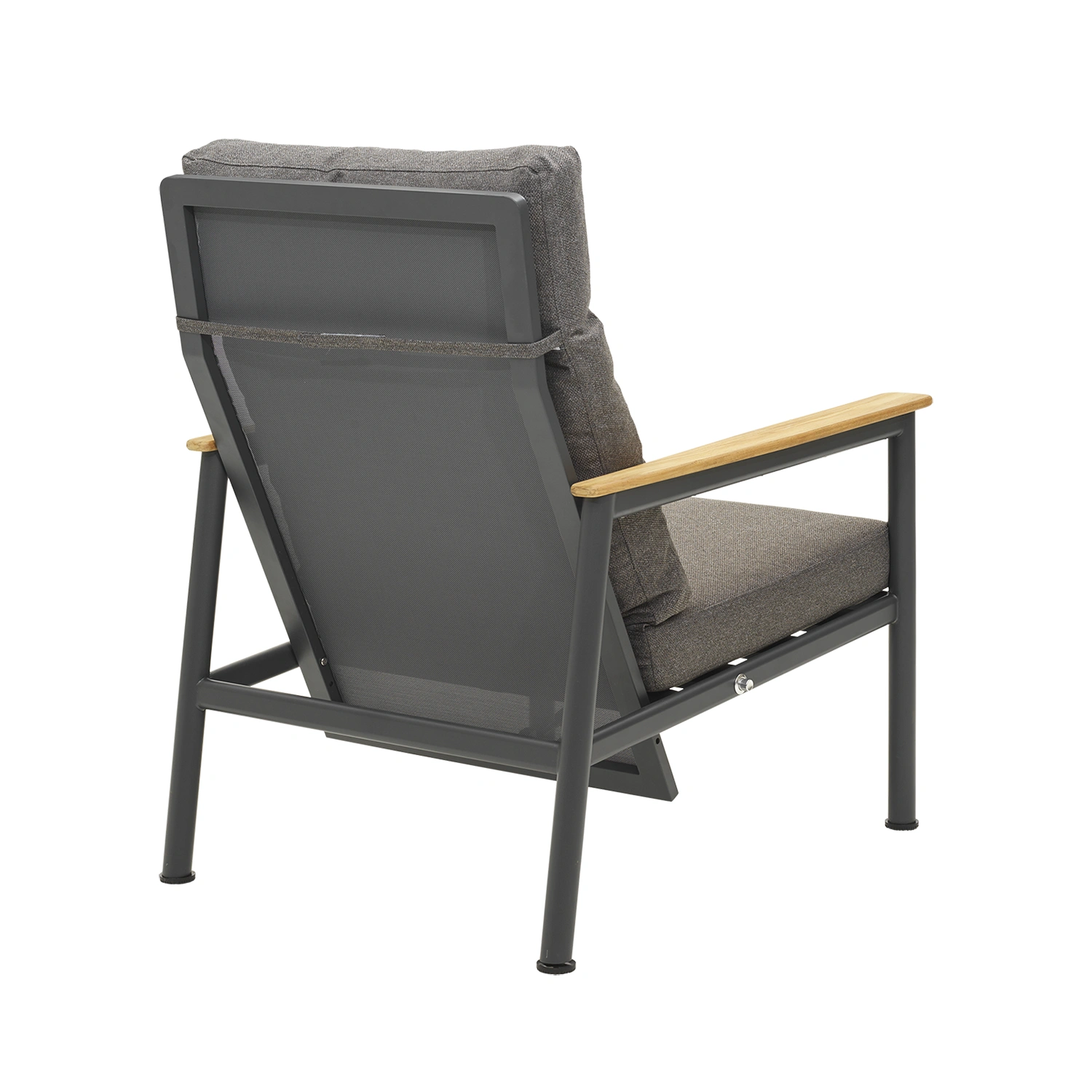 Den antracitgrå aluminiumstommen ger ett modernt och robust intryck, medan armstöden i teak tillför en varm, naturlig kontrast. Dynorna i den mjuka färgen Soft Dawn är klädda i tyg av återvunnen polyester och har en vattenavvisande TPU-liner på insidan – perfekt för nordiskt uteliv.