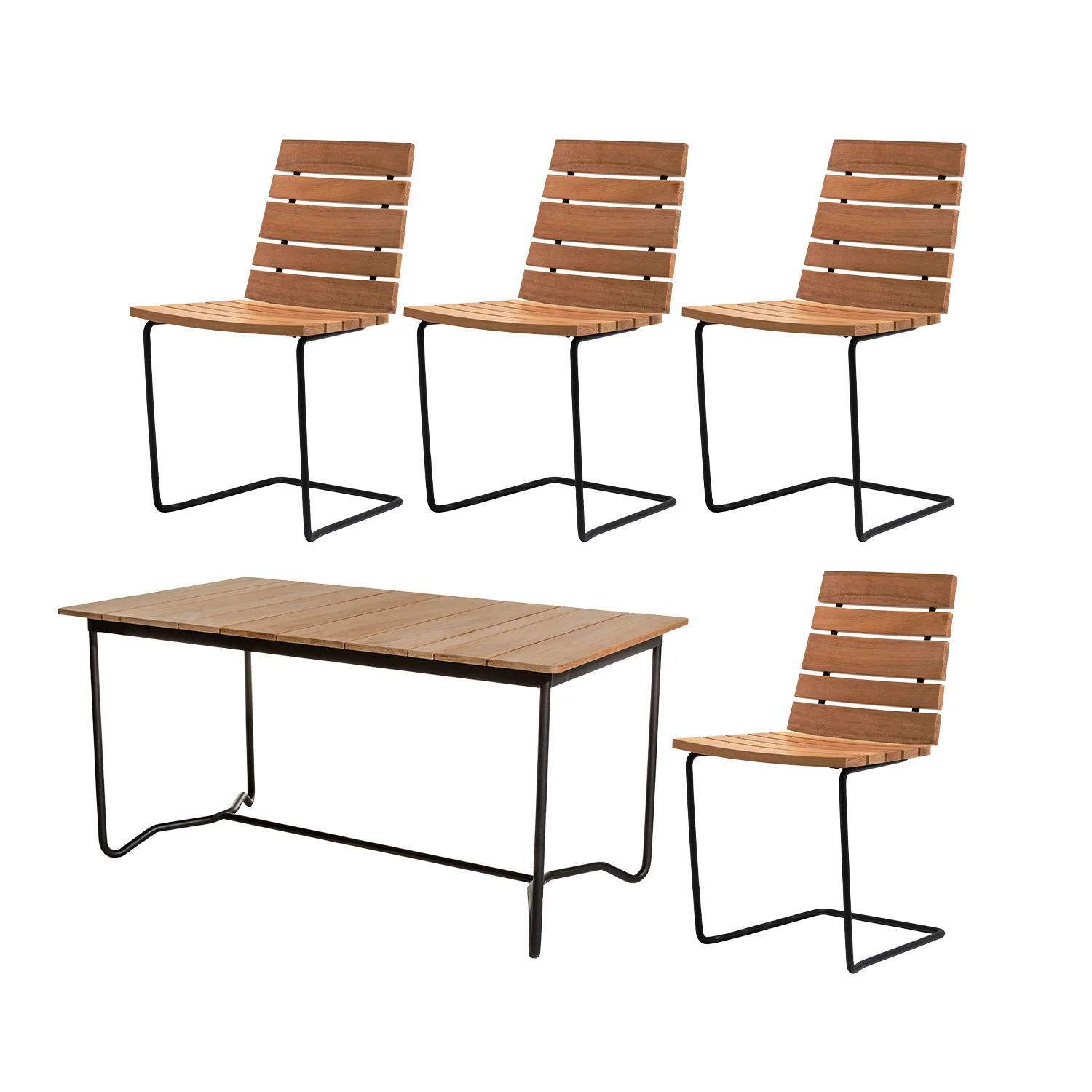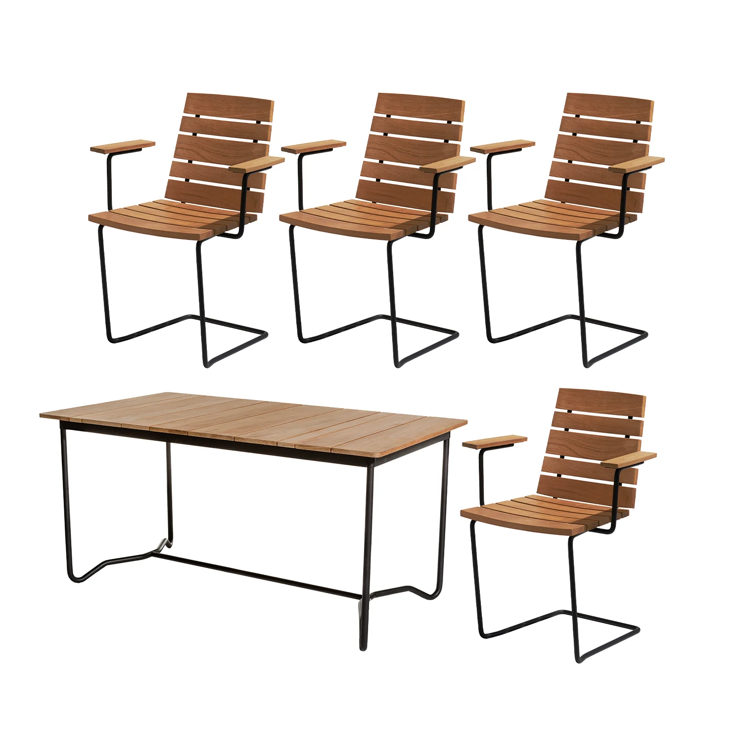 Lätt matserie för utomhusmiljöer som består av en stol, en karmstol och fyra bord i olika storlekar. I teak med svartmålat stativ i fjäderstål. Trots ett avskalat yttre gör den sviktade ramen och de rundade träribborna stolen mycket bekväm. Du kan välja att olja teaken en gång om året för att bibehålla utseendet eller avstå från det och se hur den får en vackert silvergrå ton med tiden.