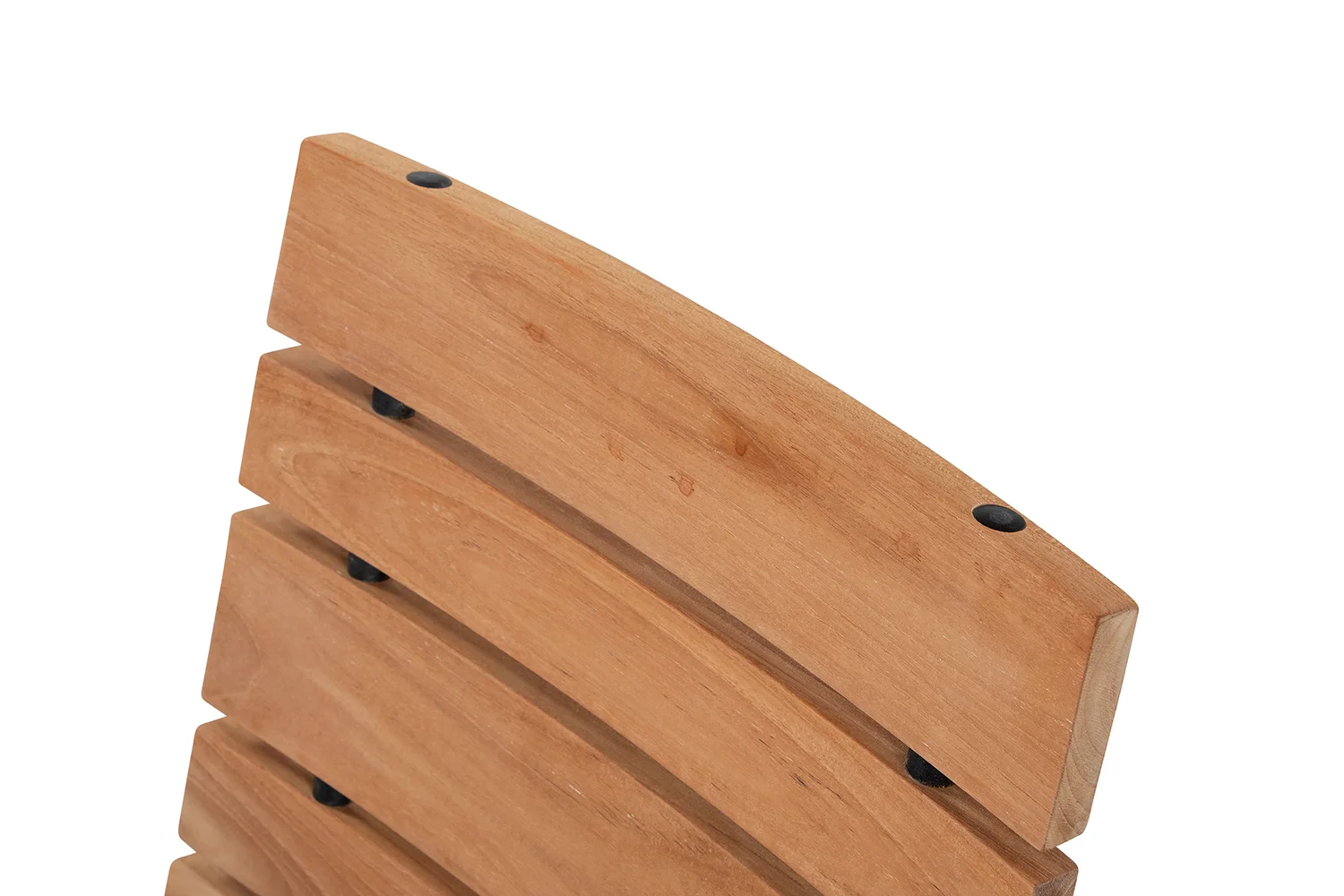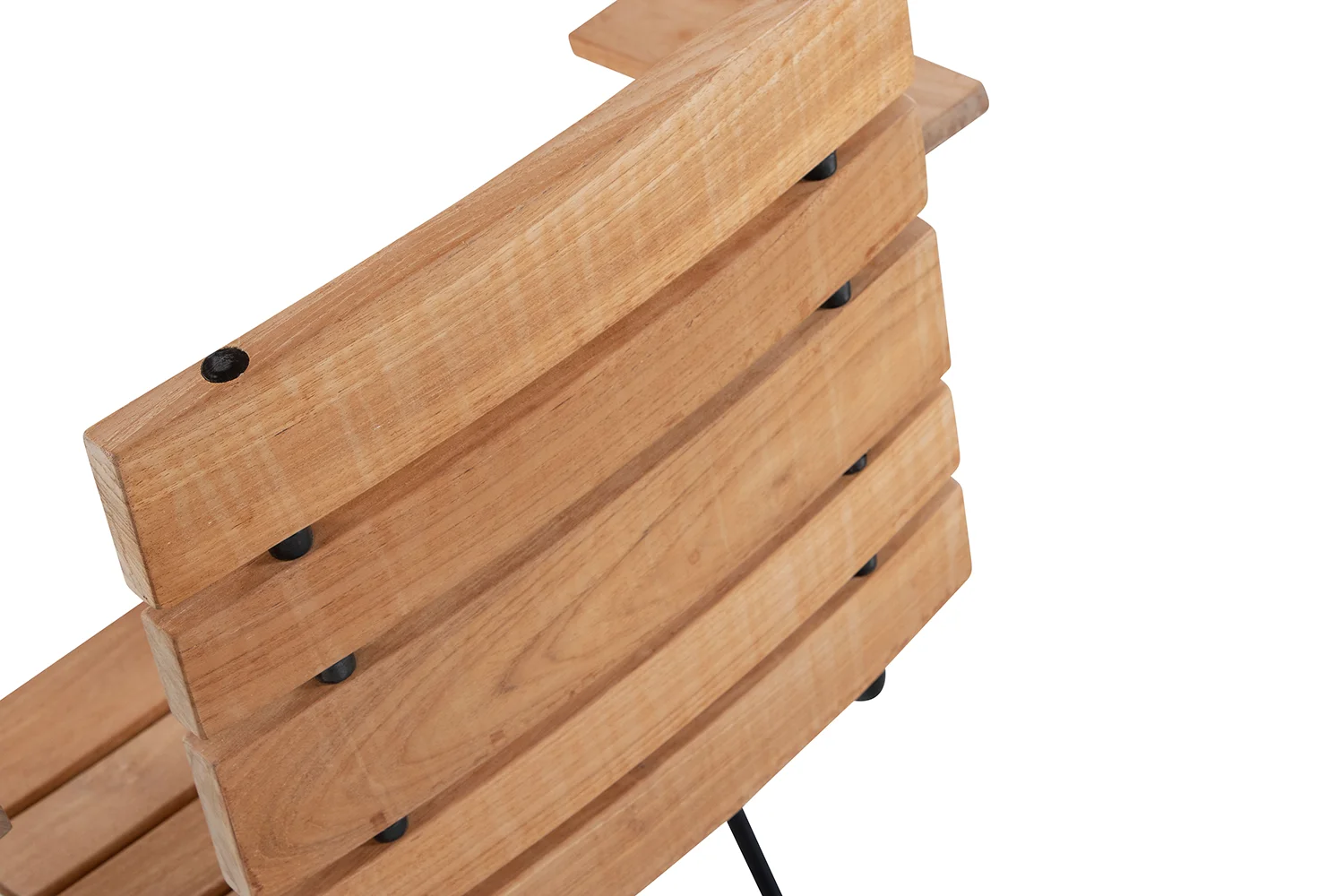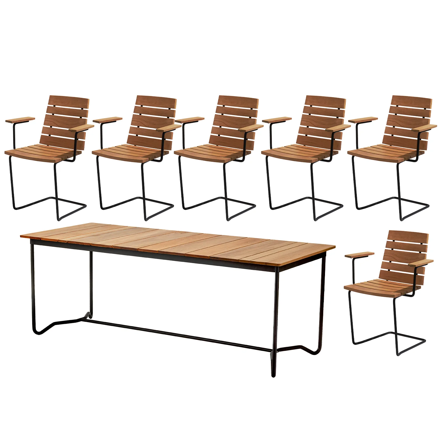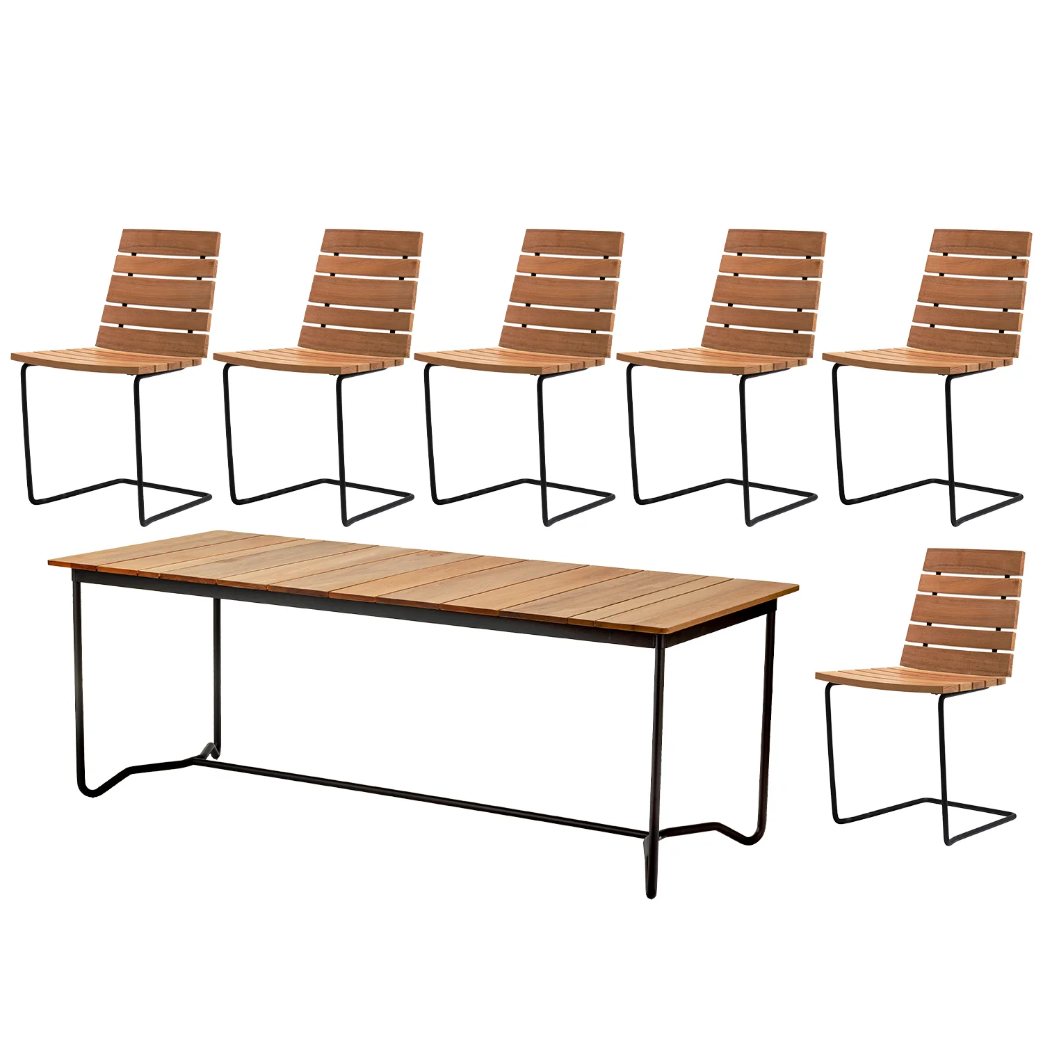 Lätt matserie för utomhusmiljöer som består av en stol, en karmstol och fyra bord i olika storlekar. I teak med svartmålat stativ i fjäderstål. Trots ett avskalat yttre gör den sviktade ramen och de rundade träribborna stolen mycket bekväm. Du kan välja att olja teaken en gång om året för att bibehålla utseendet eller avstå från det och se hur den får en vackert silvergrå ton med tiden.
