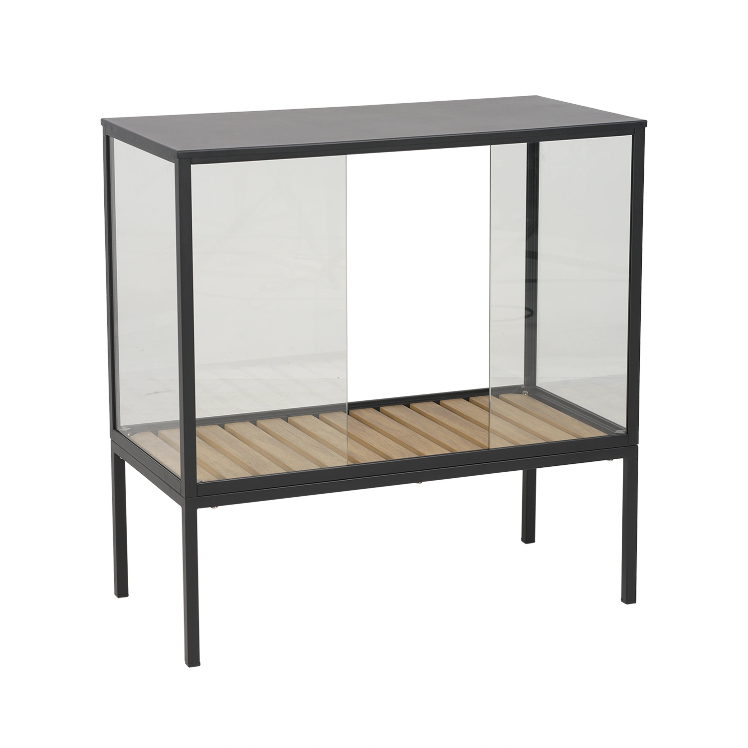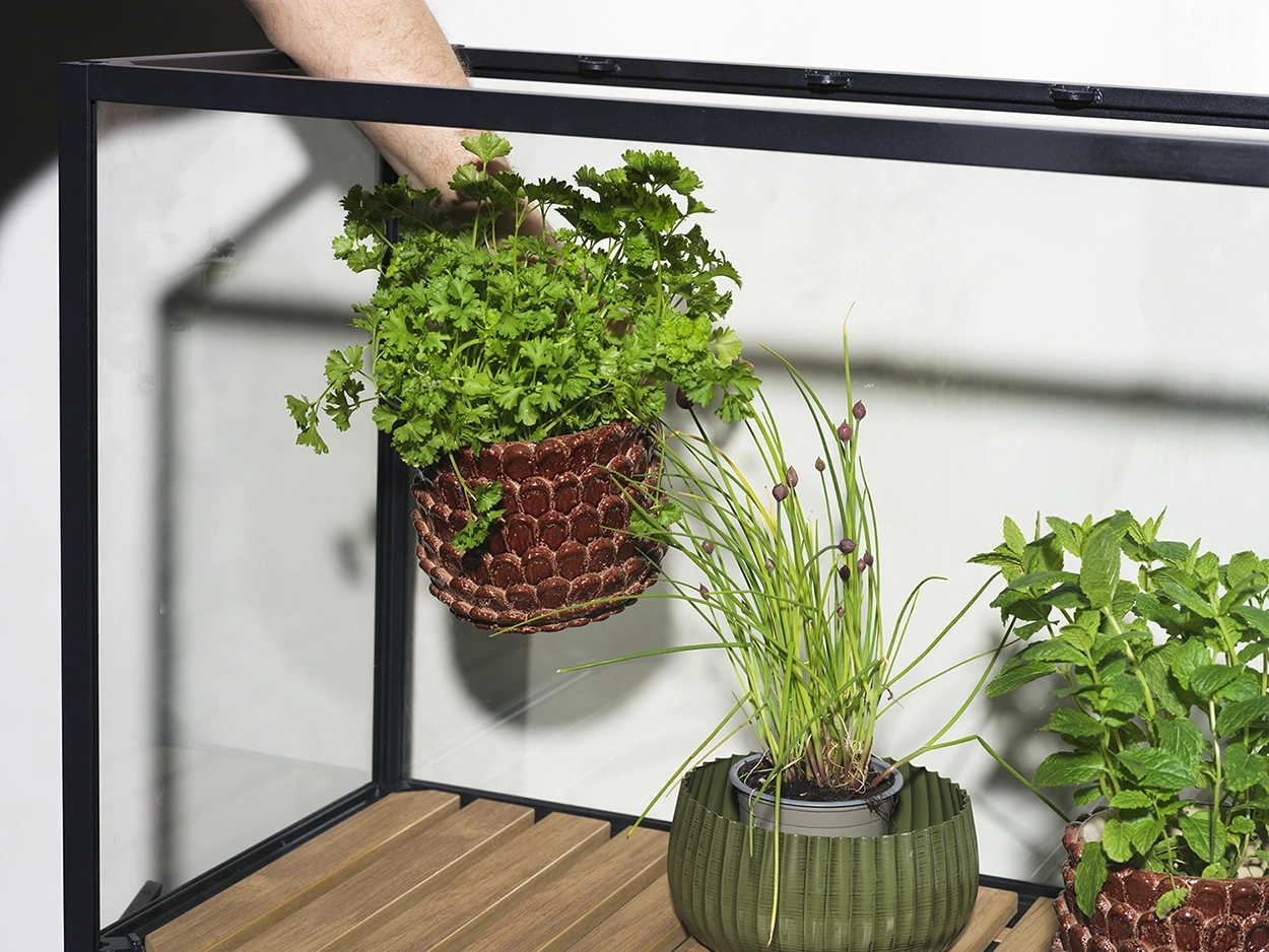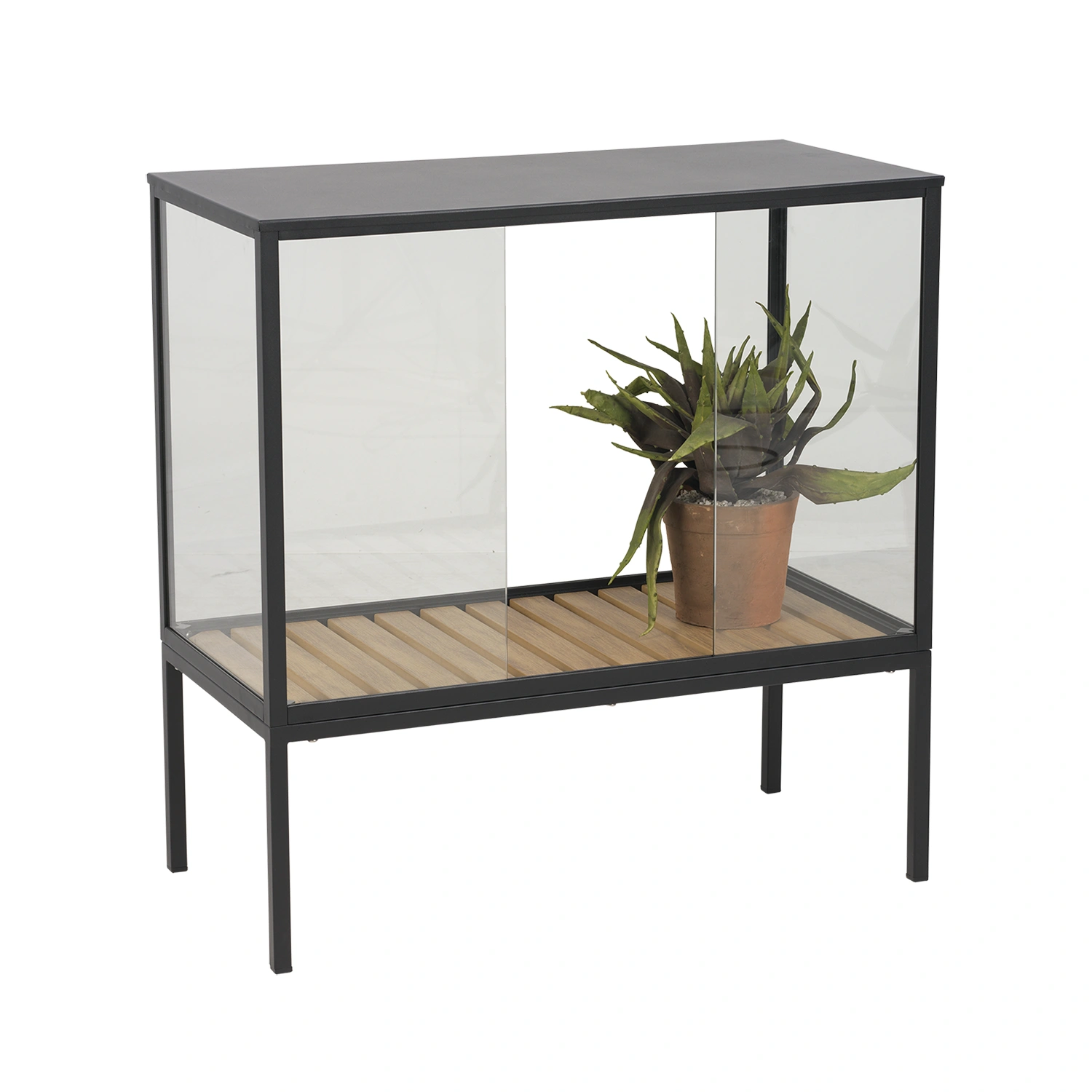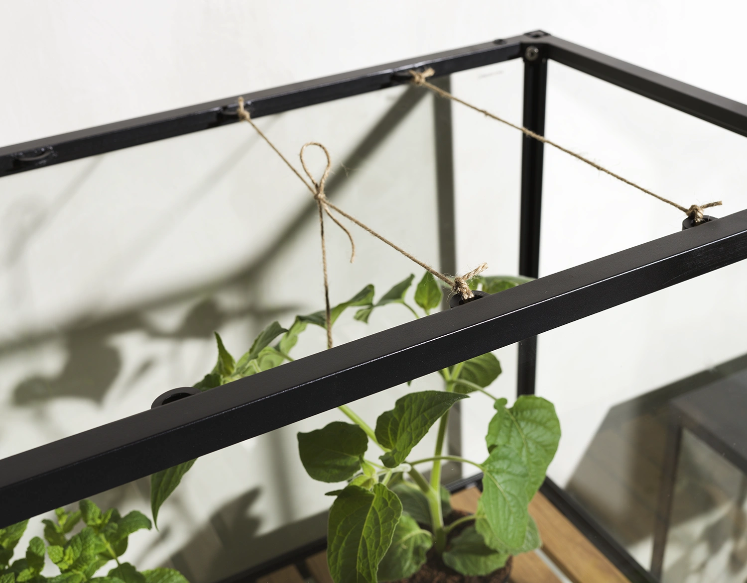 Skåpet har ett stabilt hyllplan i Nonwood (syntetiskt trä) som ger gott om plats för förkultivering, kryddor, blommor eller små grönsaker. Konstruktionen är tillverkad i pulverlackerad aluminium för lång hållbarhet och rostskydd, medan härdat glas ger både ett elegant uttryck och extra tålighet.