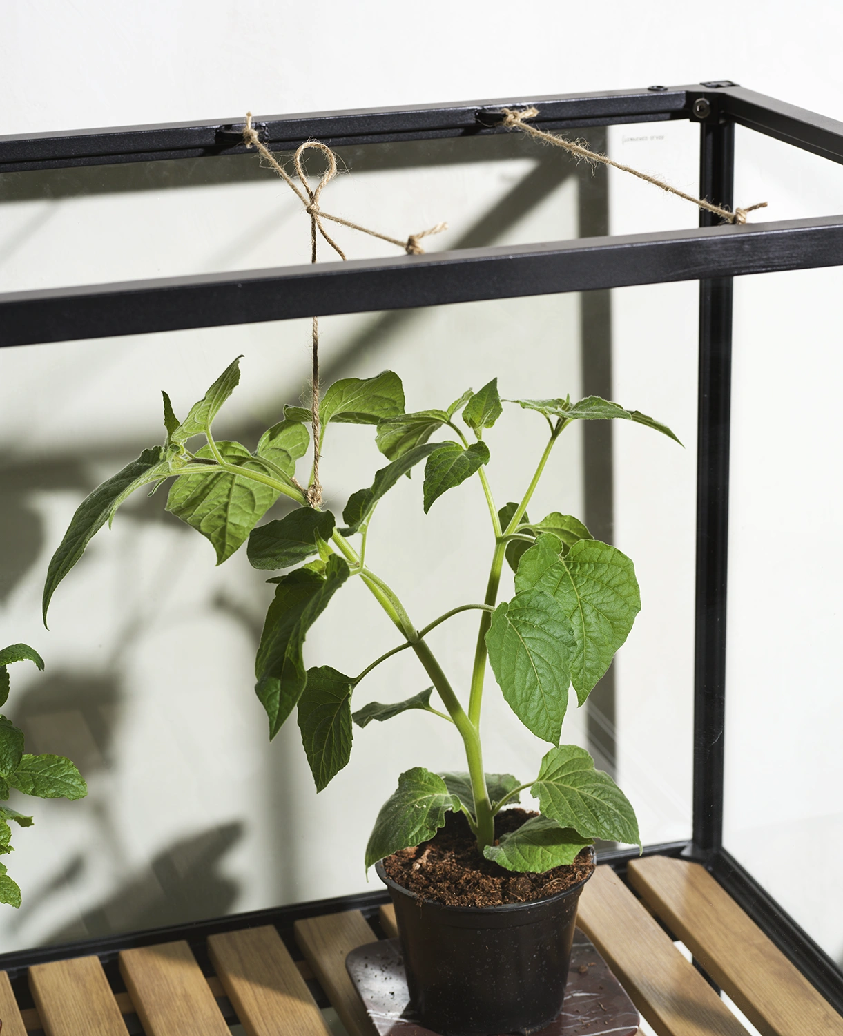 Det avtagbara taket gör det enkelt att ventilera och komma åt växterna, och justerbara fötter ser till att skåpet står stadigt även på ojämna underlag. Klätterringar ingår för att ge stöd åt tomater, gurka eller andra klätterväxter.