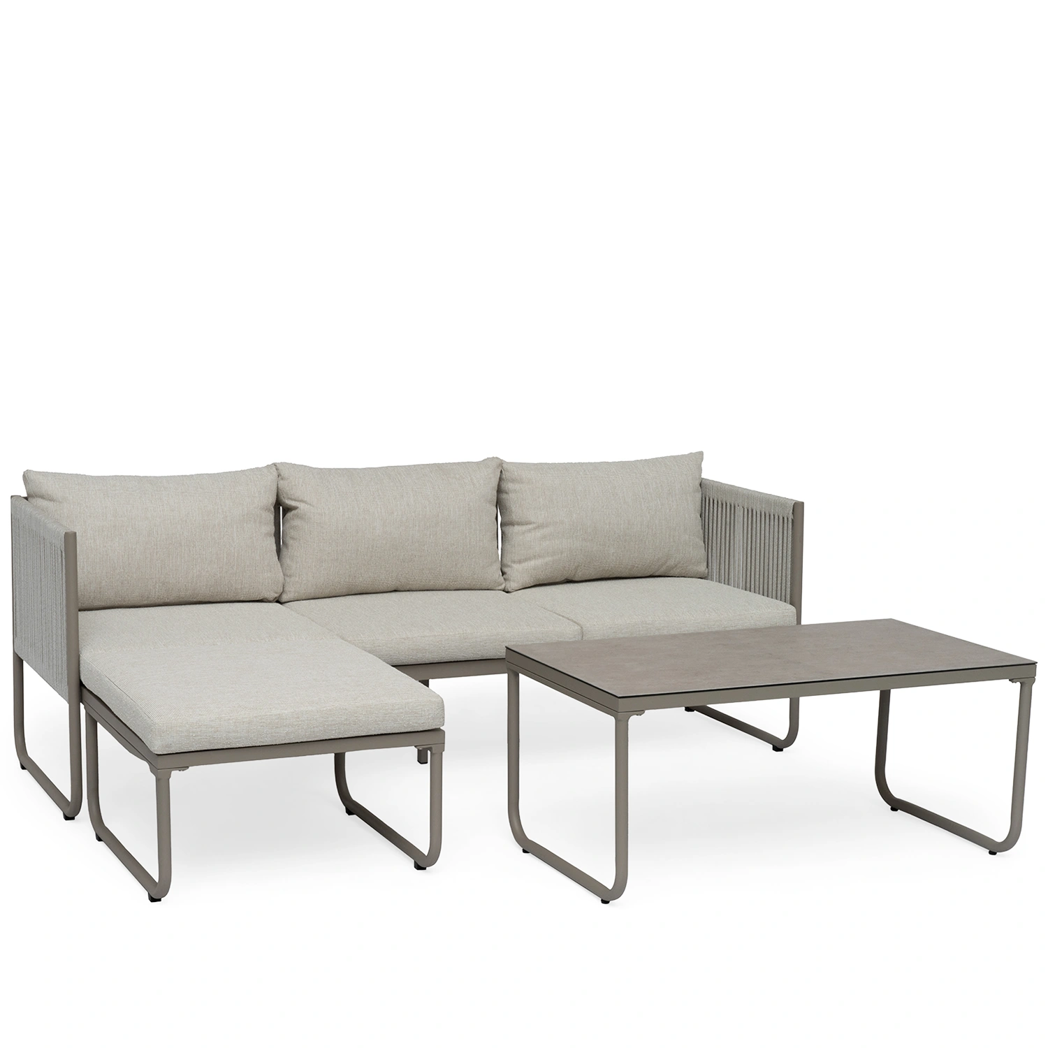 Enkel nätt divansoffgrupp för den mindre uteplatsen. En grupp med något högre höjd på bordet än vanligt vilket gör den både praktisk och funktionell. Komplett set innehållande 3-sitssoffa, divan och soffbord. Tillverkad i aluminium och rep i olefin. Dynor i polyester. Bordsskiva i keramiskt glas.