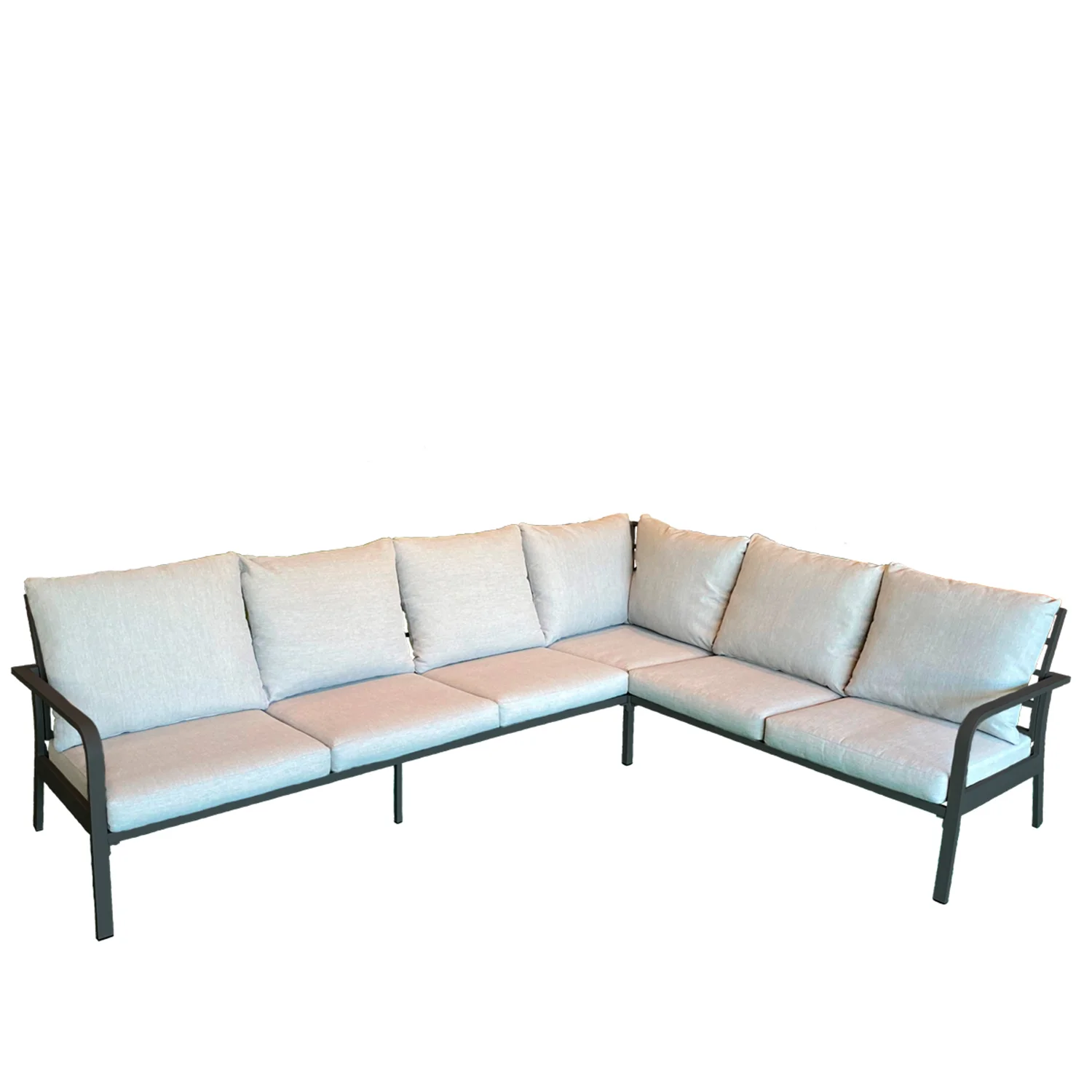 Generös hörnsoffa som med sin lätthet i designen skapar ett stilrent och modernt uttryck. Framtagen för högsta komfort med god sittlutning i sitsen. Hörnsoffan är vändbar så du väljer själv om du vill ha den vänster- eller högerställd. Tillverkad i aluminium med dynor i gråbeige olefin. Avtagbar klädsel, handtvätt 30 grader.