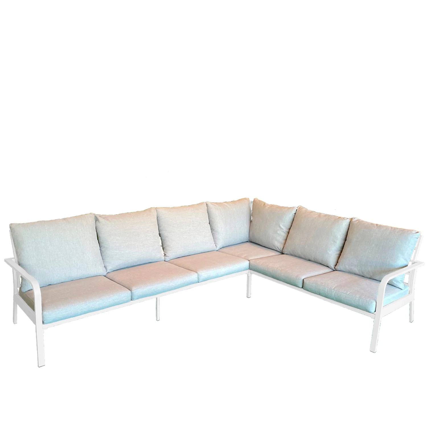 Generös hörnsoffa som med sin lätthet i designen skapar ett stilrent och modernt uttryck. Framtagen för högsta komfort med god sittlutning i sitsen. Hörnsoffan är vändbar så du väljer själv om du vill ha den vänster- eller högerställd. Tillverkad i aluminium med dynor i gråbeige olefin. Avtagbar klädsel, handtvätt 30 grader.