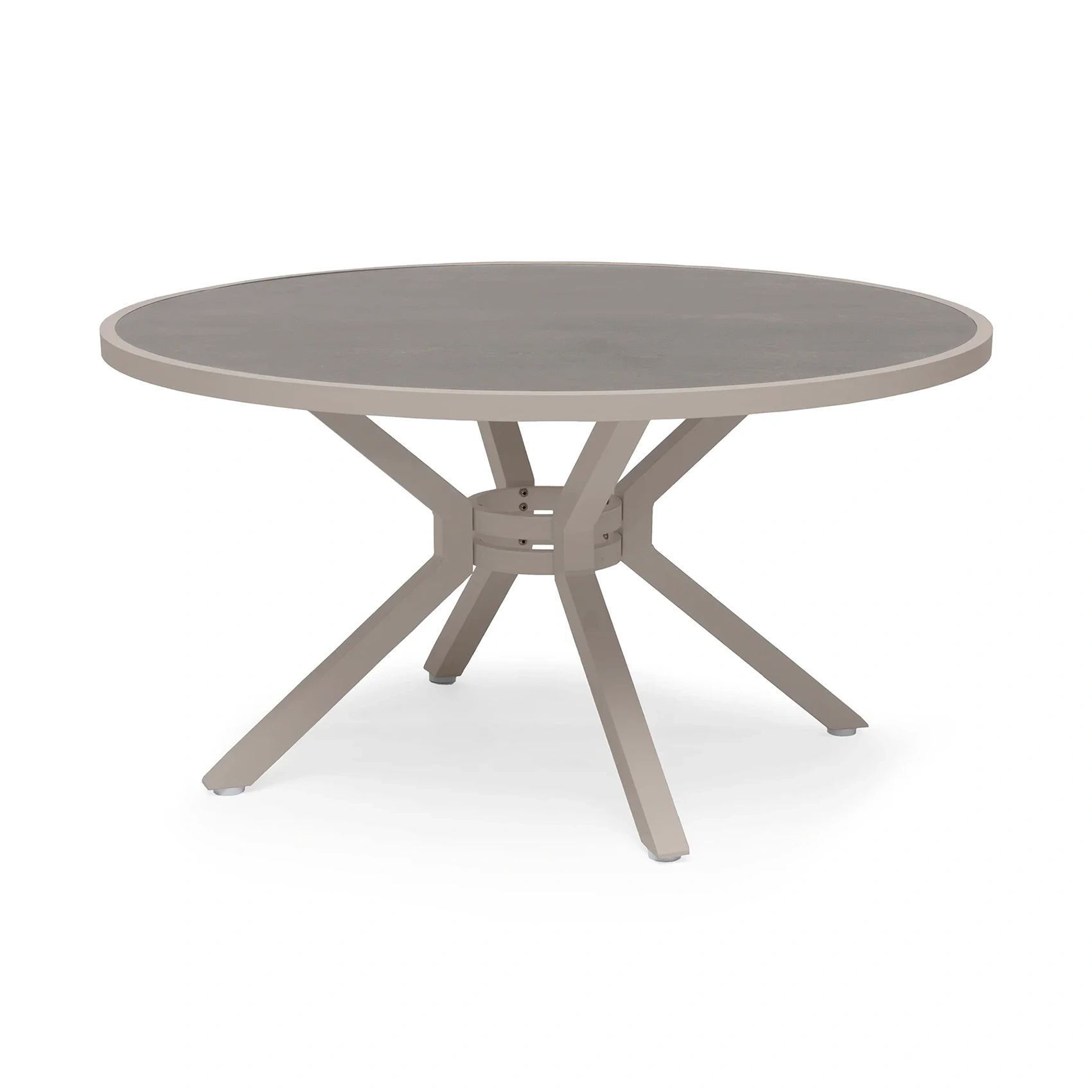 Tillverkad i aluminium med bordsskiva i varmgrå melerad keramisk glas, 5 mm tjock.