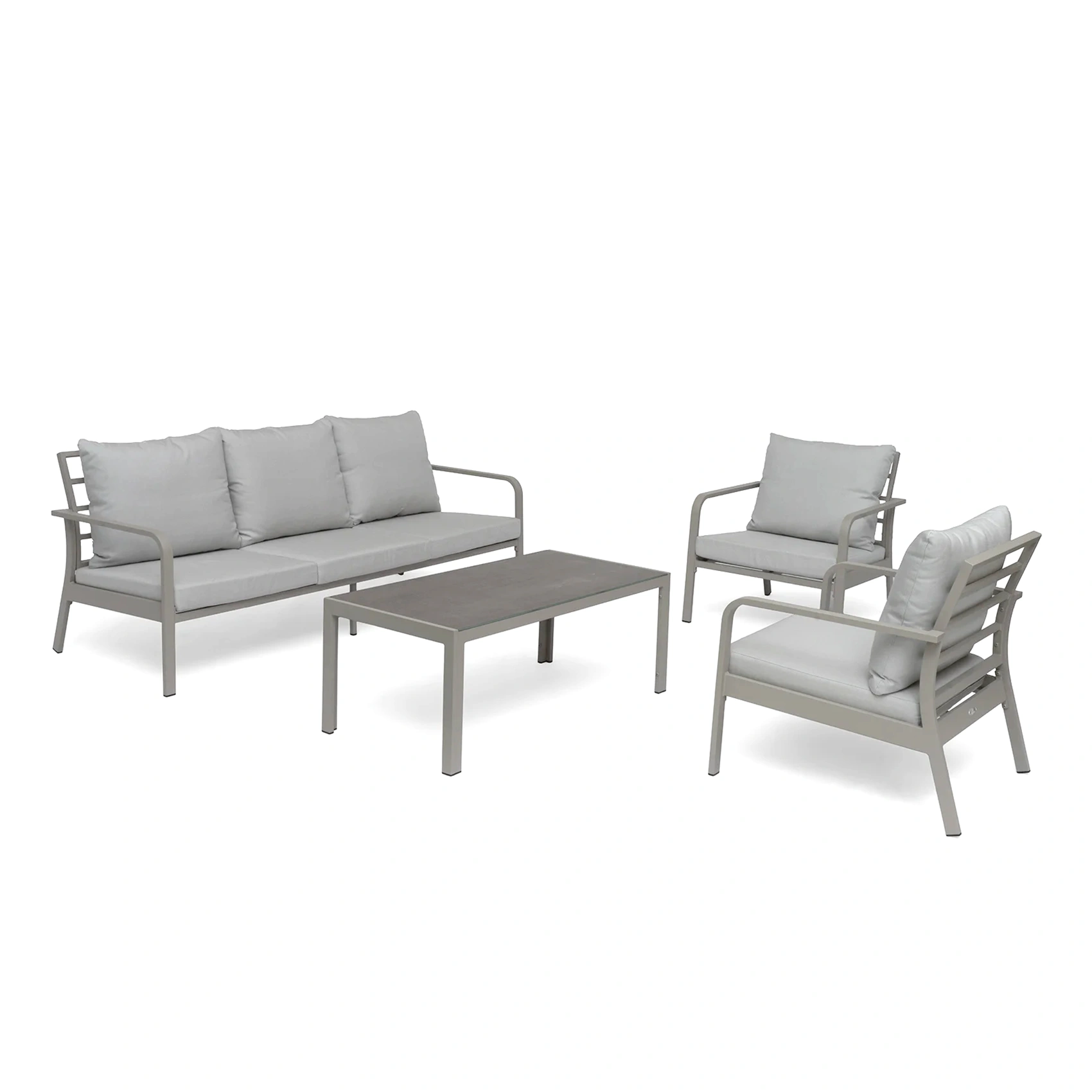Generös soffgrupp som med sin lätthet i designen ger ett stilrent och modernt uttryck. Tillverkad i aluminium med dynor i gråbeige olefin. Dynorna är måttanpassade för respektive komponent.