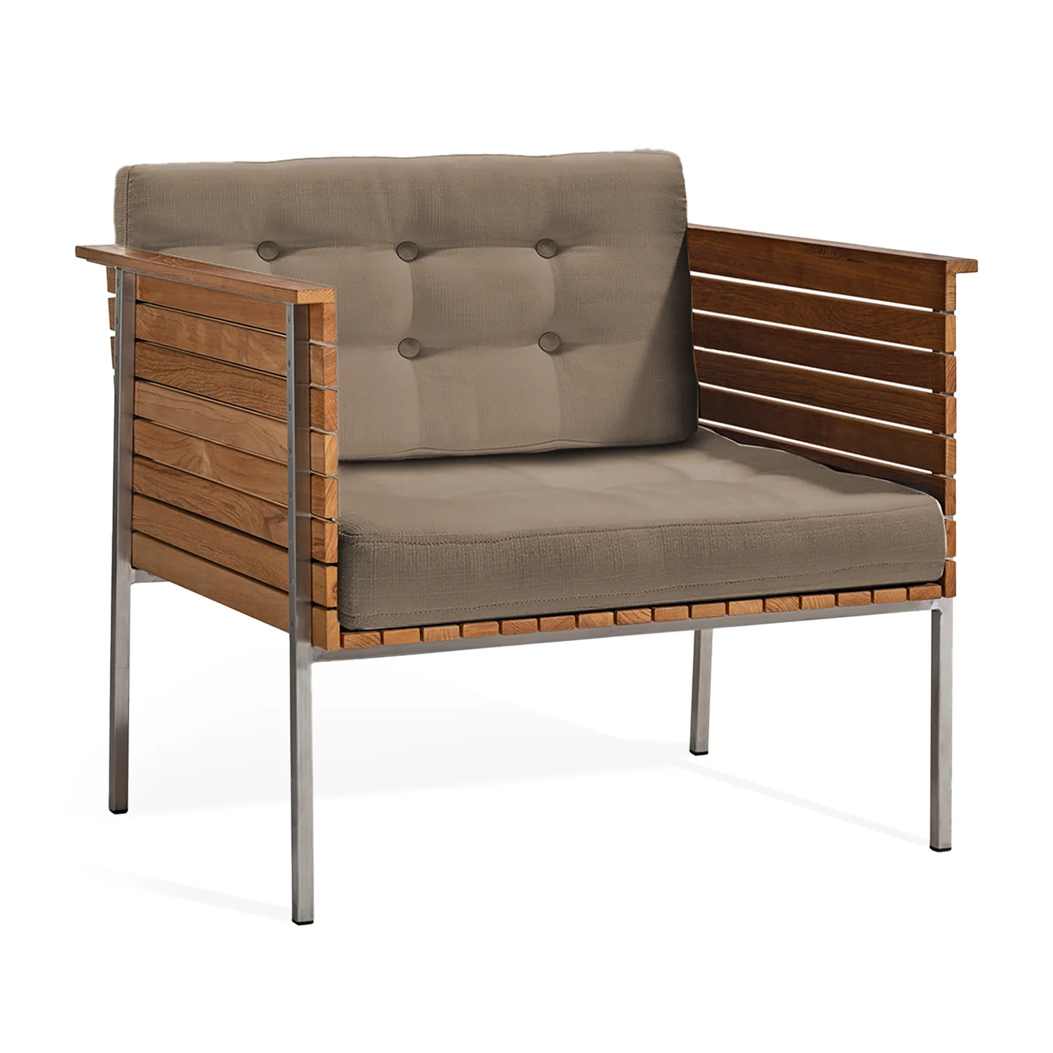Till kampanjenHäringe fåtölj i teak med rostfritt stativ. Dyna i Sunbrellatyg i färgen heather grey.